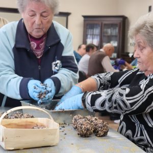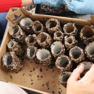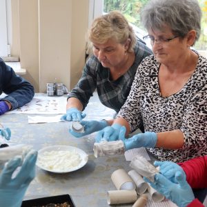 Do przygotowania  karmy użyliśmy tekturowych rolek po papierze toaletowym, które grubo „smarowaliśmy” smalcem, a następnie dokładnie obtaczaliśmy w mieszance nasion, odstawiając gotowe produkty w chłodne miejsce. Po wykonaniu karmy rozwiązywaliśmy zagadki o ptakach, wysłuchaliśmy wielu ciekawostek na temat tego, jak mądrze dokarmiać ptaki i w jakim okresie, czym nie należy ich karmić, żeby im nie zaszkodzić i gdzie najlepiej umieścić pokarm, żeby uchronić je przed drapieżnikami. Poza tym uczestnicy czytali wiersze związane z tematyką dzisiejszych zajęć.
