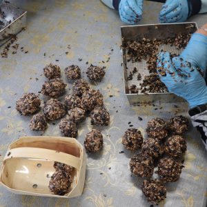 Refleksja po zjedzeniu słonecznika nastała bardzo szybko i w ramach rekompensaty zakupiliśmy nowe ziarna słonecznika, owsa, pestek dyni oraz siemienia lnianego i z tych produktów wykonaliśmy karmę dla ptaków.