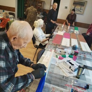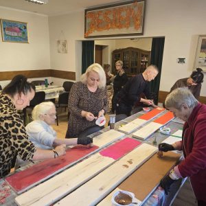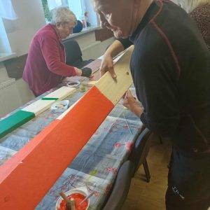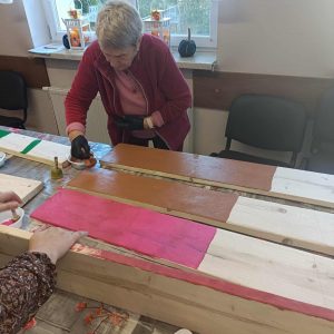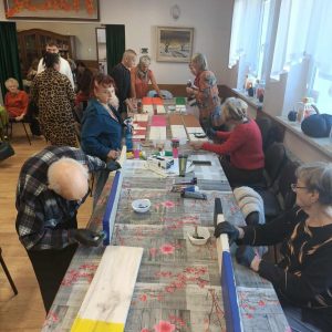 Praca wymagała nie tylko wyobraźni, ale też cierpliwości i dokładności – jedni malowali barwne czapeczki, inni dodawali apaszki z kolorowego materiału. W sali panowała serdeczna atmosfera, uczestnicy pomagali sobie nawzajem i dzielili się pomysłami.