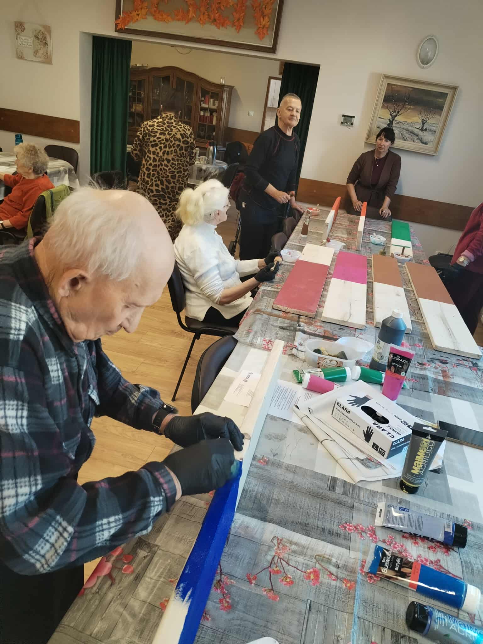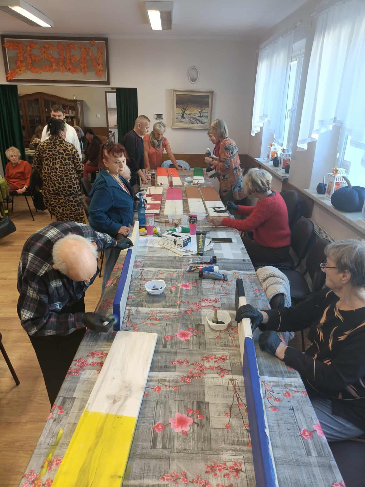 Praca wymagała nie tylko wyobraźni, ale też cierpliwości i dokładności – jedni malowali barwne czapeczki, inni dodawali apaszki z kolorowego materiału. W sali panowała serdeczna atmosfera, uczestnicy pomagali sobie nawzajem i dzielili się pomysłami.