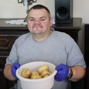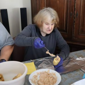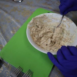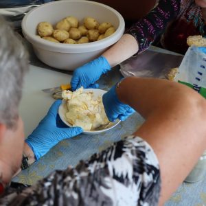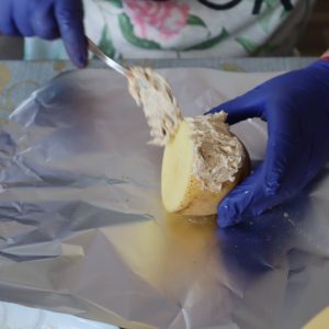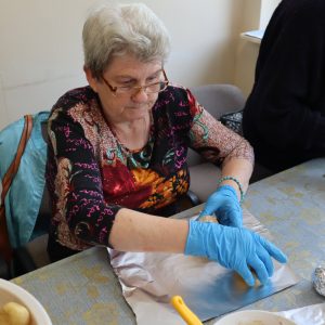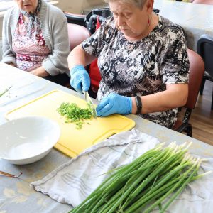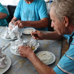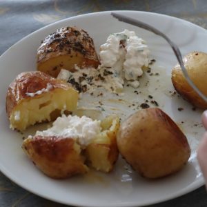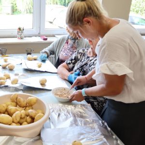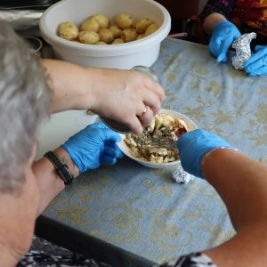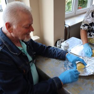 Podczas wspólnych zajęć przygotowaliśmy na obiad pyry z gzikiem, jednak w nieco zmodyfikowanej przez nas wersji. Ziemniaki w mundurkach upiekliśmy z ziołowym masełkiem, zamiast ugotować je tradycyjnie w wodzie. Dodatkiem do ziemniaków był tzw. gzik czyli sos ze śmietany, twarogu, cebuli oraz zieleniny, doprawiony solą i pieprzem. Ta prosta potrawa podbiła podniebienia naszych uczestników, a przepis na jej przygotowanie „rozszedł” się jak świeże bułeczki.