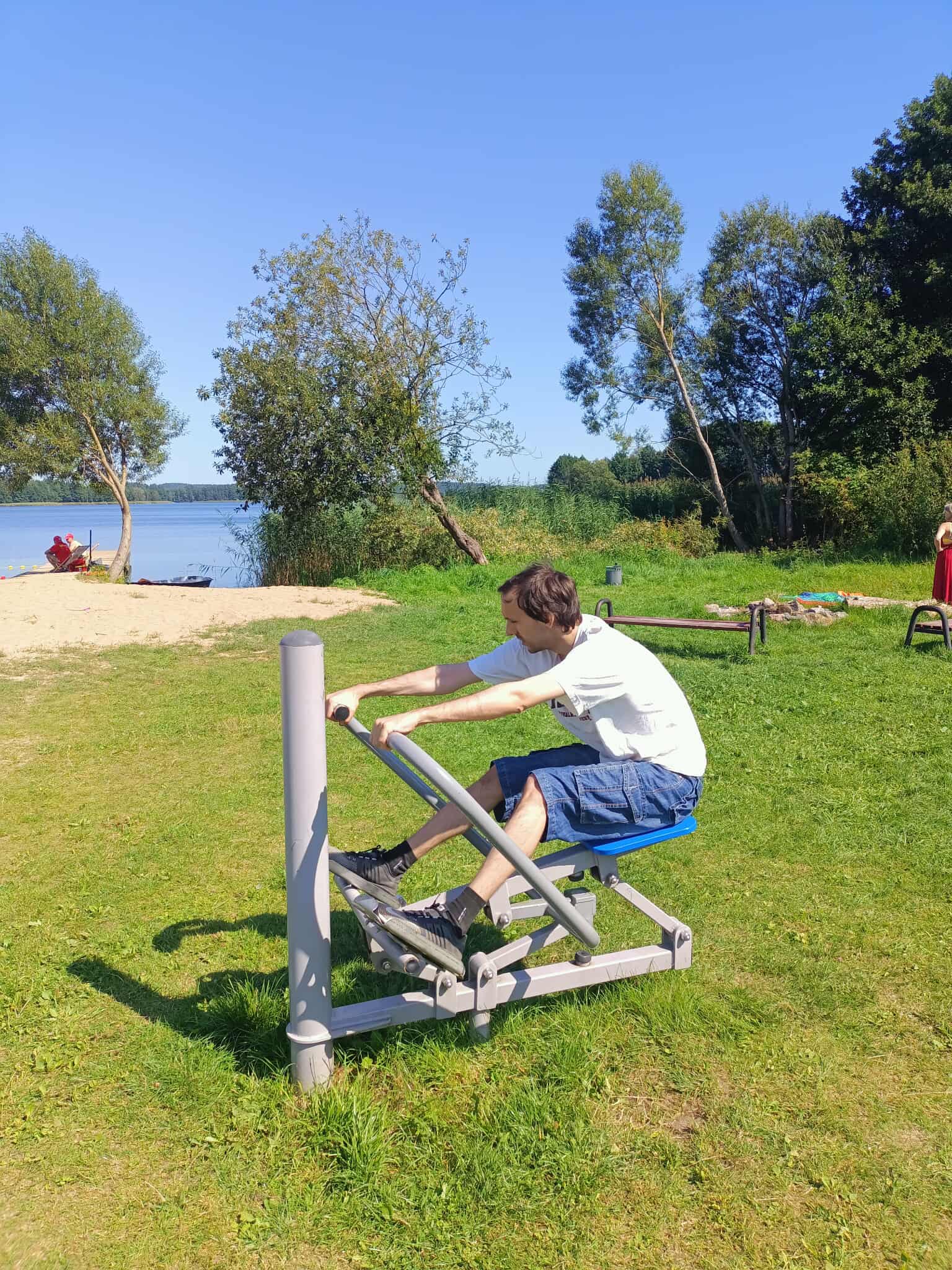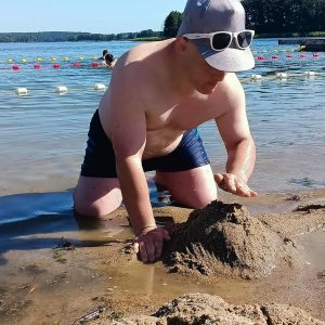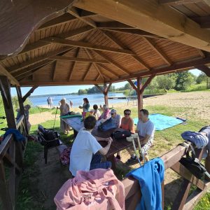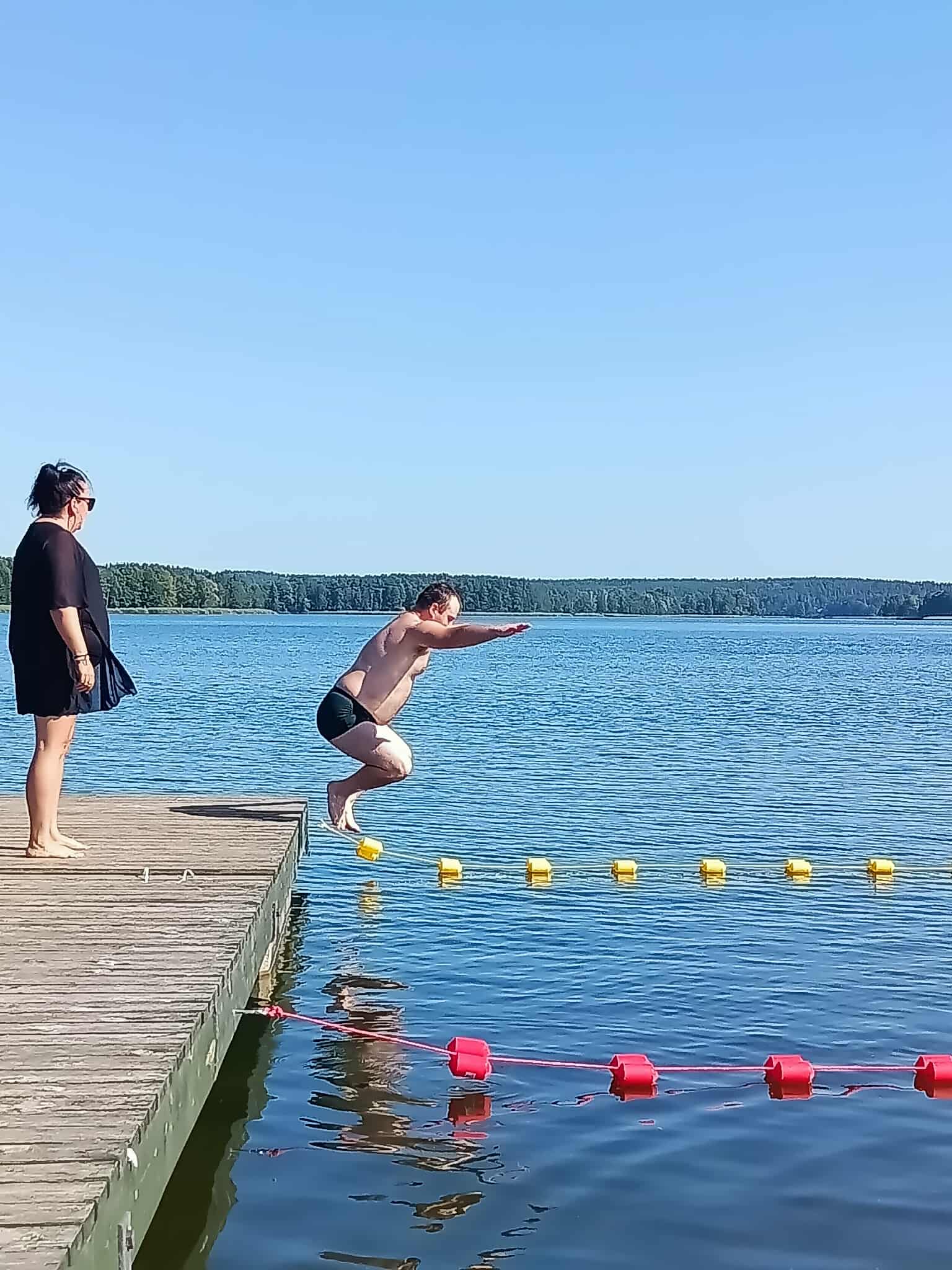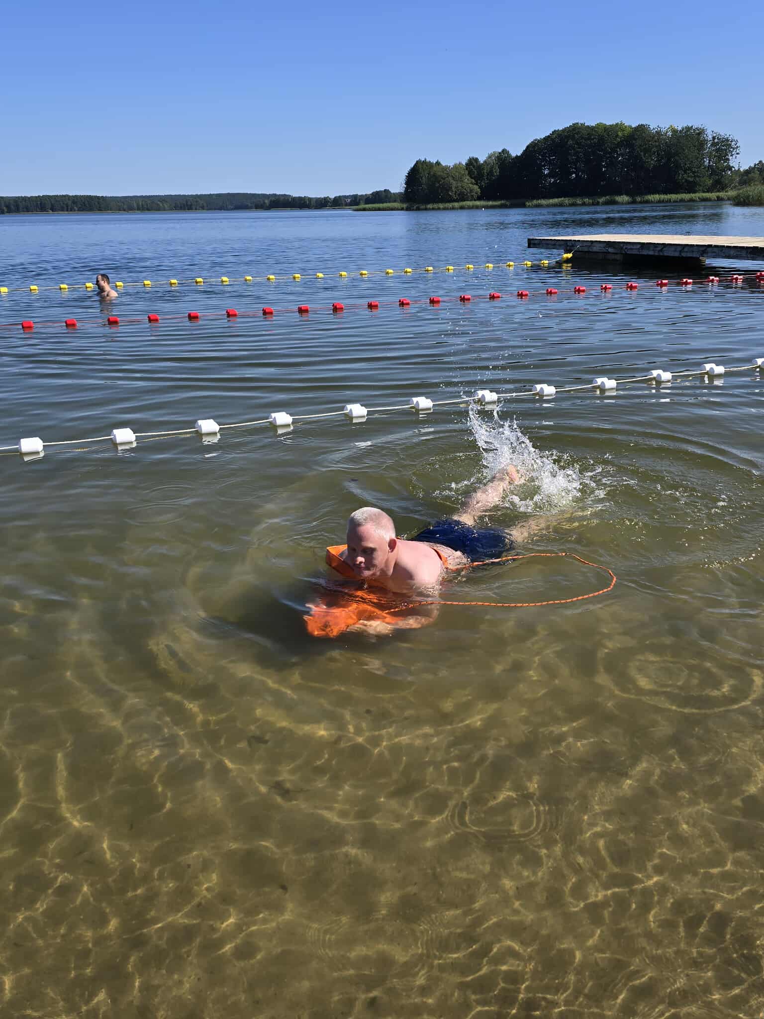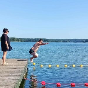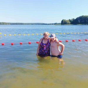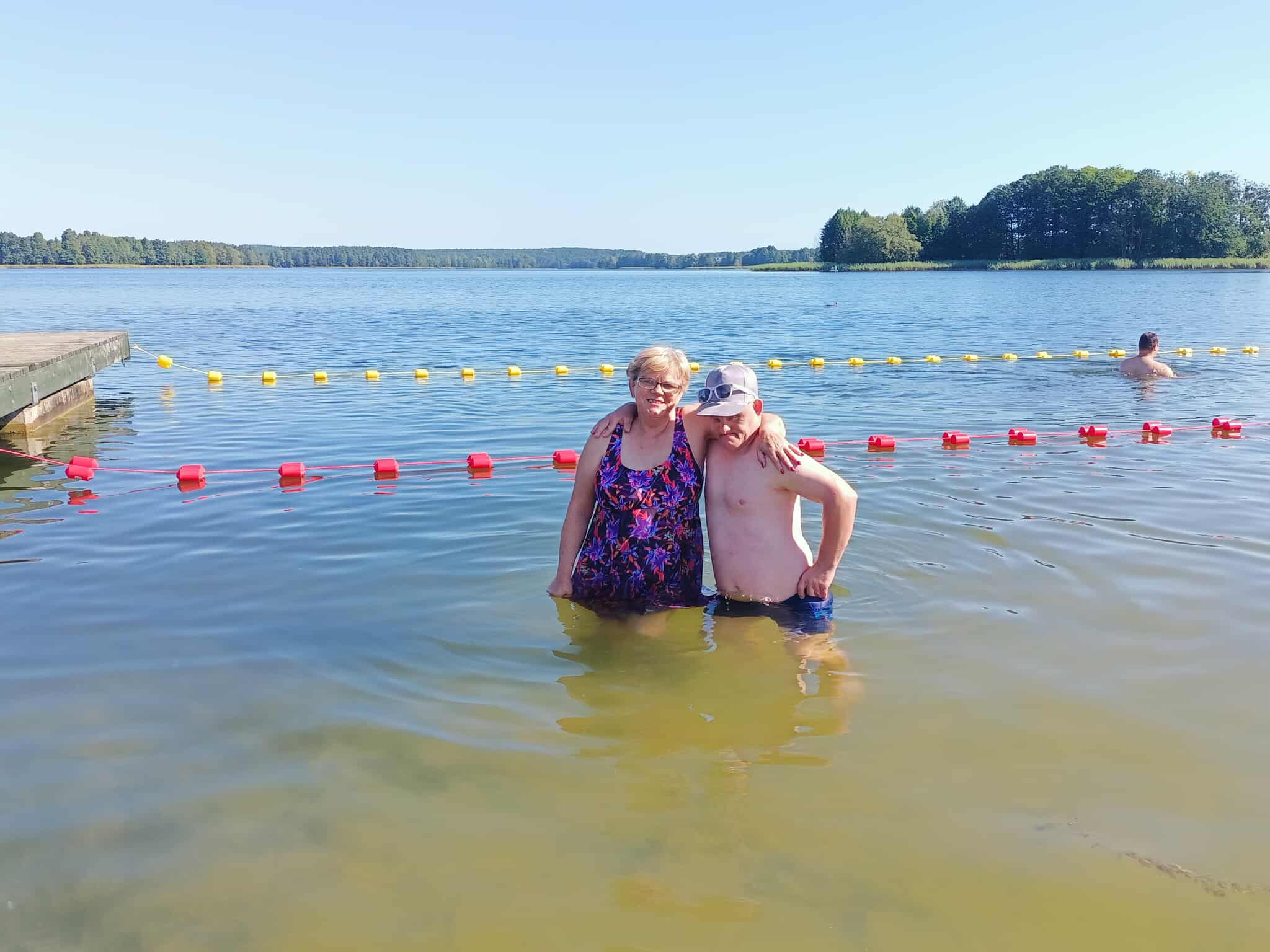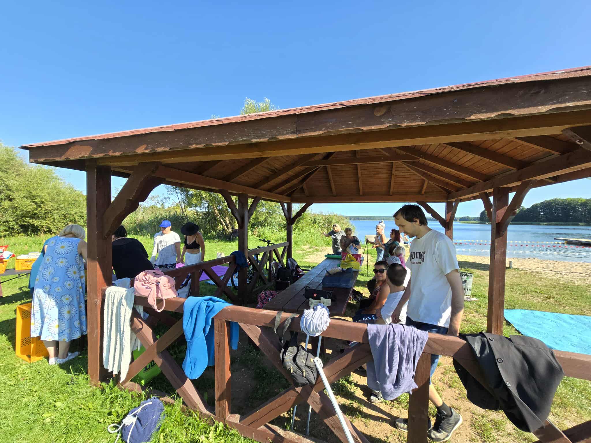 Z okazji Dnia ręcznika plażowego- wybraliśmy się z naszymi uczestnikami się nad jezioro Kalwa, gdzie pod opieką ratownika, bezpiecznie oddawaliśmy się indywidualnym przyjemnościom. Jedni szukali ochłody w przyjemnie orzeźwiającej wodzie, inni spacerowali po piaszczystej plaży czy odpoczywali na pomoście zażywając kąpieli słonecznej. Grupka biesiadowała w urokliwej altanie gdzie popijając aromatyczną kawę w towarzystwie domowych wypieków, skupiali się na grach planszowych czy towarzyskich rozmowach. Jeszcze inni- bardziej aktywni- grali w siatkówkę plażową i ćwiczyli na stojącej nieopodal zewnętrznej siłowni.