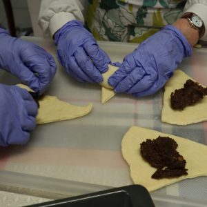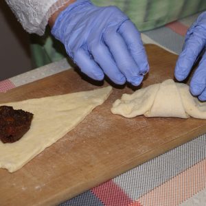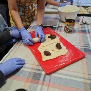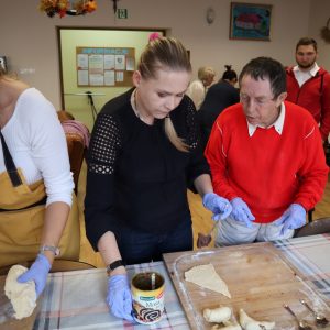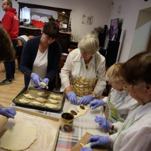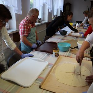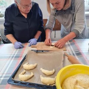 Spotkaliśmy się na wspólnym robieniu rogali świętomarcińskich. Każdy etap został dokładnie wykonany przez uczestników, począwszy od robienia zaczynu i zagniecenia ciasta, po wałkowanie i formowanie rogali. Ile było osób tyle technik zawijania rogali. Uczestnicy nie żałowali maku tak, że niektóre rogale były ogromniaste. Wspólne robienie rogali przyniosło dużo frajdy, a także lekcji, bo niektórzy robili je po raz pierwszy w swoim życiu. Jaka to była radość z każdego uformowanego rogala. Najfajniejszym elementem tego dnia było oczywiście skosztowanie tych pięknych smakołyków. Uczestnicy zajadali się pysznymi rogalami polanymi lukrem i posypanymi skarmelizowaną pomarańczową skórką.