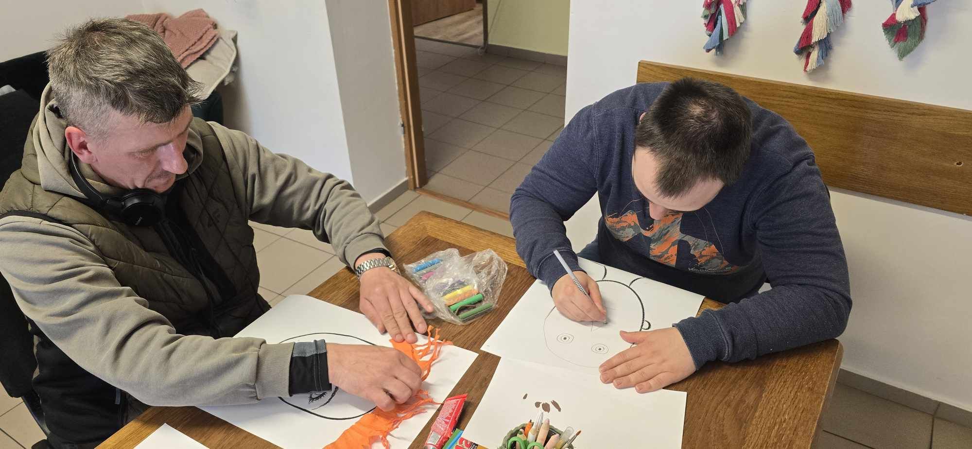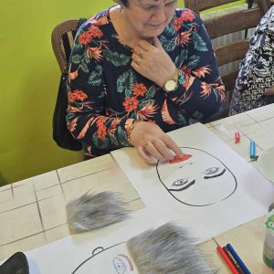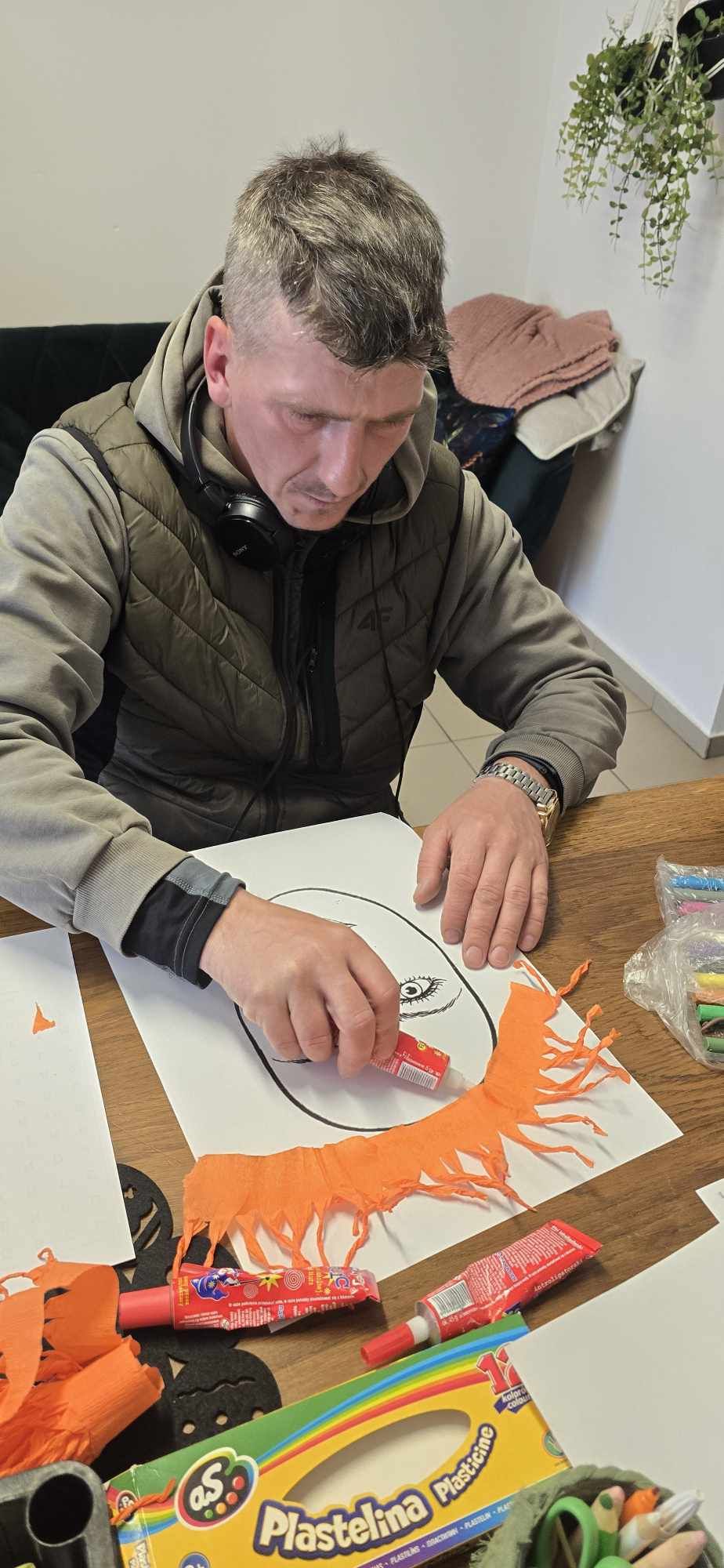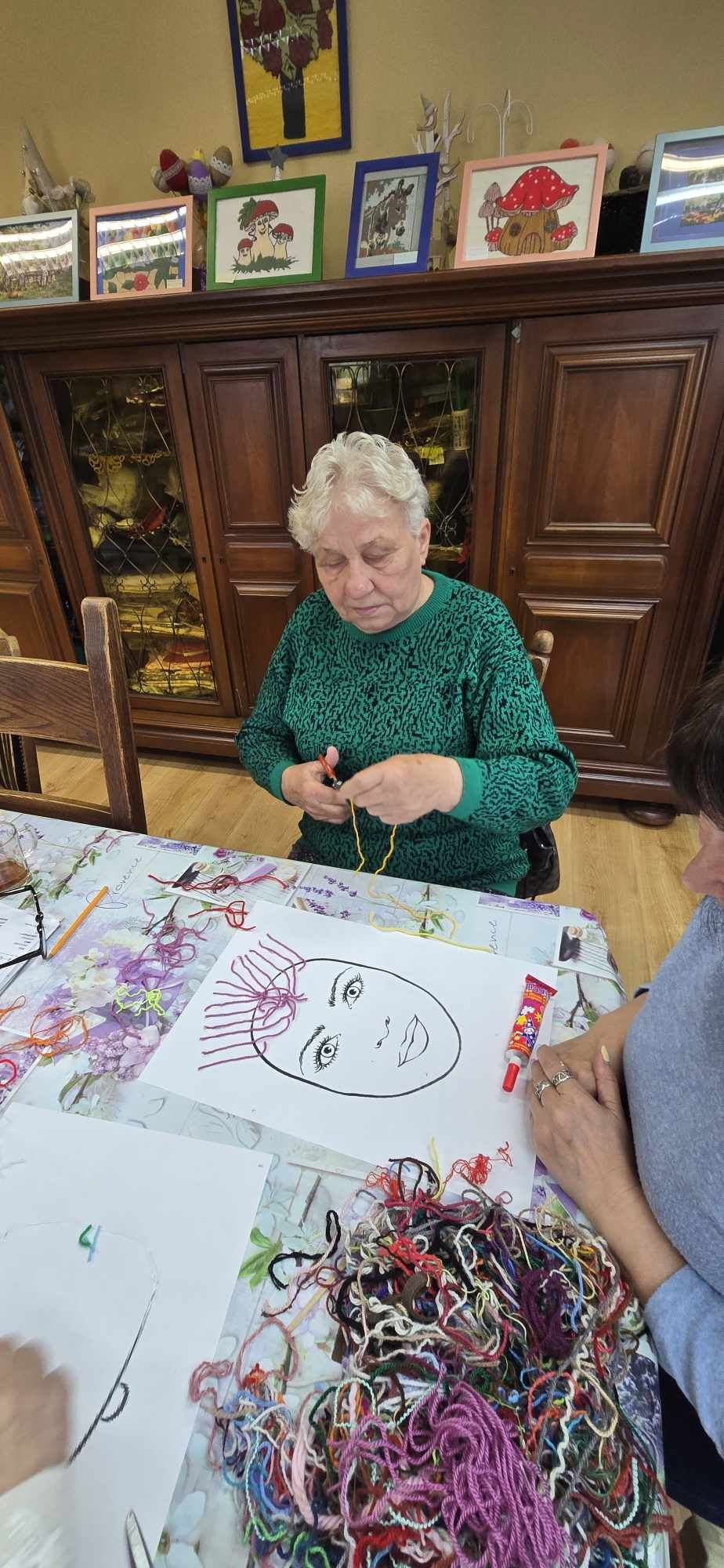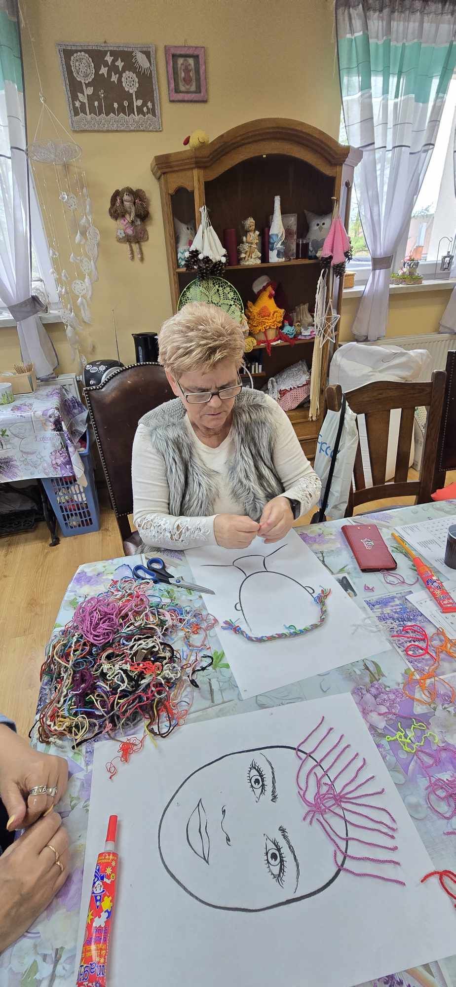 Na dzisiejszych zajęciach uczestnicy otrzymali rożnego rodzaju materiały, z których wykonywali fryzury na szablonach twarzy. Technika i pomysłowość uczestników w wykonaniu swoich prac zrobiły na terapeutach duże wrażenie. Począwszy od rysowania kredkami, wyklejania plasteliną, bibułą, po wyklejanie sznurkami, czy włóczką.