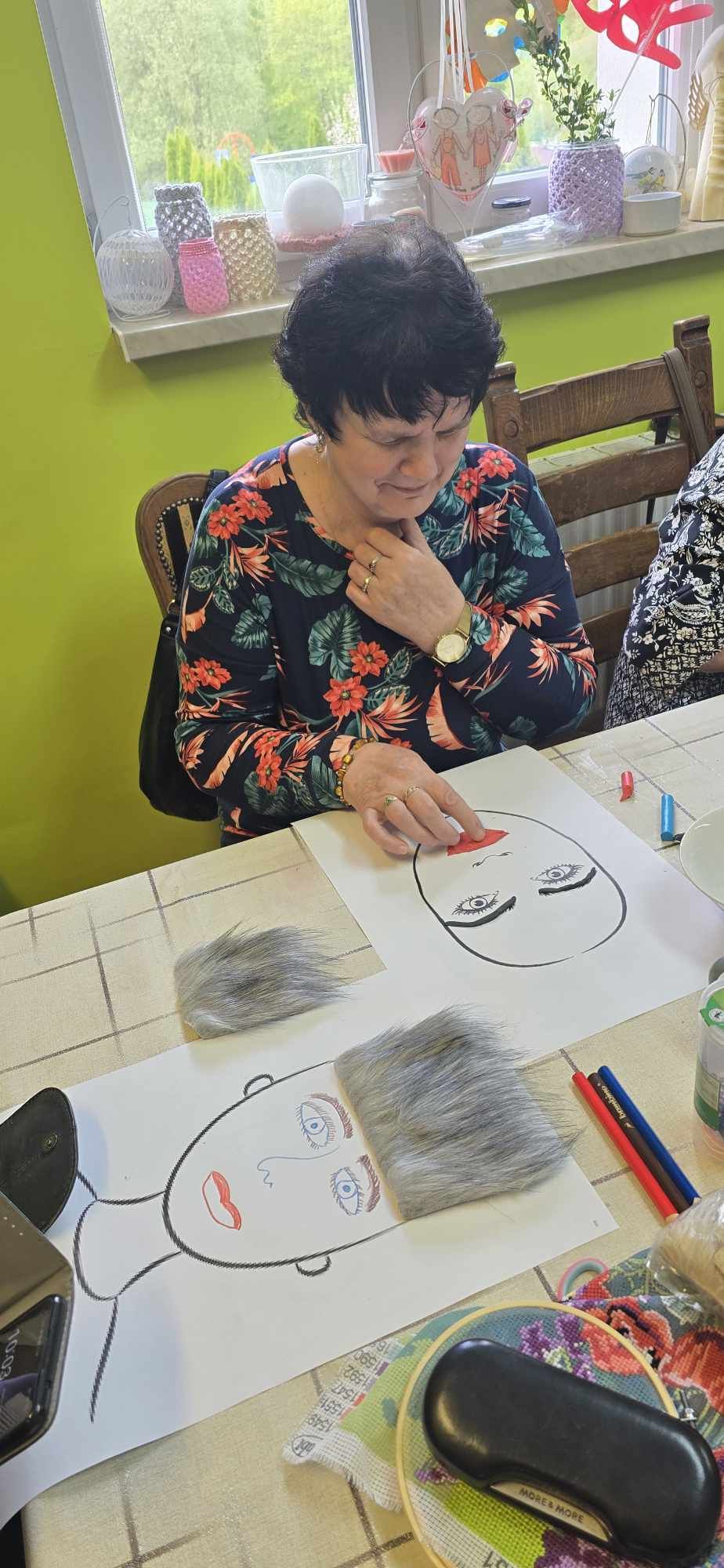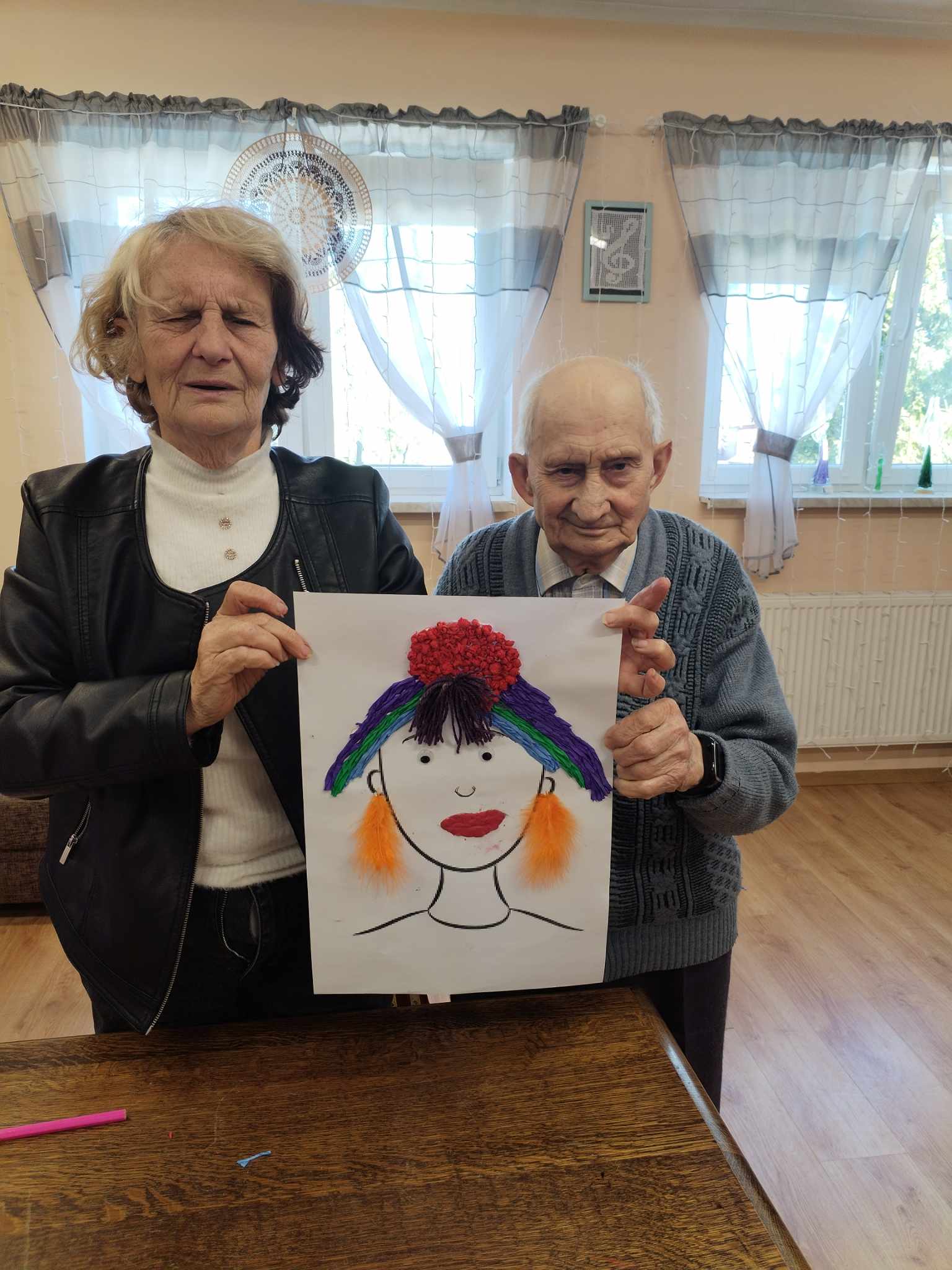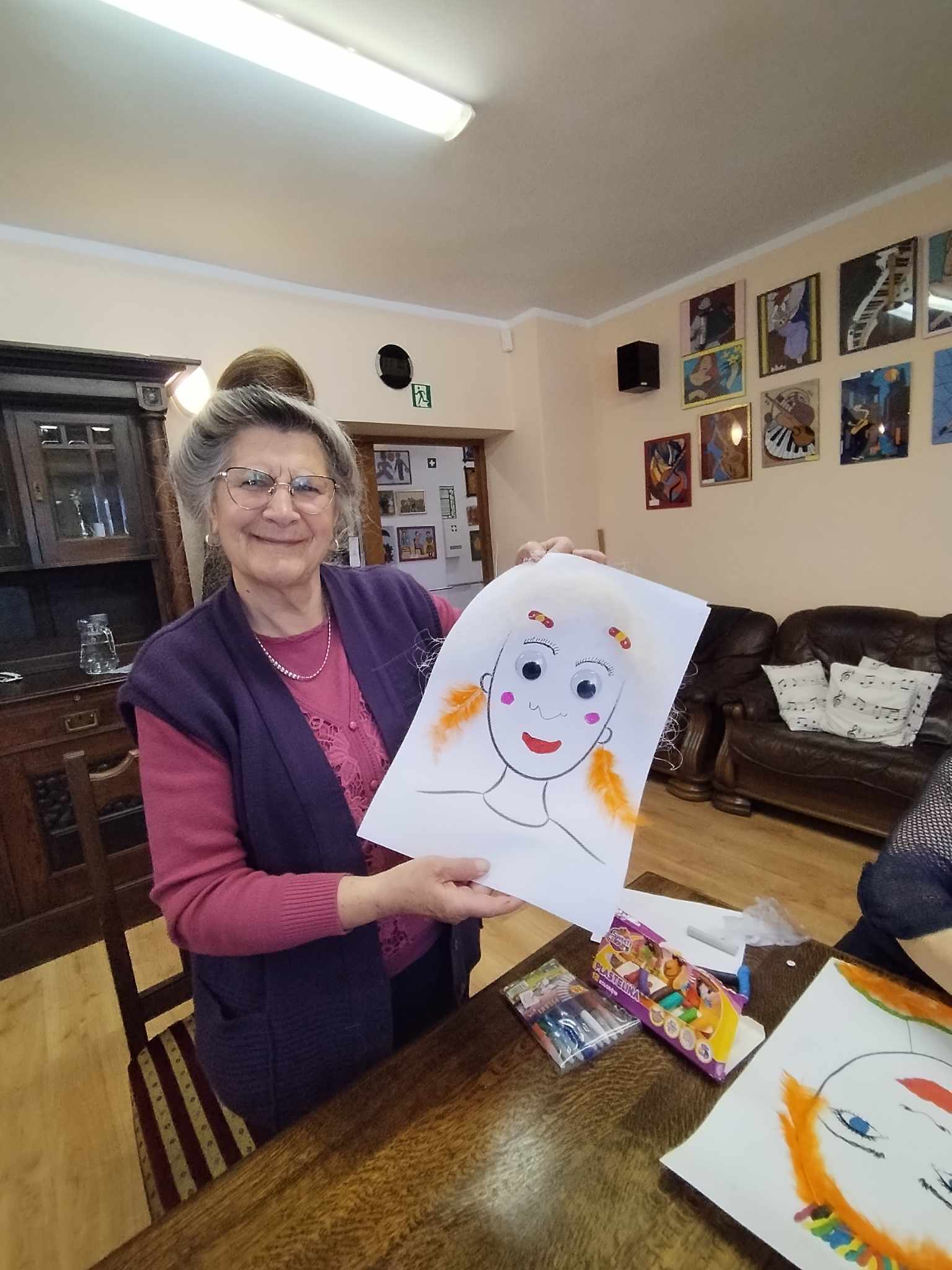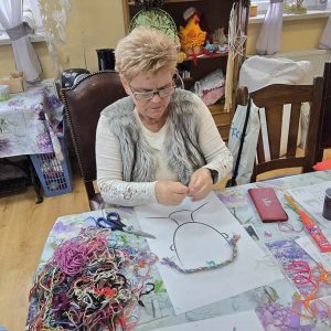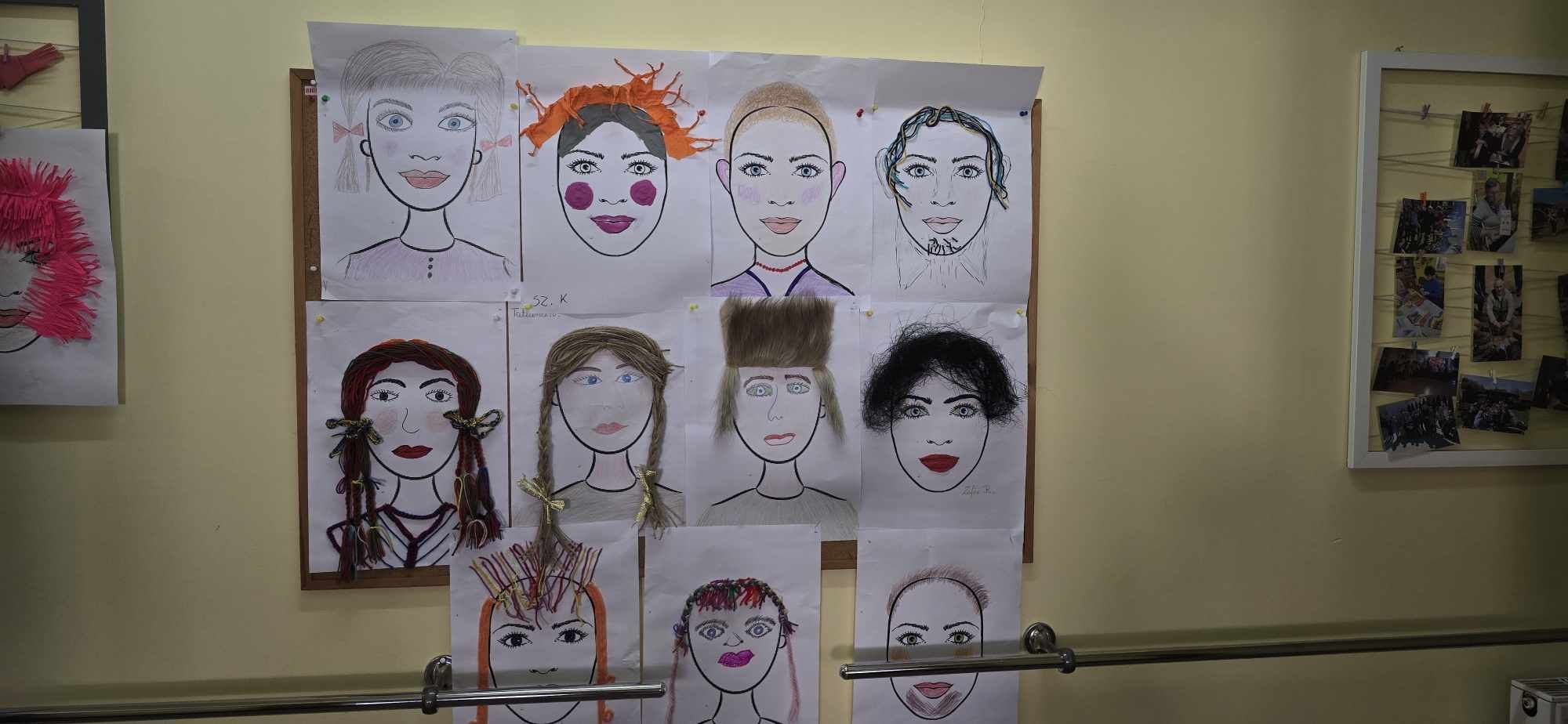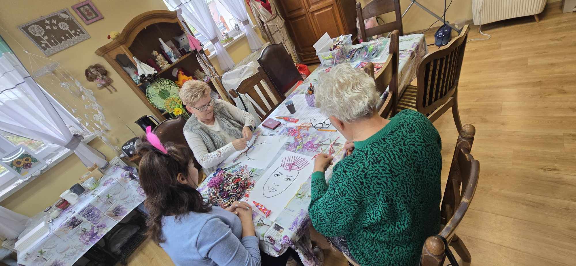 Na dzisiejszych zajęciach uczestnicy otrzymali rożnego rodzaju materiały, z których wykonywali fryzury na szablonach twarzy. Technika i pomysłowość uczestników w wykonaniu swoich prac zrobiły na terapeutach duże wrażenie. Począwszy od rysowania kredkami, wyklejania plasteliną, bibułą, po wyklejanie sznurkami, czy włóczką.