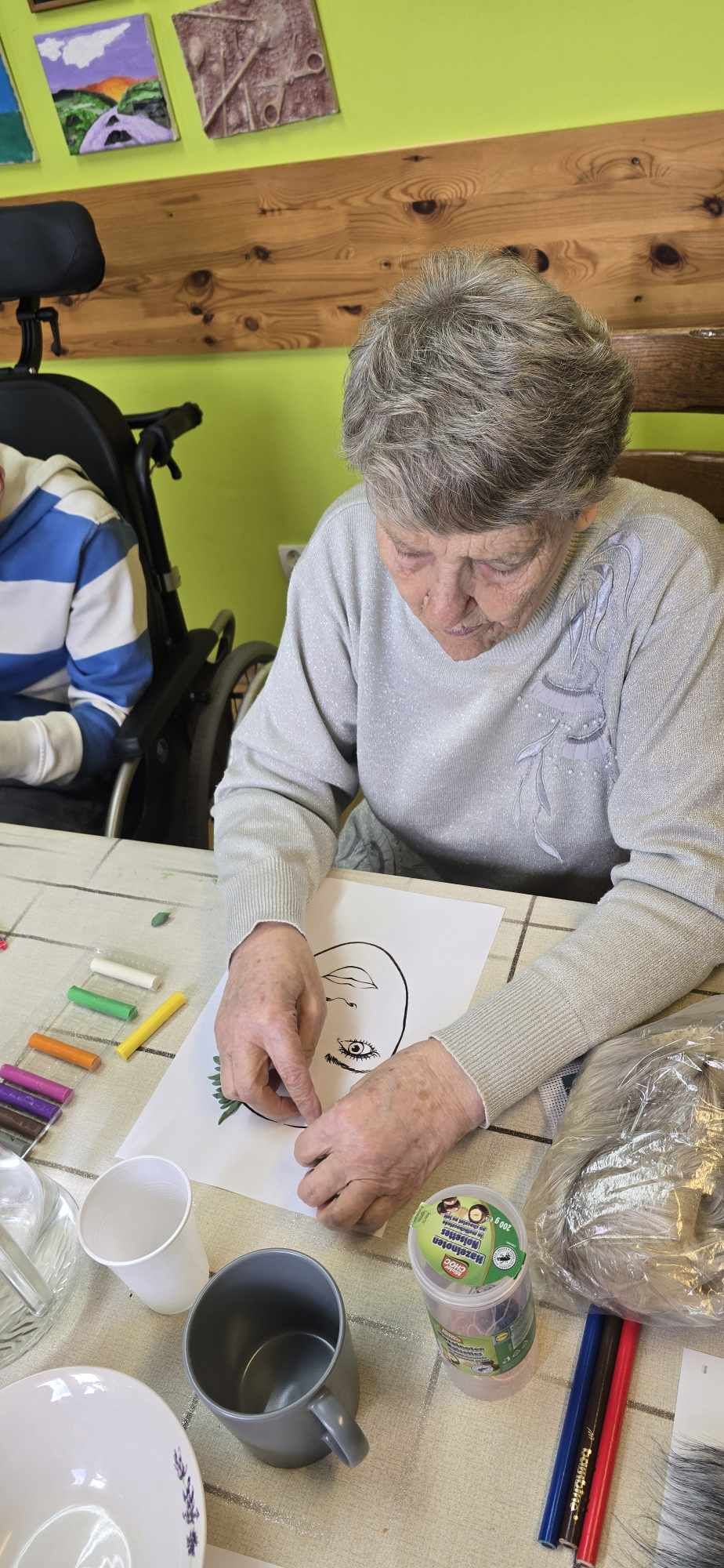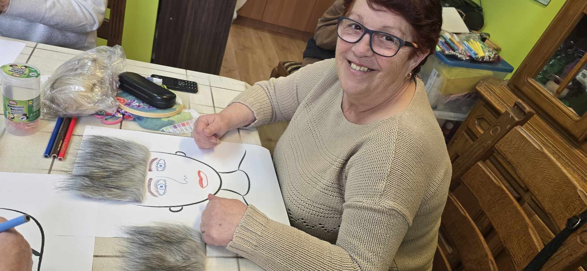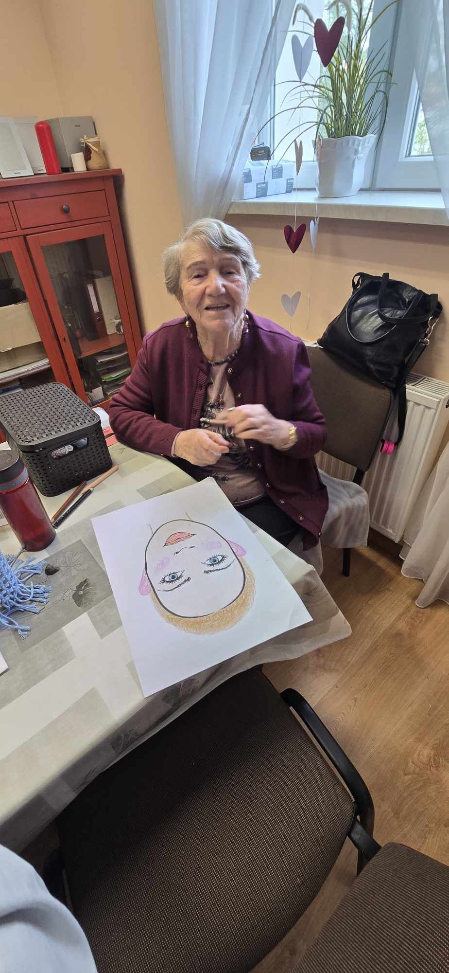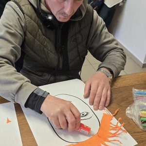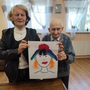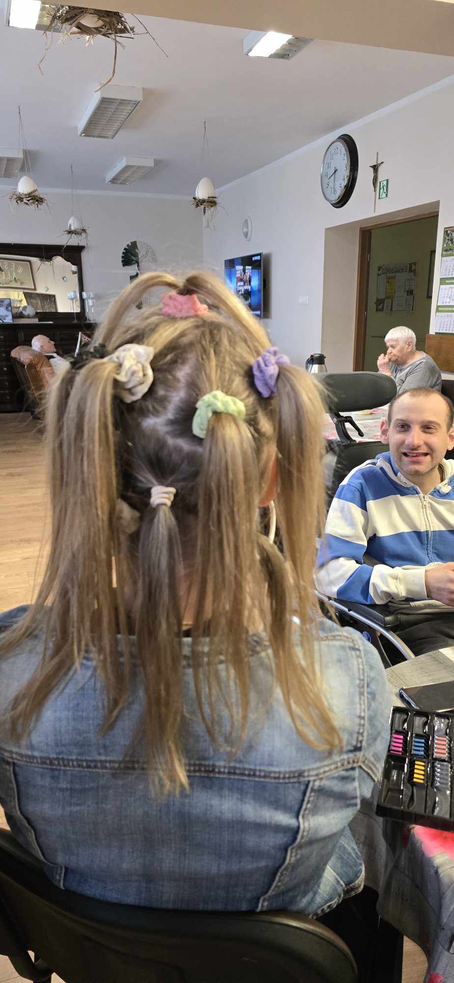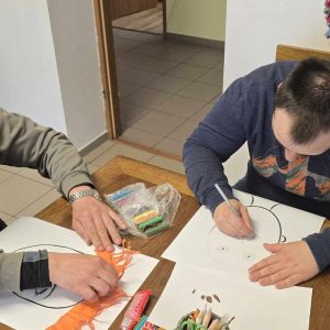 Na dzisiejszych zajęciach uczestnicy otrzymali rożnego rodzaju materiały, z których wykonywali fryzury na szablonach twarzy. Technika i pomysłowość uczestników w wykonaniu swoich prac zrobiły na terapeutach duże wrażenie. Począwszy od rysowania kredkami, wyklejania plasteliną, bibułą, po wyklejanie sznurkami, czy włóczką.