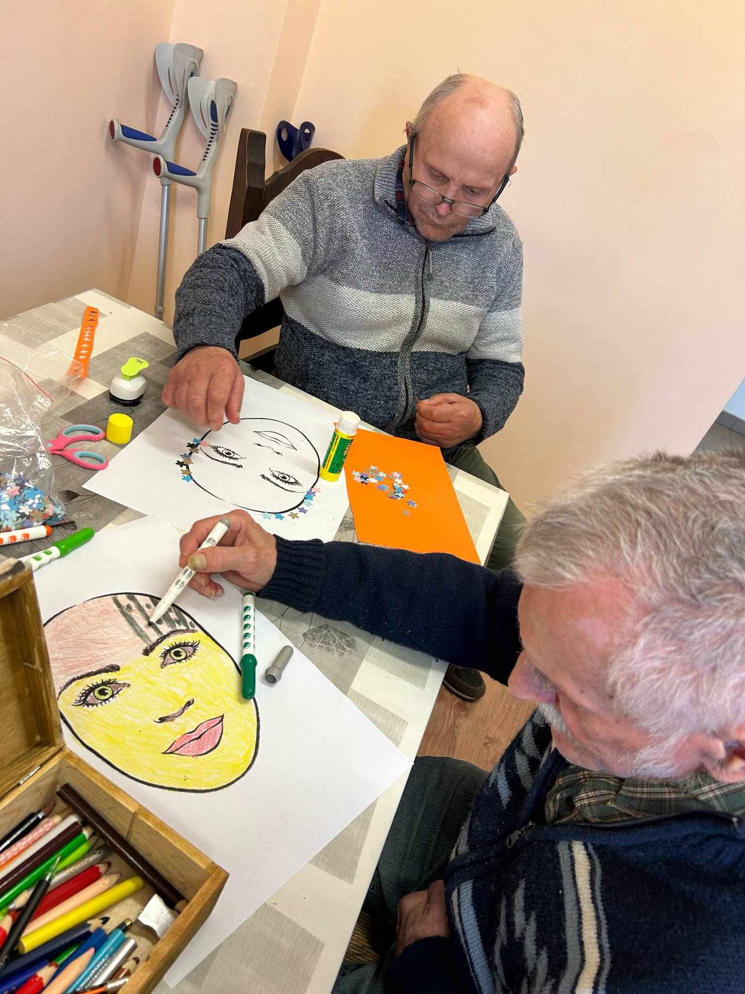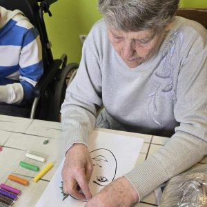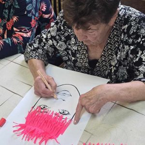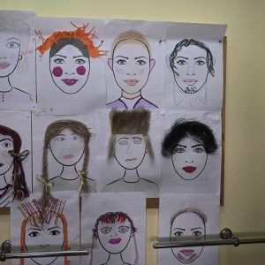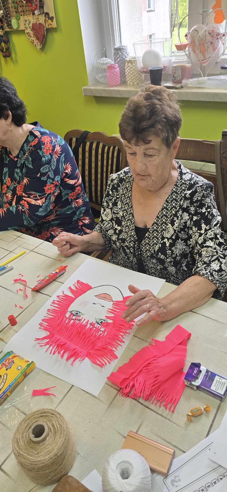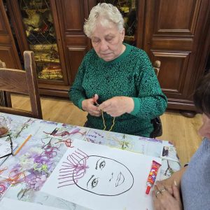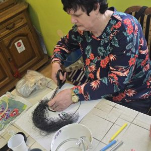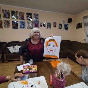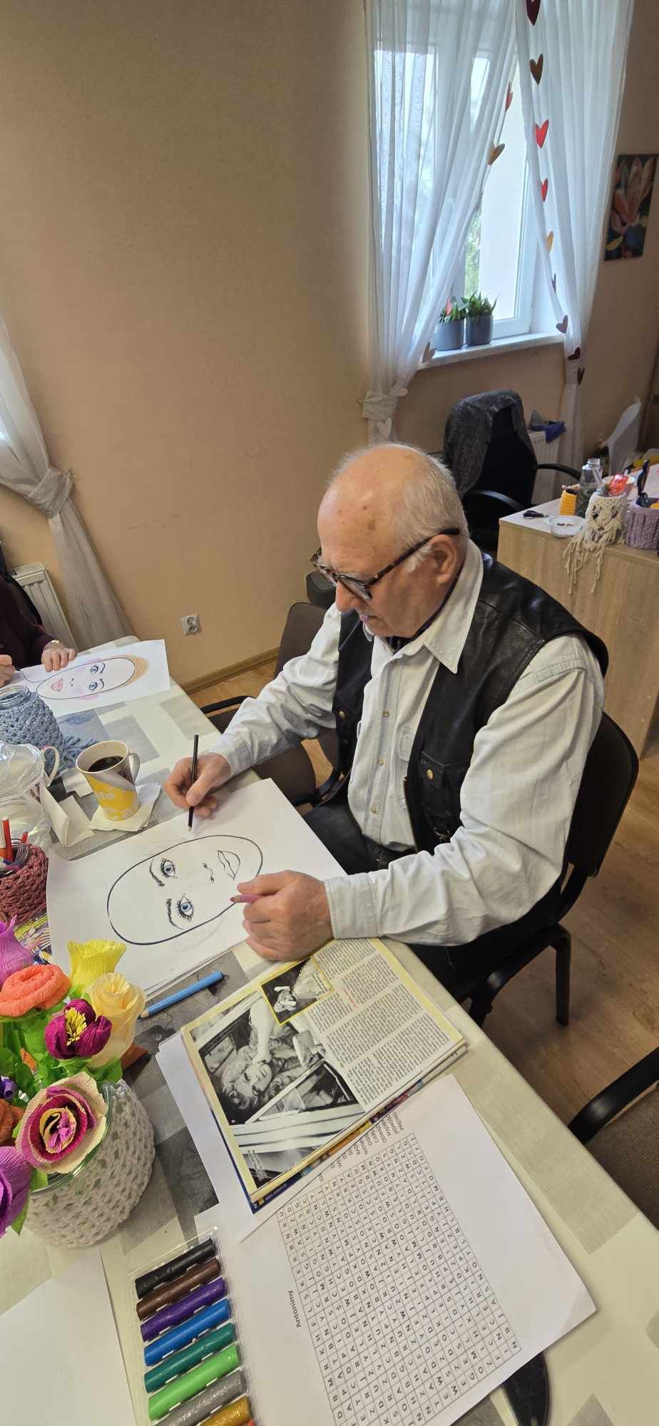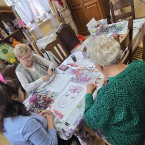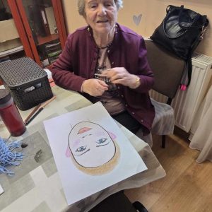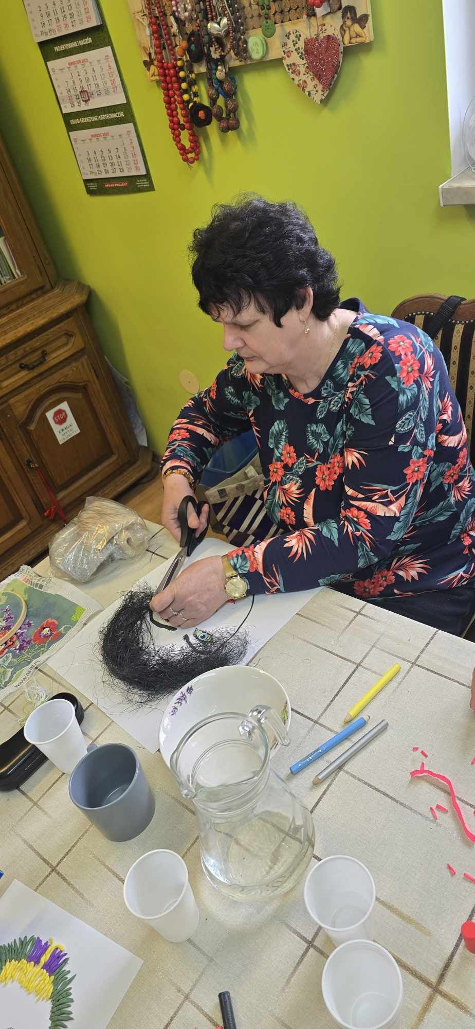 Na dzisiejszych zajęciach uczestnicy otrzymali rożnego rodzaju materiały, z których wykonywali fryzury na szablonach twarzy. Technika i pomysłowość uczestników w wykonaniu swoich prac zrobiły na terapeutach duże wrażenie. Począwszy od rysowania kredkami, wyklejania plasteliną, bibułą, po wyklejanie sznurkami, czy włóczką.