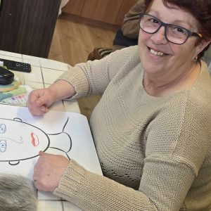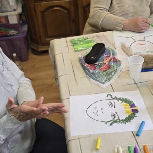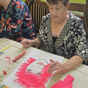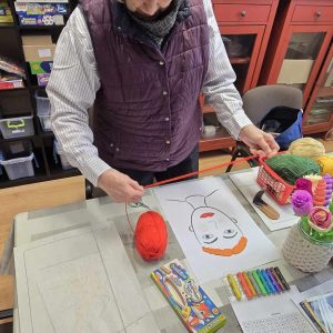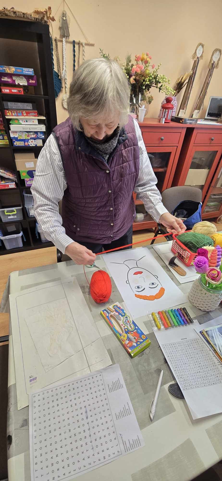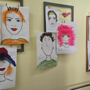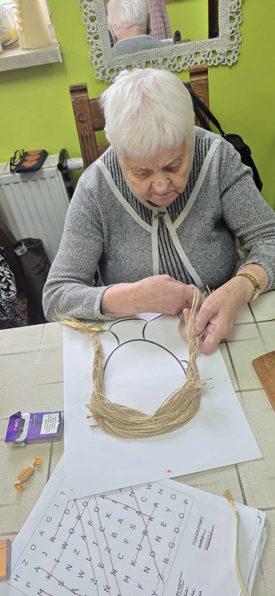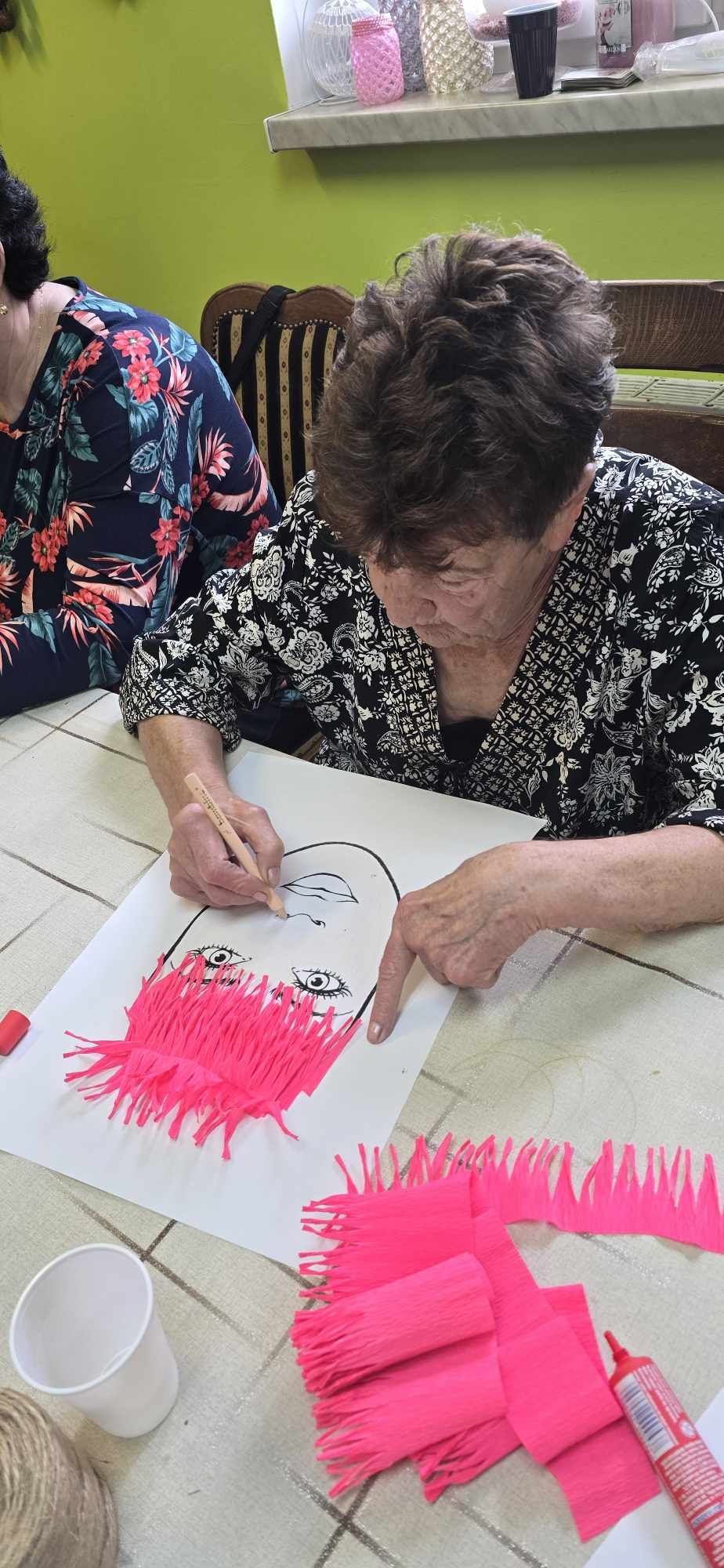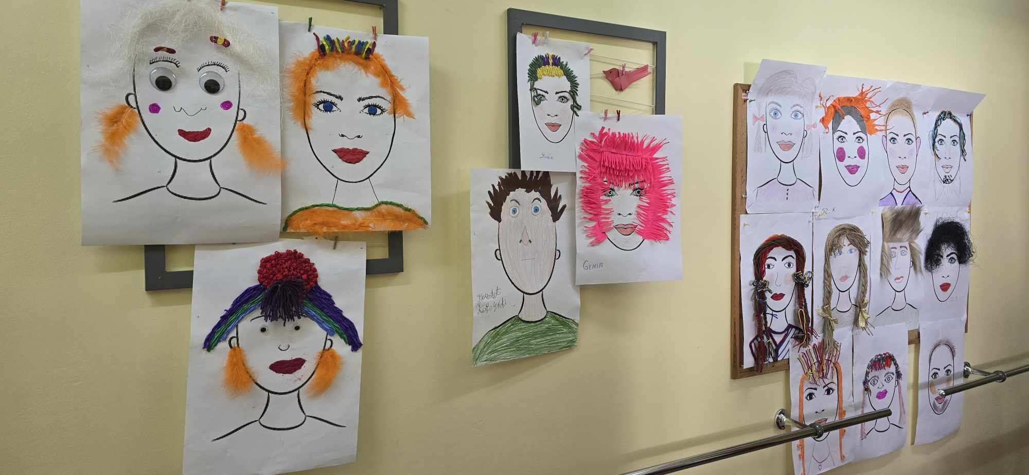 Na dzisiejszych zajęciach uczestnicy otrzymali rożnego rodzaju materiały, z których wykonywali fryzury na szablonach twarzy. Technika i pomysłowość uczestników w wykonaniu swoich prac zrobiły na terapeutach duże wrażenie. Począwszy od rysowania kredkami, wyklejania plasteliną, bibułą, po wyklejanie sznurkami, czy włóczką.