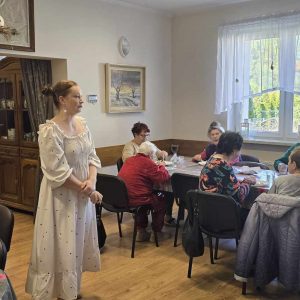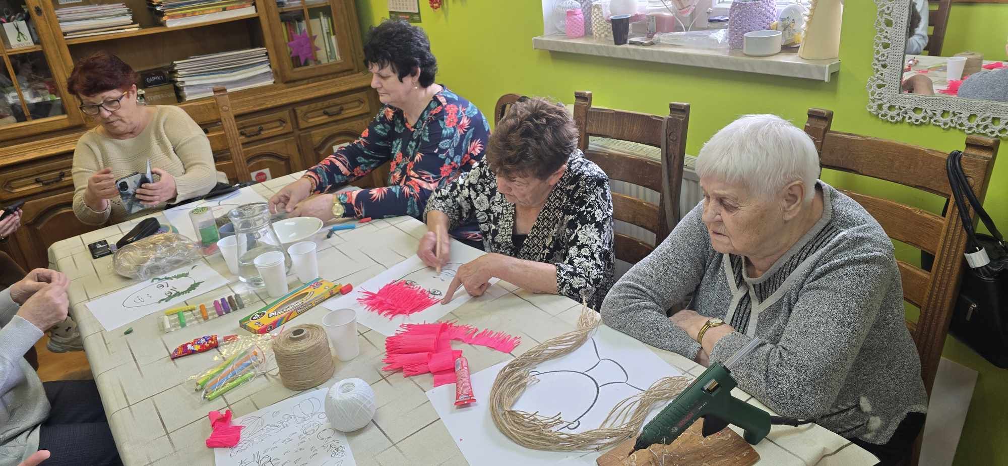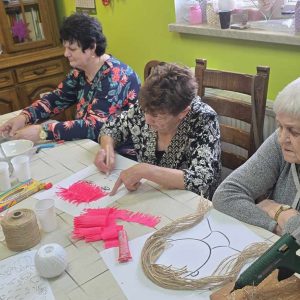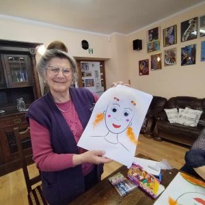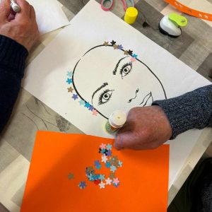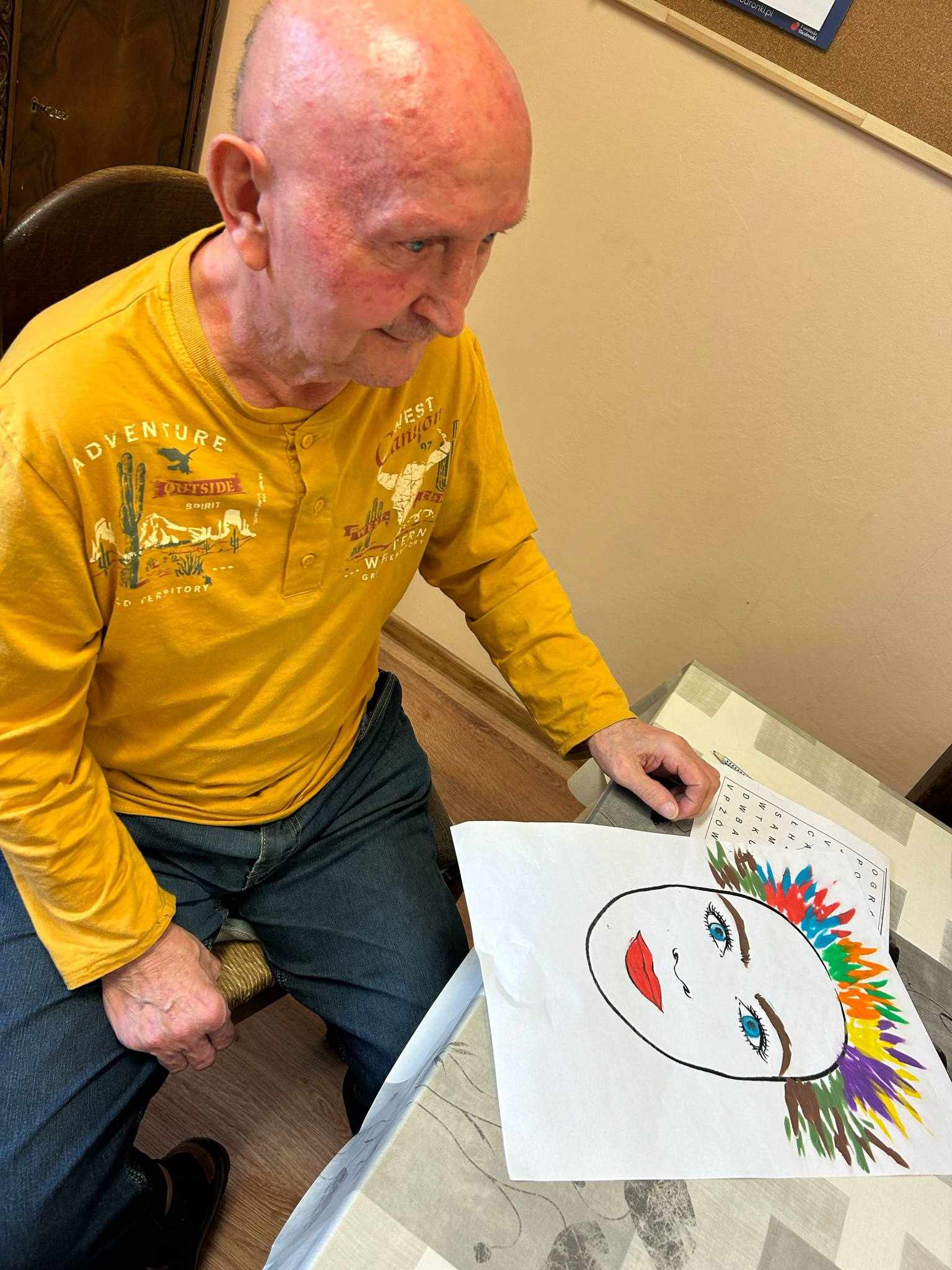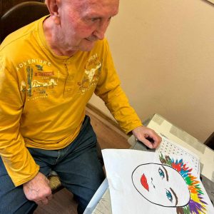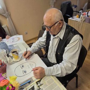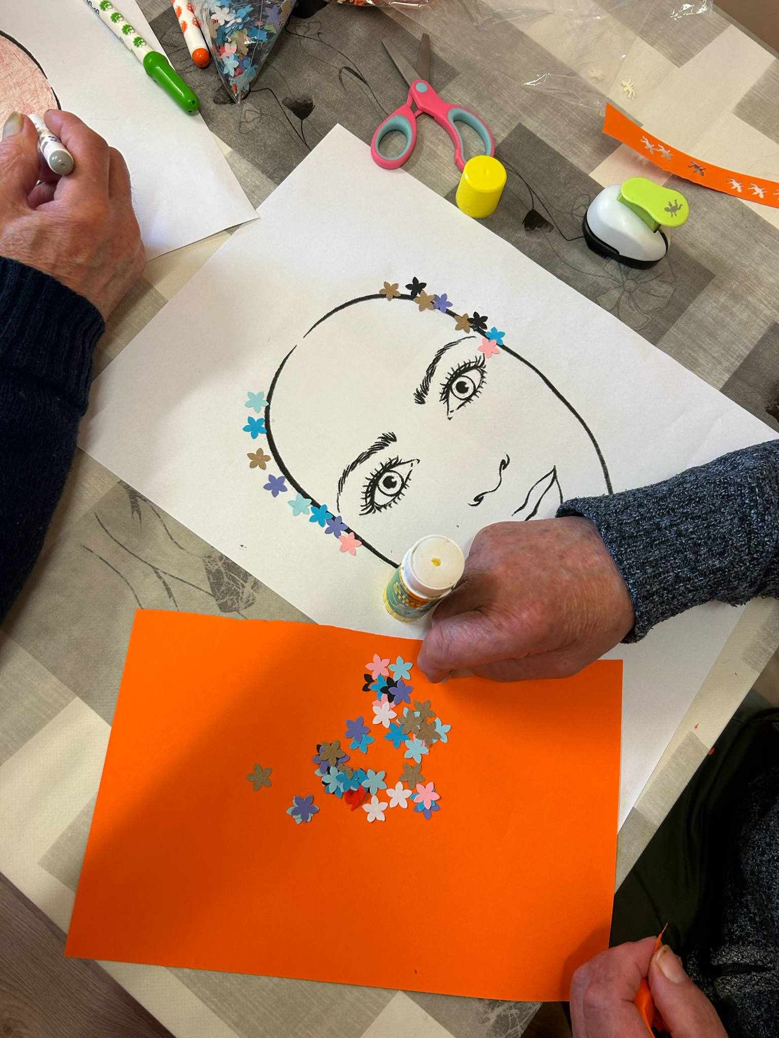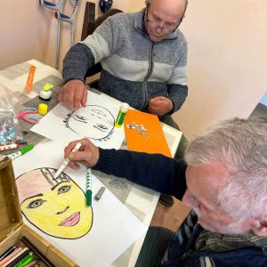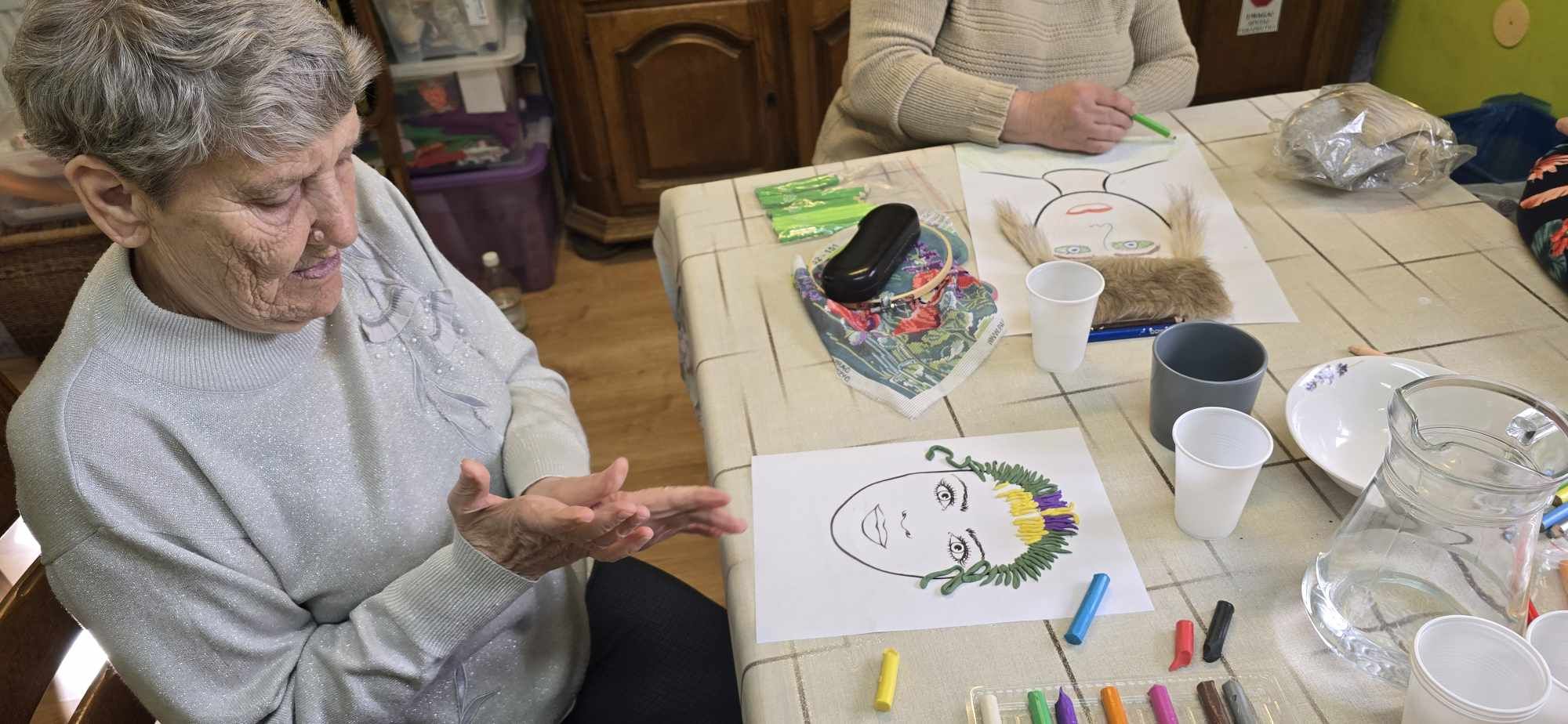 Na dzisiejszych zajęciach uczestnicy otrzymali rożnego rodzaju materiały, z których wykonywali fryzury na szablonach twarzy. Technika i pomysłowość uczestników w wykonaniu swoich prac zrobiły na terapeutach duże wrażenie. Począwszy od rysowania kredkami, wyklejania plasteliną, bibułą, po wyklejanie sznurkami, czy włóczką.