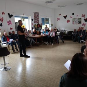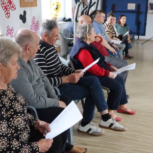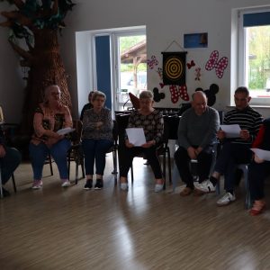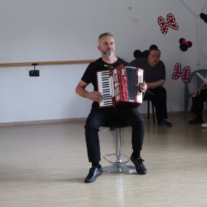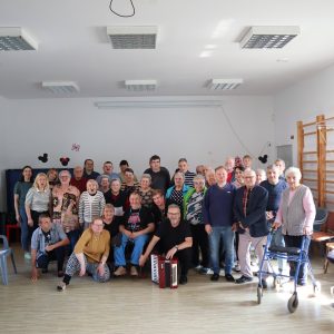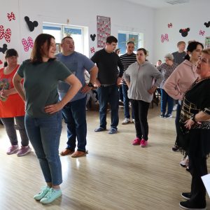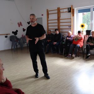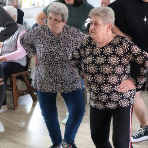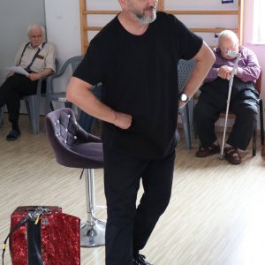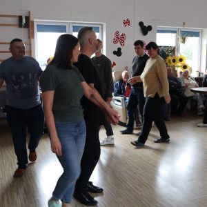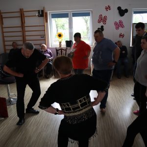 Największe emocje wzbudziła część praktyczna – pan Grzegorz zaprezentował podstawowe kroki wybranych tańców, a następnie zachęcił wszystkich do wspólnego tańca. W rytmie tradycyjnych piosenek ćwiczyliśmy razem kroki pofajdoka, szota i poloneizy, a uczestnicy którzy nie byli w stanie tańczyć śpiewali do akompaniamentu akordeonu.