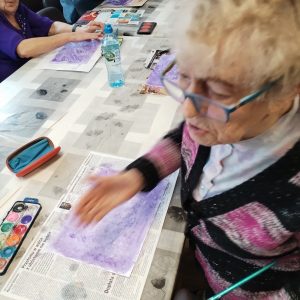 Spotkanie rozpoczęliśmy krótką rozmową o znaczeniu fioletu w naszym życiu – jego kojącym, tajemniczym i inspirującym charakterze. Następnie przeszliśmy do części praktycznej, w której wykorzystaliśmy jedną z ulubionych technik arteterapeutycznych: malowanie farbami z dodatkiem soli. Ta metoda nie tylko daje niezwykłe efekty wizualne, ale również działa relaksująco, rozwija wyobraźnię i angażuje zmysły.