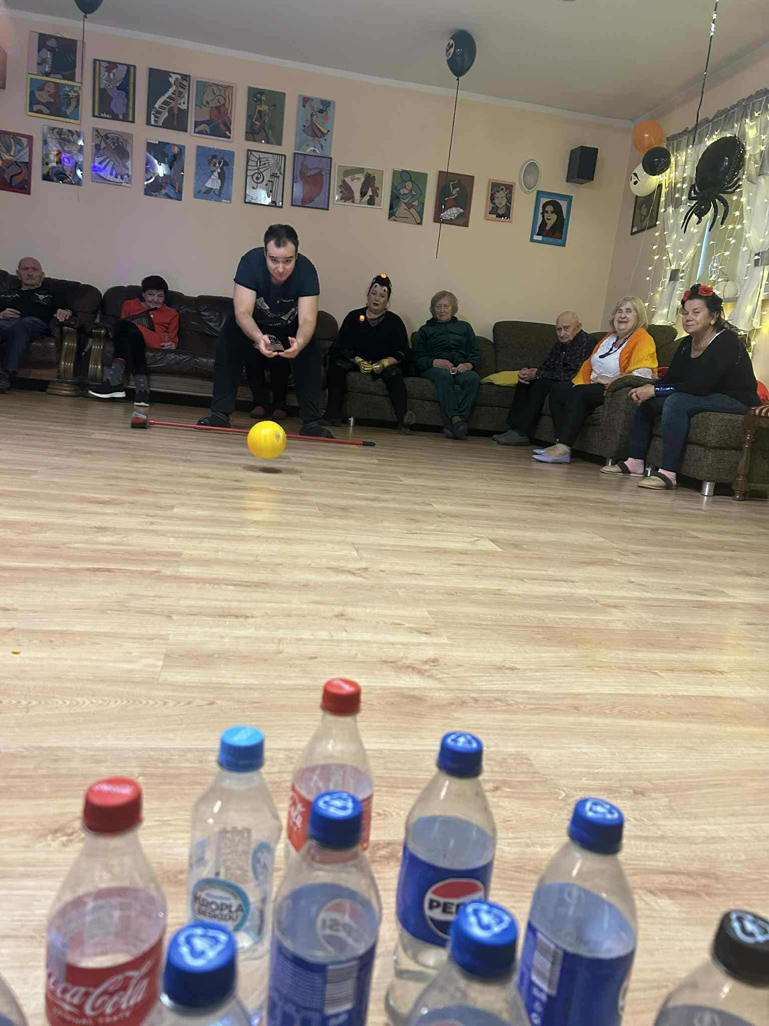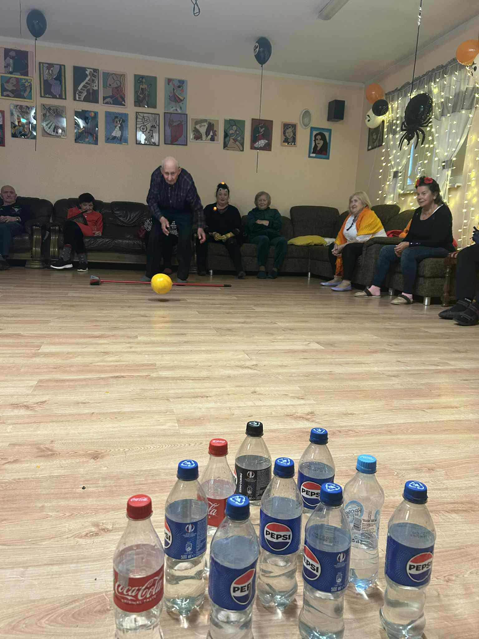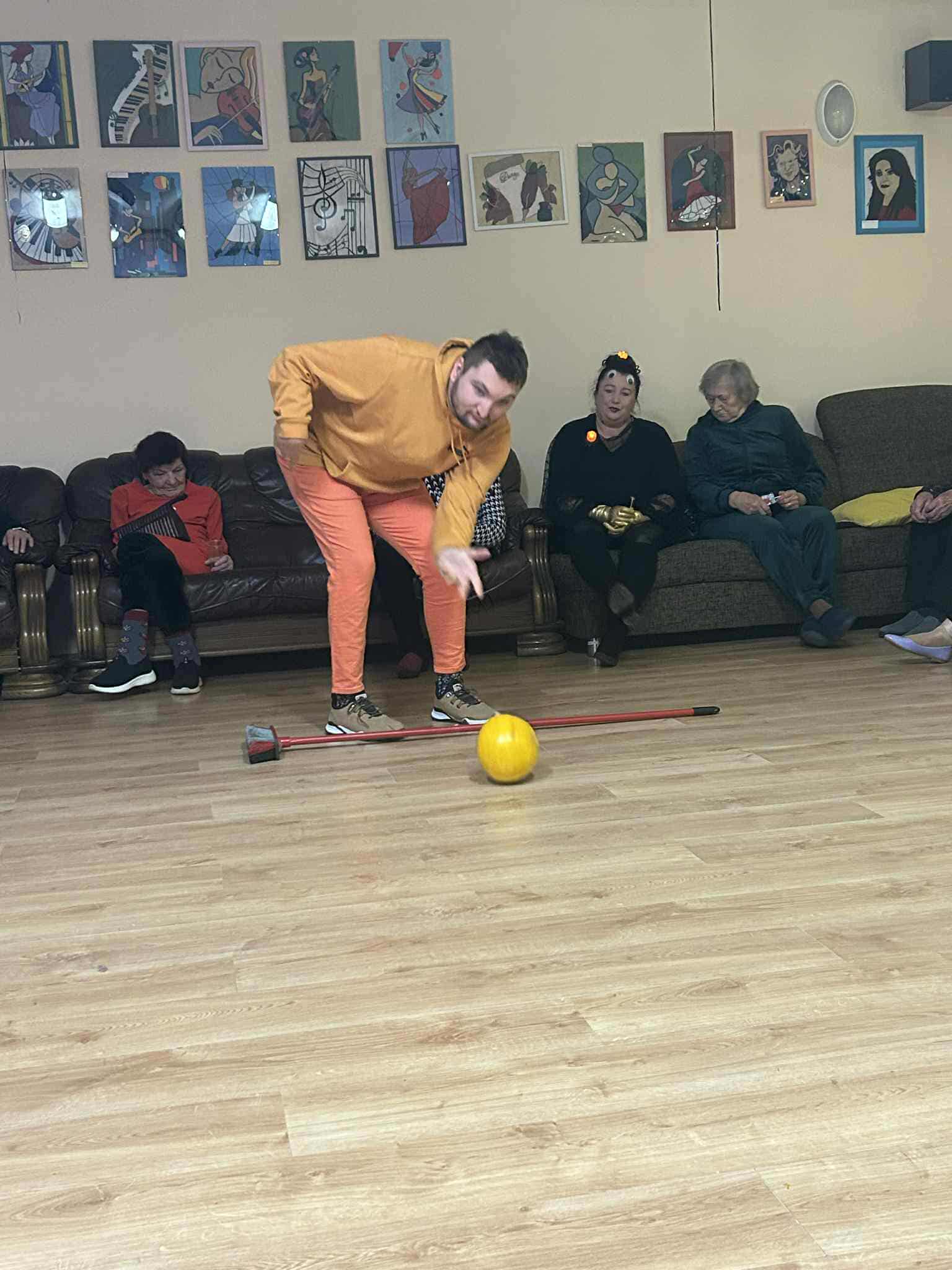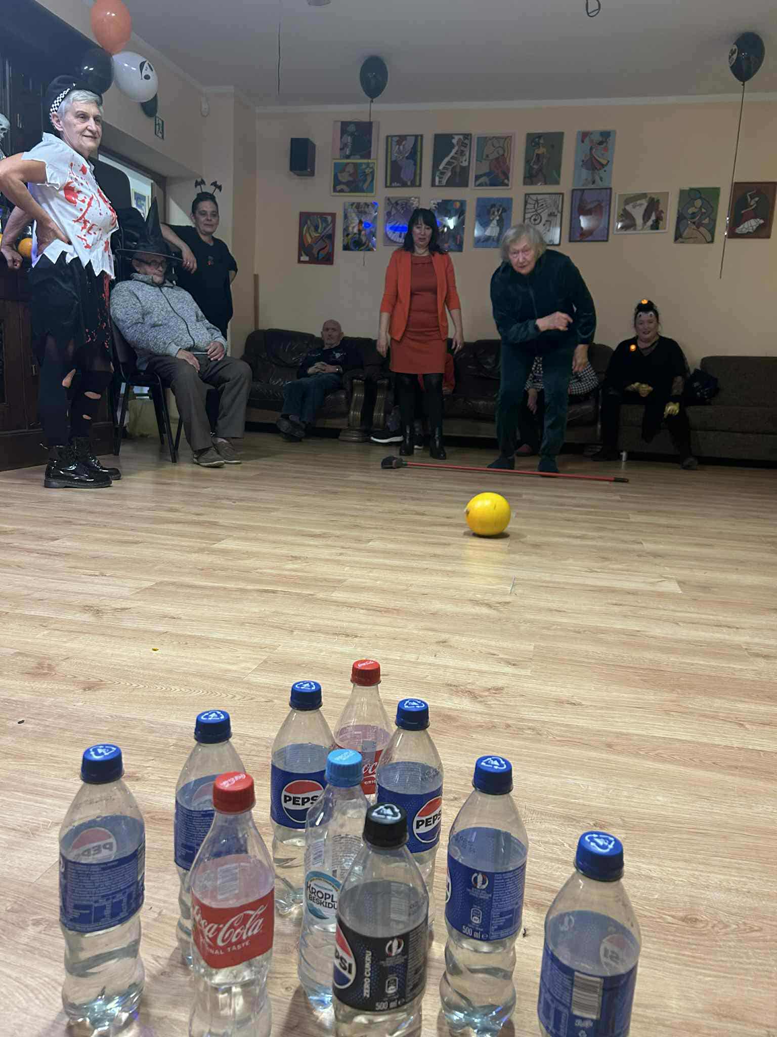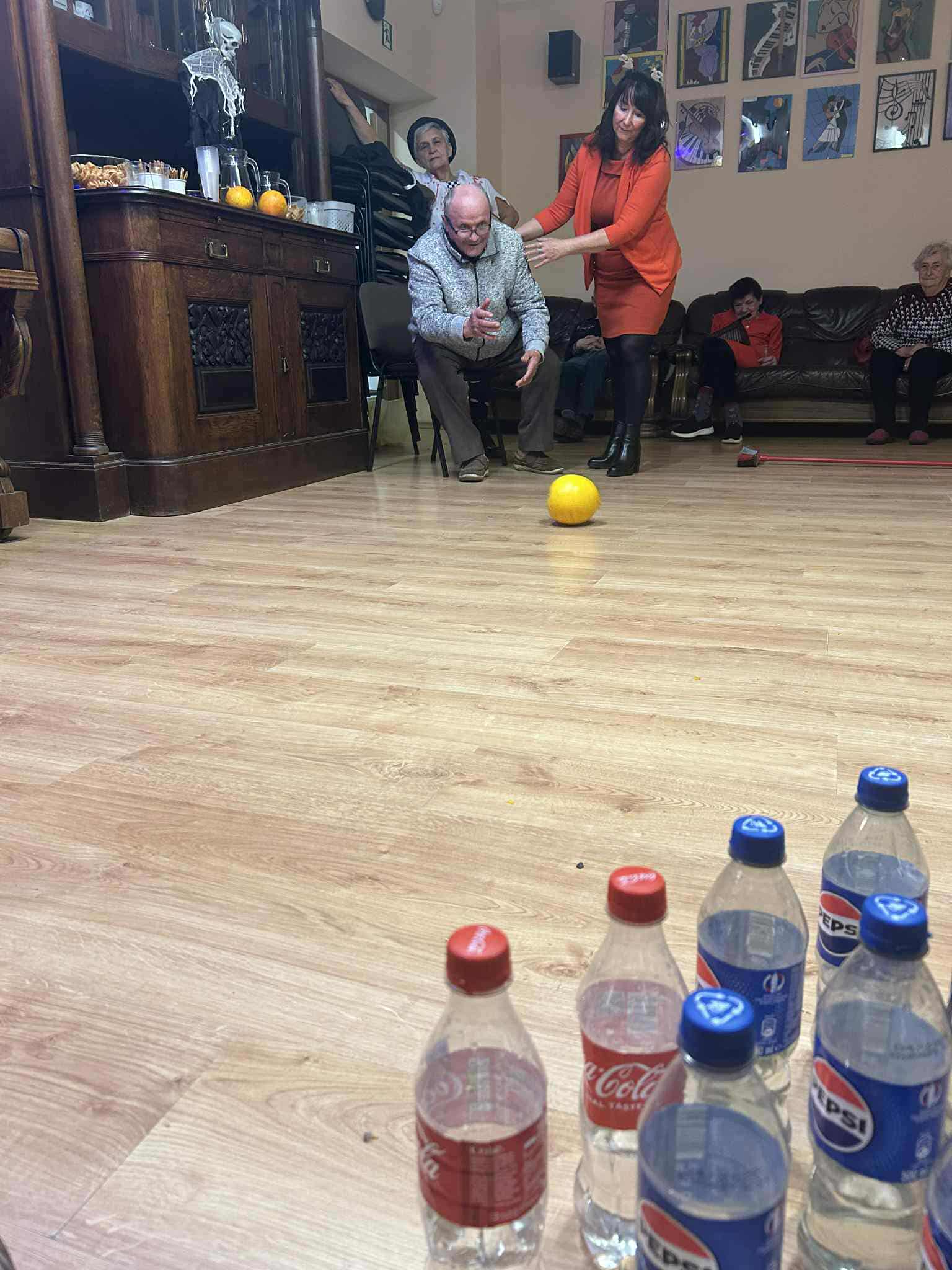 Podczas spotkania nie zabrakło zabaw zręcznościowych i ruchowych. Seniorzy z dużym zaangażowaniem uczestniczyli w takich konkurencjach jak: wyścig dyni, mumia czy kręgle.
