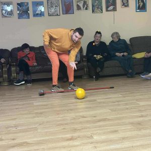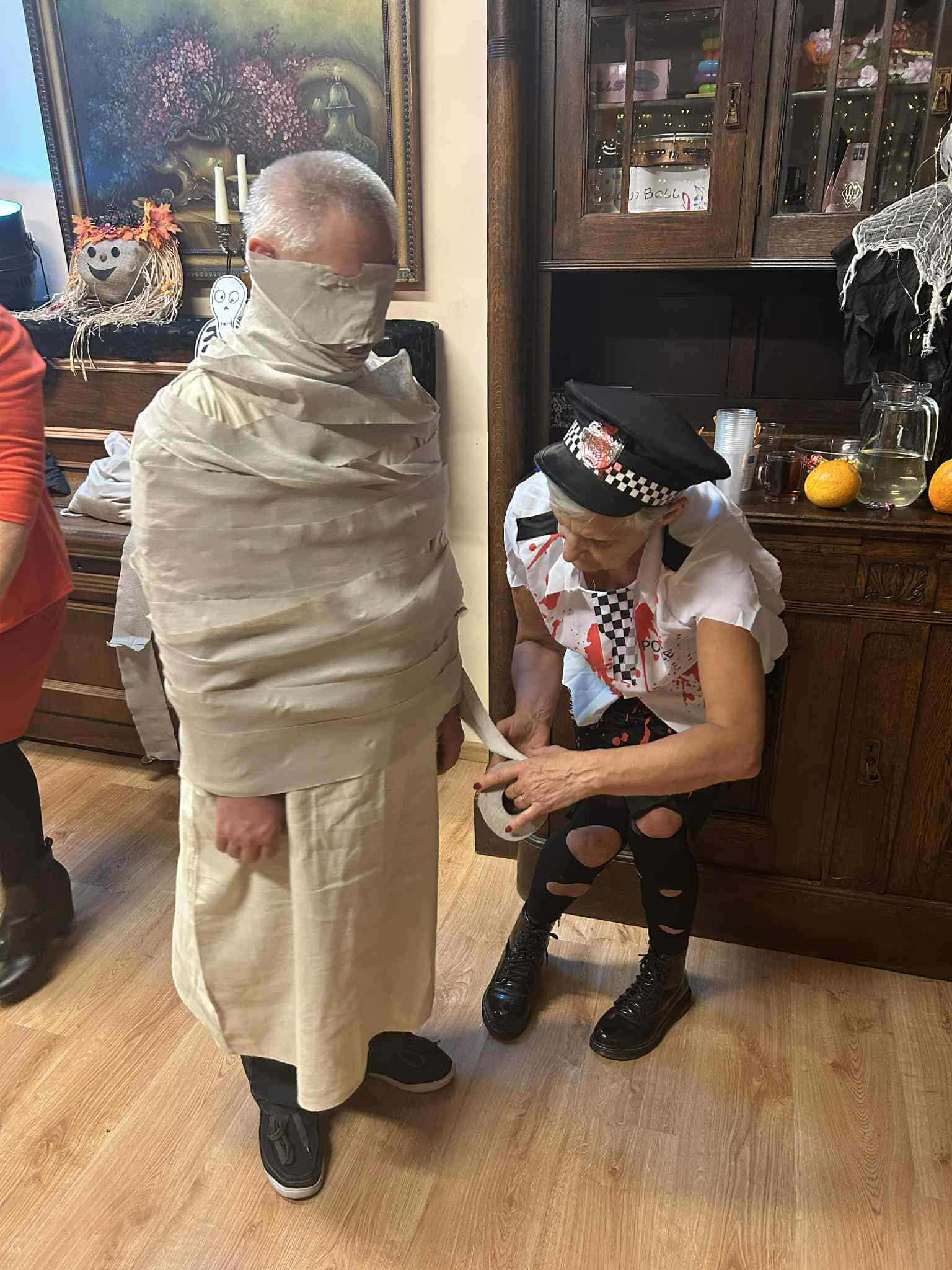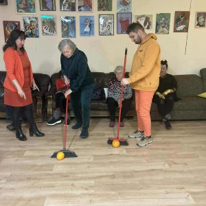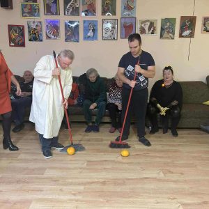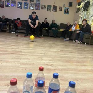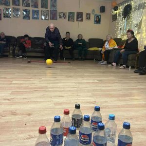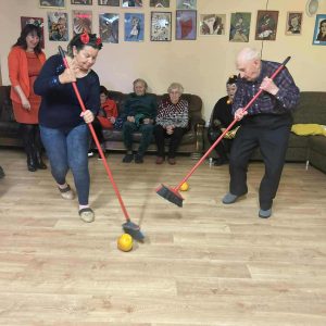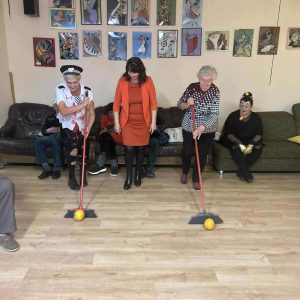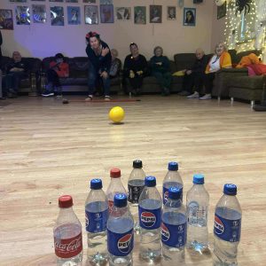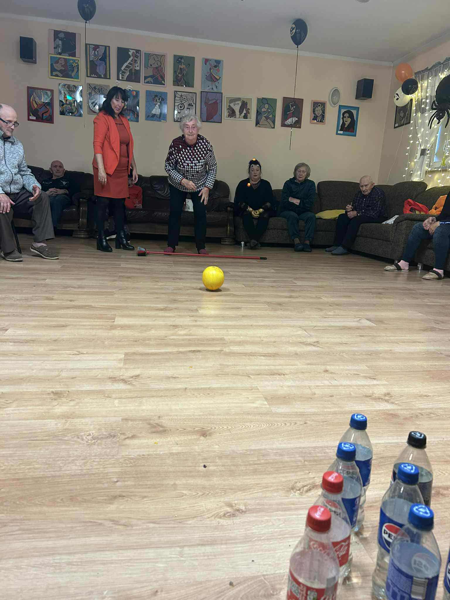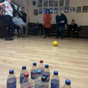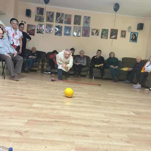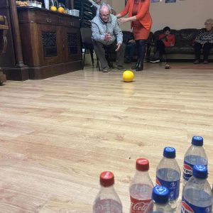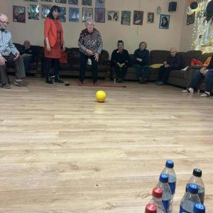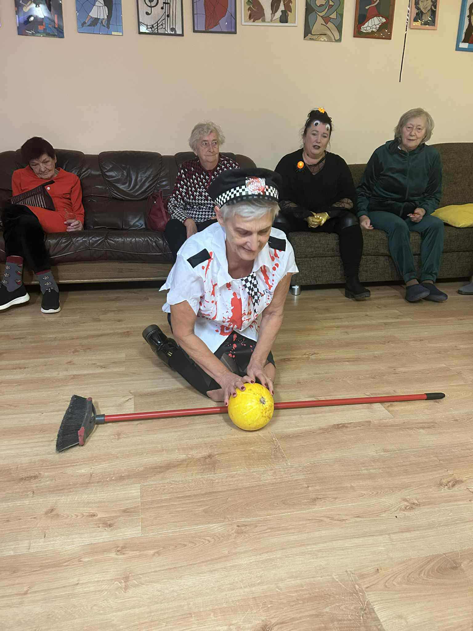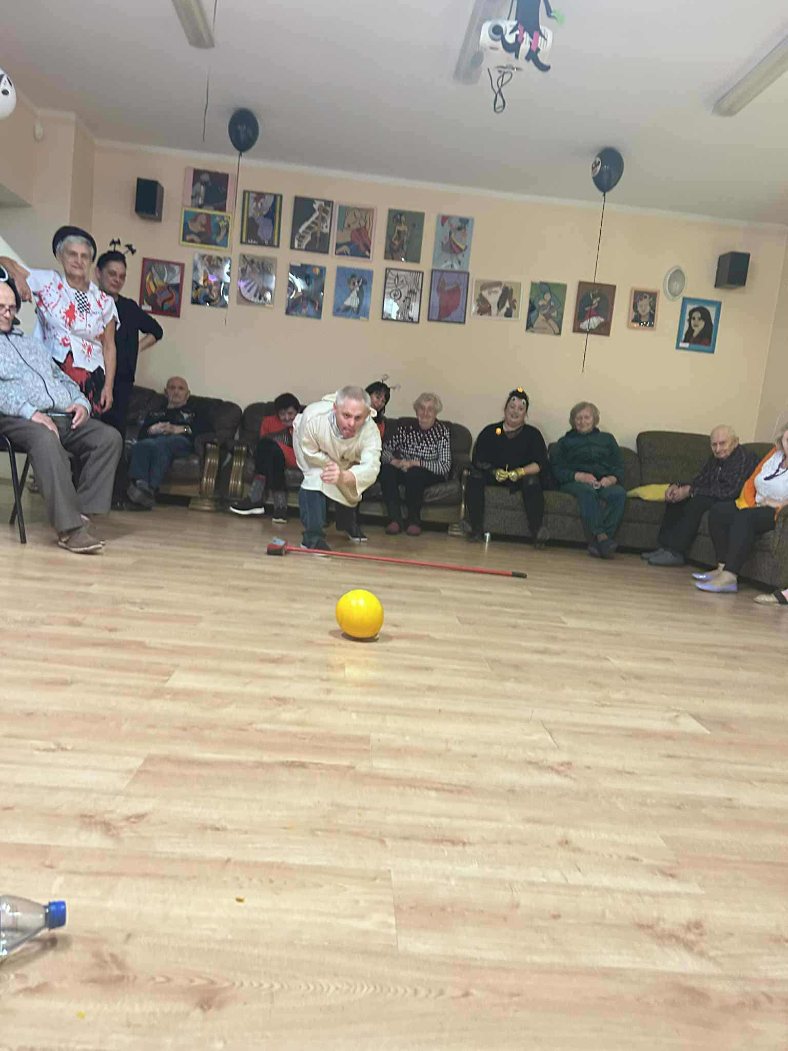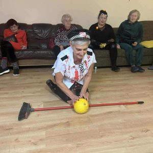 Podczas spotkania nie zabrakło zabaw zręcznościowych i ruchowych. Seniorzy z dużym zaangażowaniem uczestniczyli w takich konkurencjach jak: wyścig dyni, mumia czy kręgle.