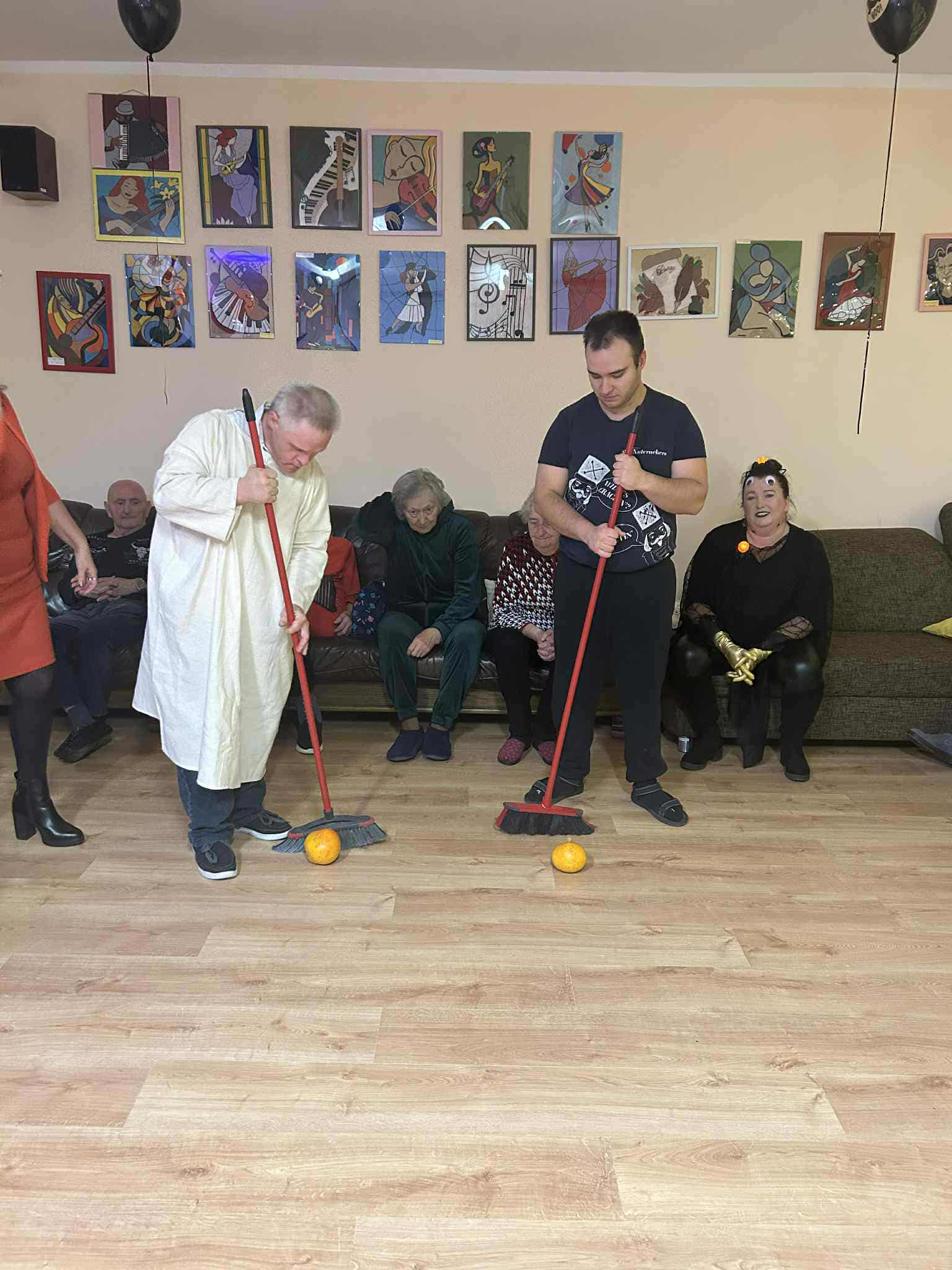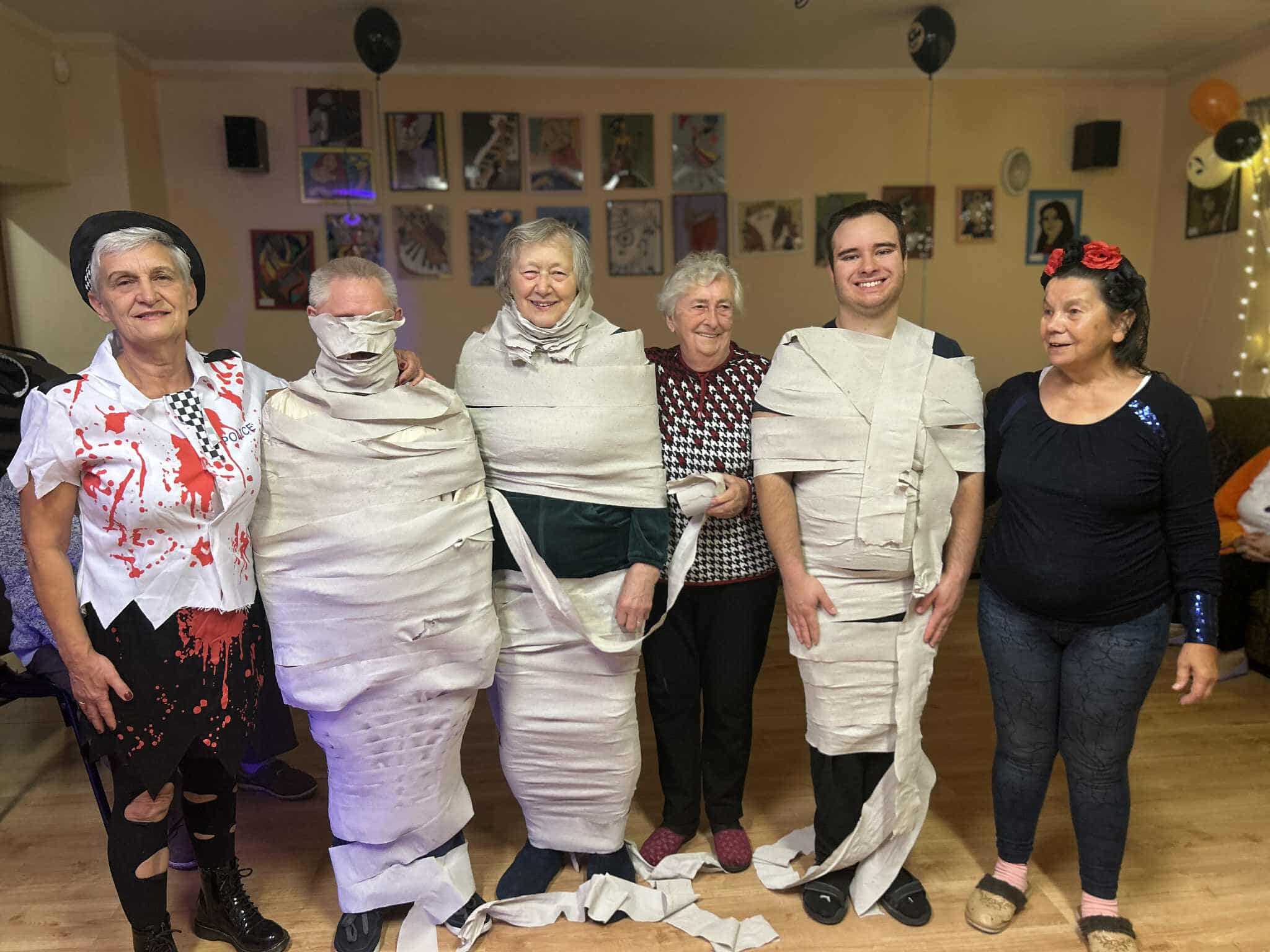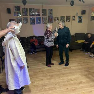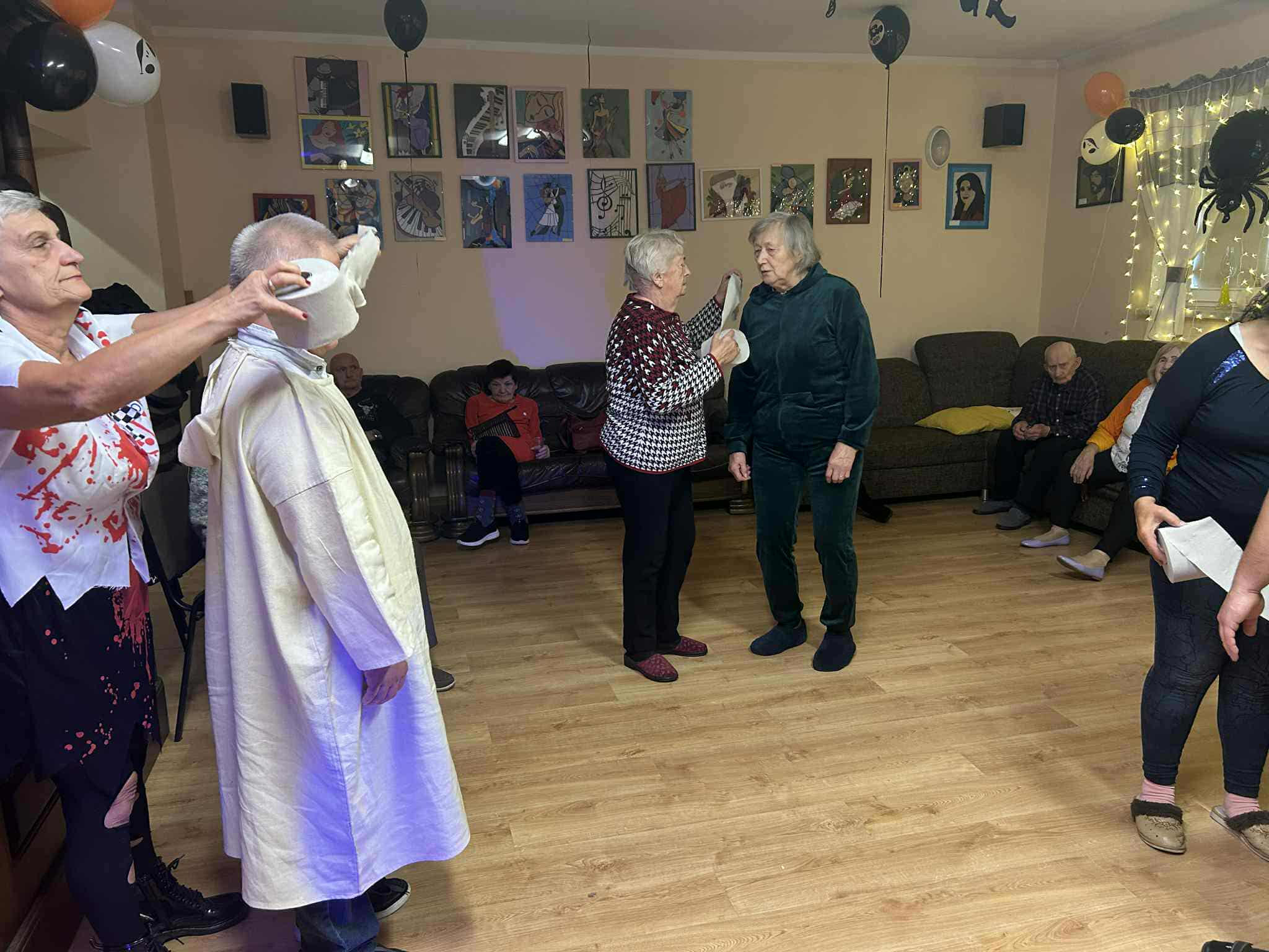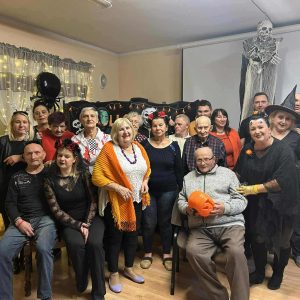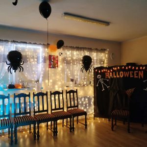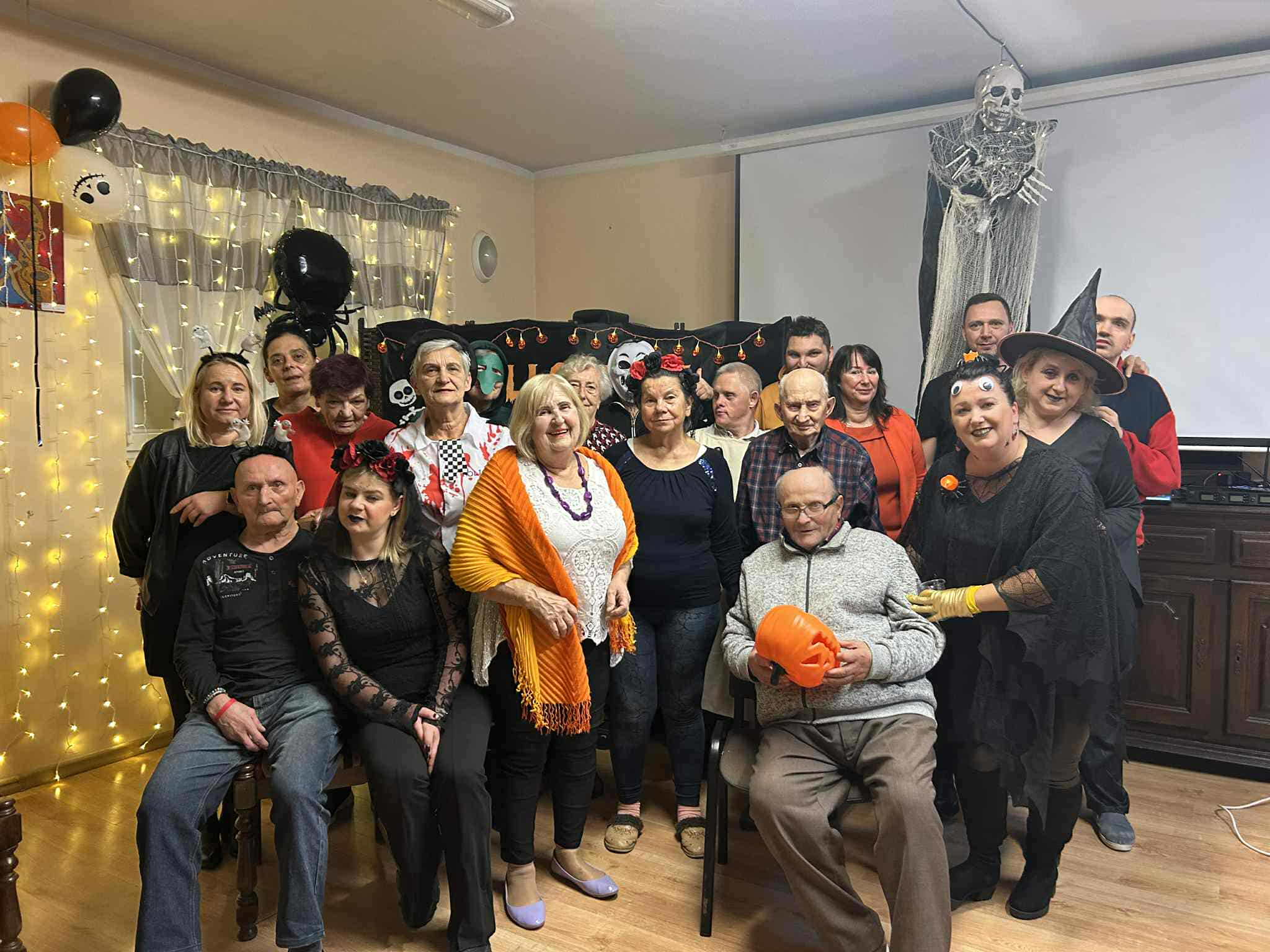 W dniu 31 października w naszym Domu odbyła się pełna radości i uśmiechu zabawa Halloweenowa. Sala została udekorowana w klimacie tajemniczej nocy – pojawiły się dynie, pająki, nietoperze, kościotrupy i świecące lampiony. Uczestnicy przyszli przebrani w różnorodne stroje – czarownice, duchy, wróżki i wampiry – co wprowadziło wszystkich w wyjątkowy, żartobliwy nastrój.
