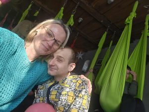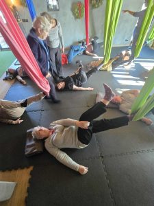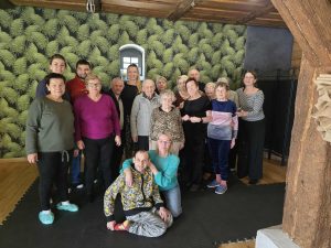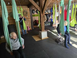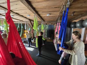 Uczestnicy zajęć jogi na hamaku w Fundacji „Hortus” w Szczęsnem aktywnie i z dużym zaangażowaniem brali udział w proponowanych ćwiczeniach. Zajęcia odbywały się w przyjaznej, bezpiecznej atmosferze, sprzyjającej koncentracji i wyciszeniu. Uczestnicy z zainteresowaniem wykonywali ćwiczenia z wykorzystaniem hamaków, dostosowując intensywność do swoich indywidualnych możliwości i potrzeb. Widoczna była ich motywacja do pracy nad równowagą, elastycznością oraz relaksem, a także otwartość na nowe formy aktywności ruchowej. Wspólna praktyka sprzyjała integracji grupy, budowaniu wzajemnego zaufania oraz pozytywnemu nastawieniu do zajęć, co miało korzystny wpływ na samopoczucie fizyczne i psychiczne uczestników.