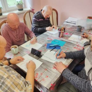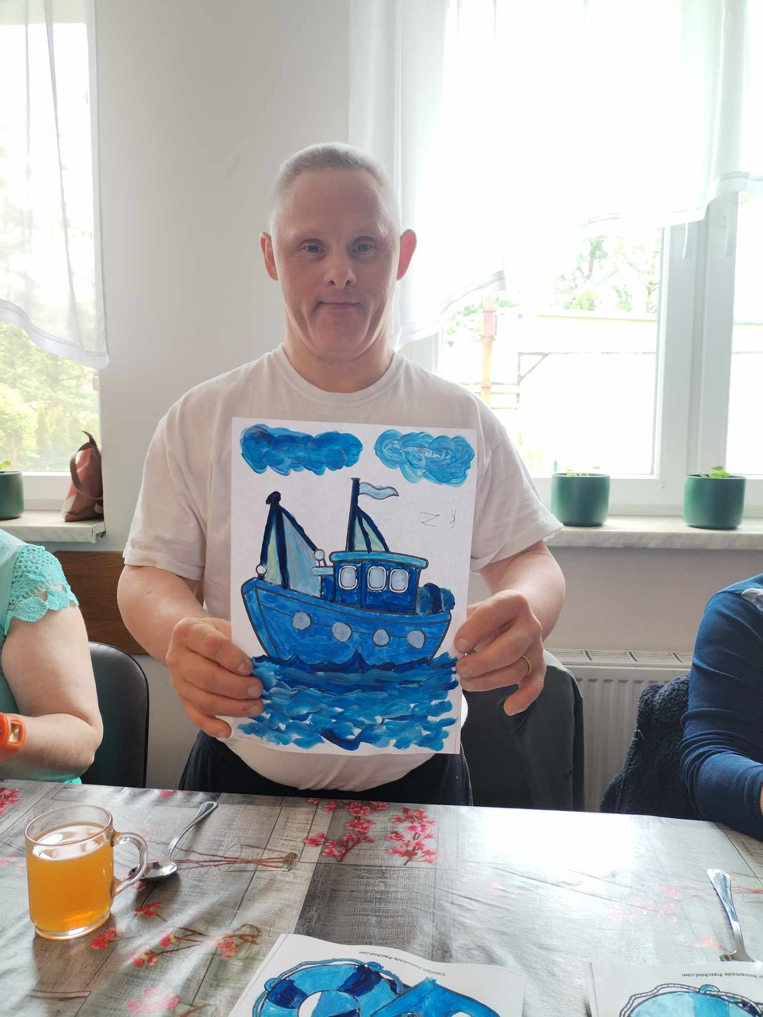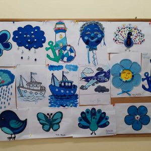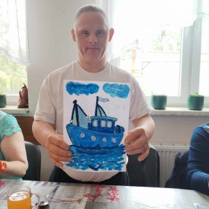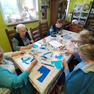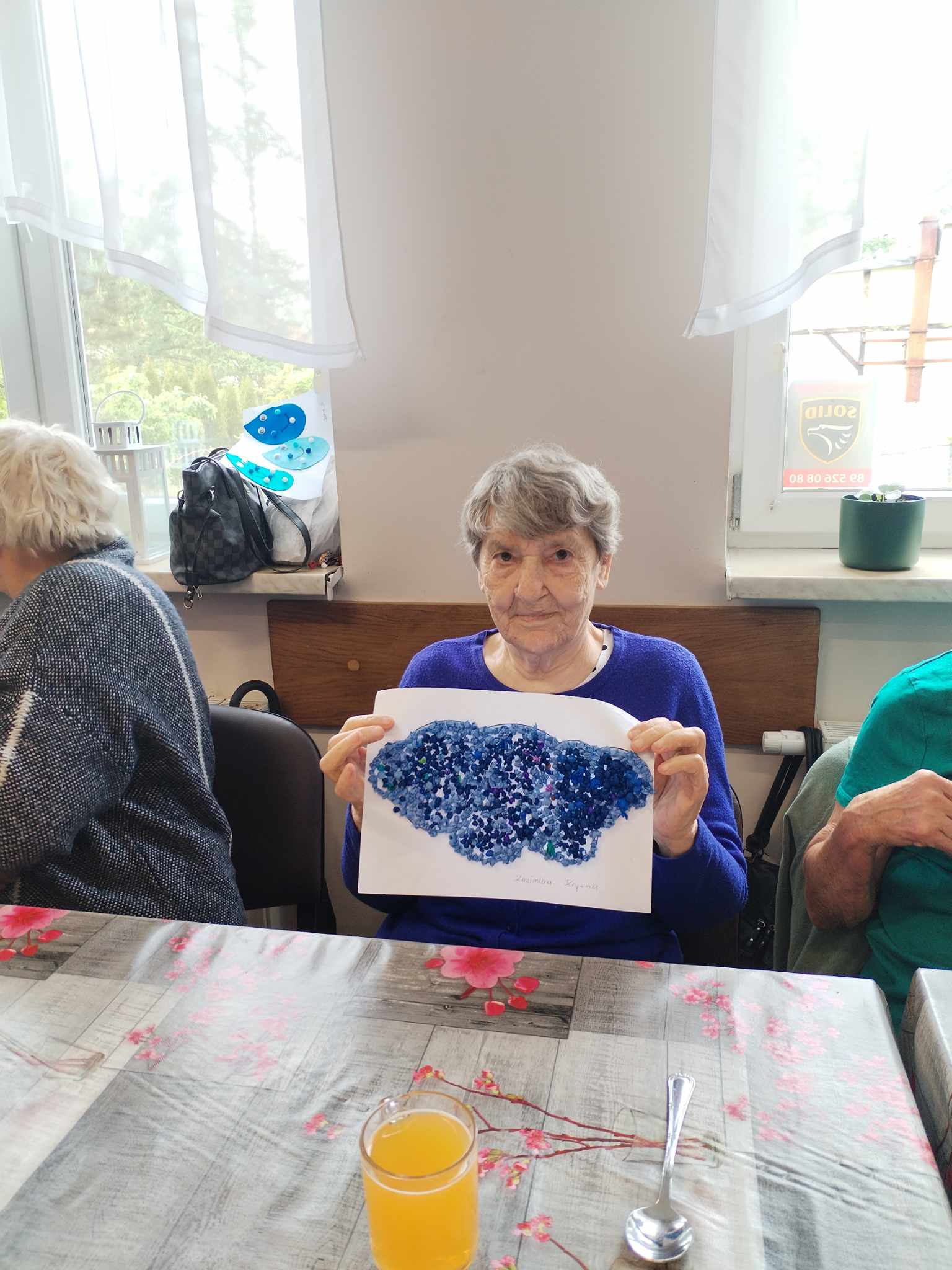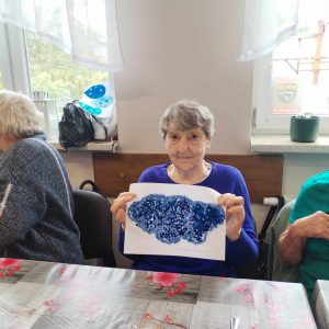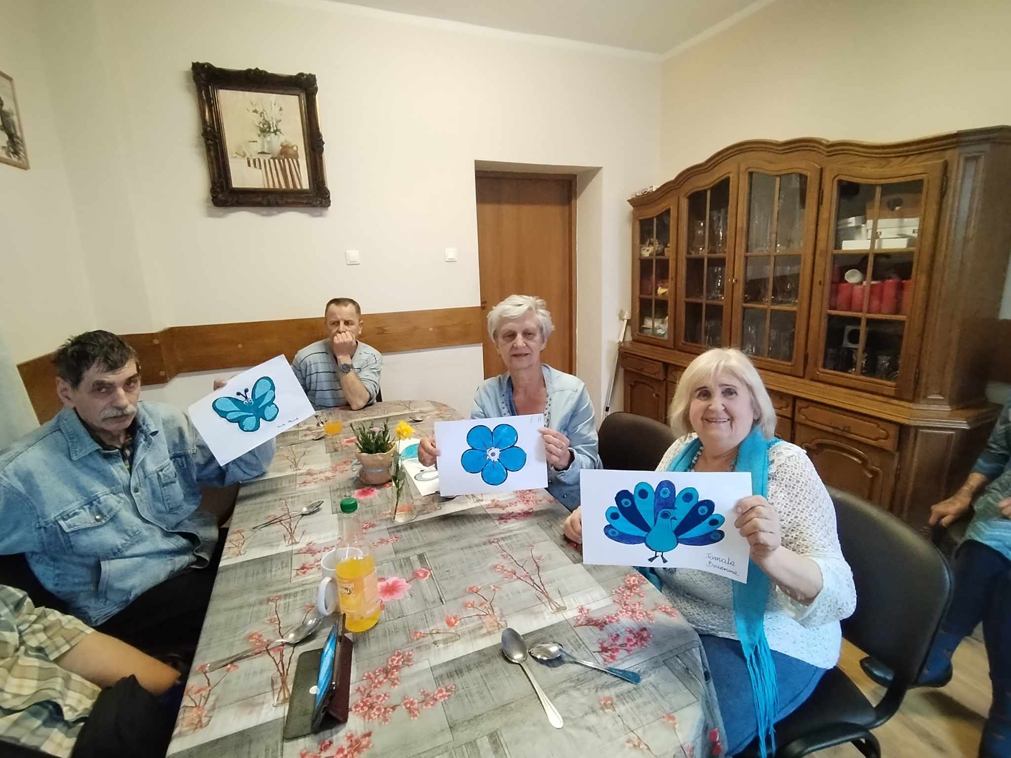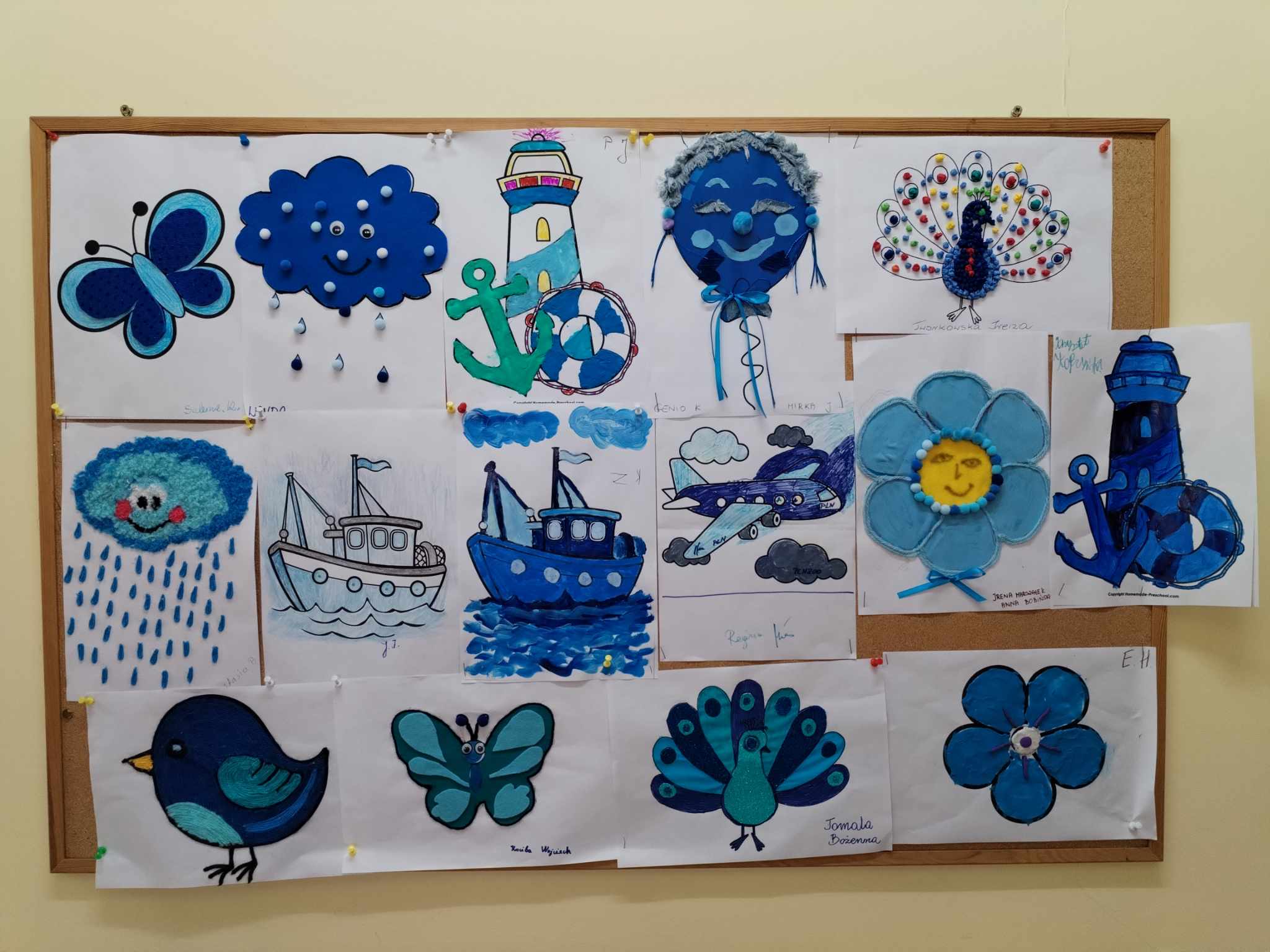 Dlatego też, podczas kolejnego kreatywnego czwartku nasi uczestnicy mieli za zadanie ozdobić obrazki w różnych odcieniach koloru niebieskiego takimi technikami jak: wyklejanie włóczką, filcem, kolorowanie kredką, malowanie farbami. Dzięki czemu powstały ciekawe i kreatywne obrazy, które uczestnicy zaprezentowali podczas pogadanki na temat koloru niebieskiego. Wszystkie prace znalazły swoje miejsce na wystawie.
