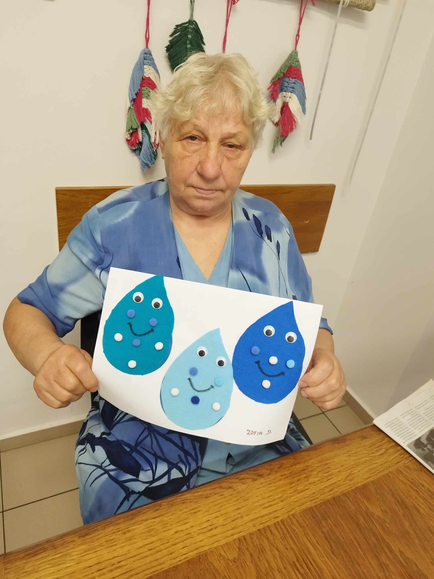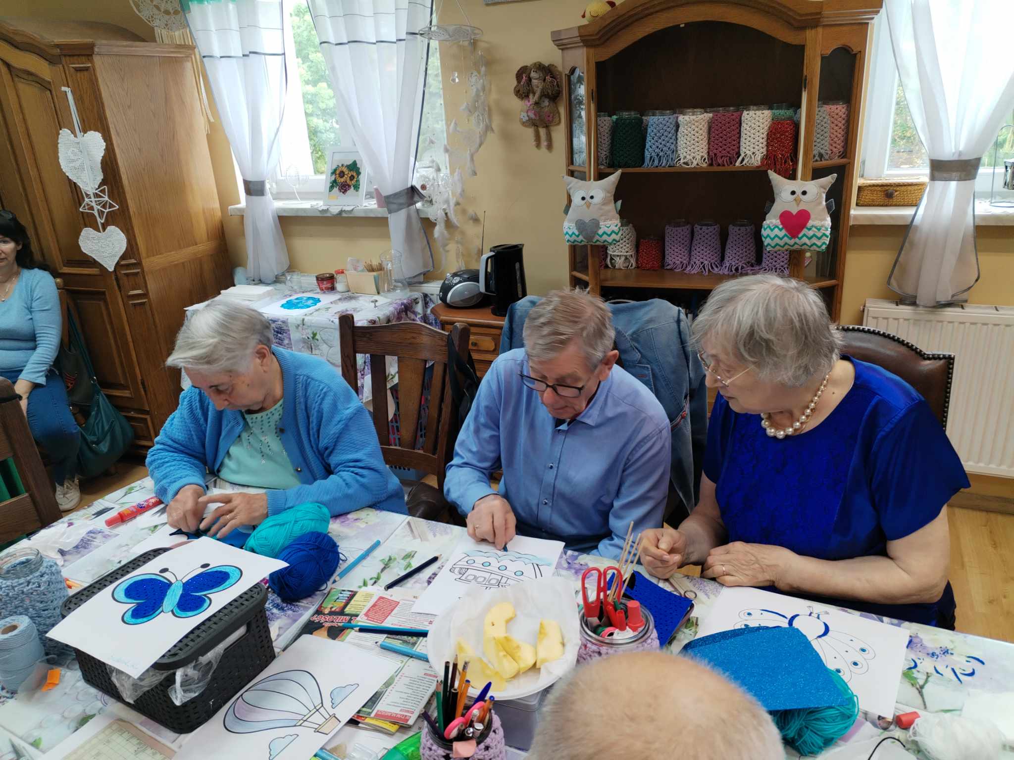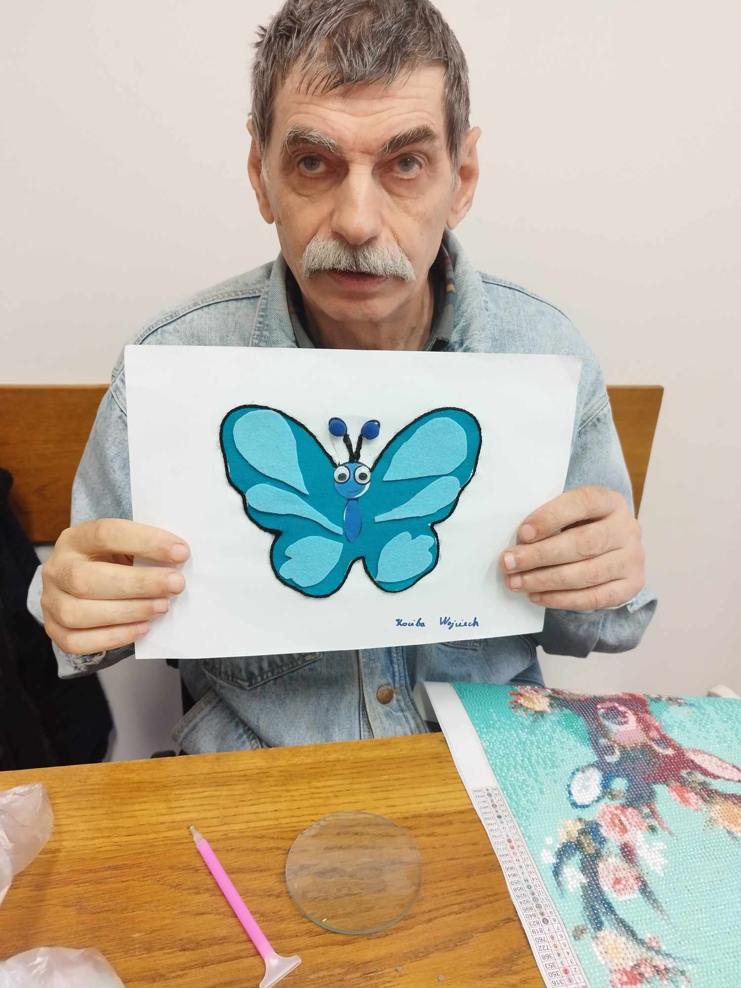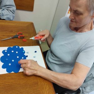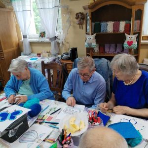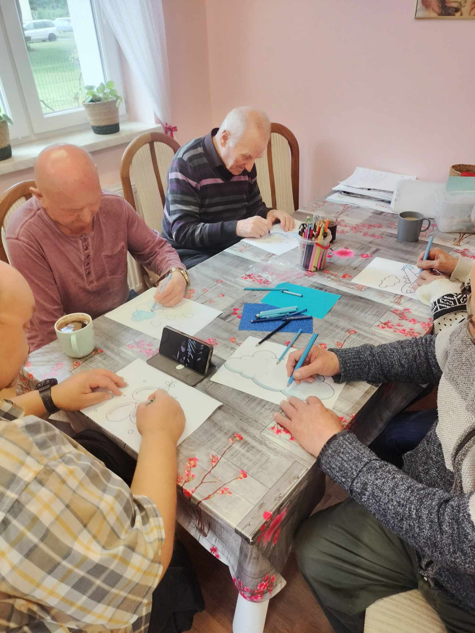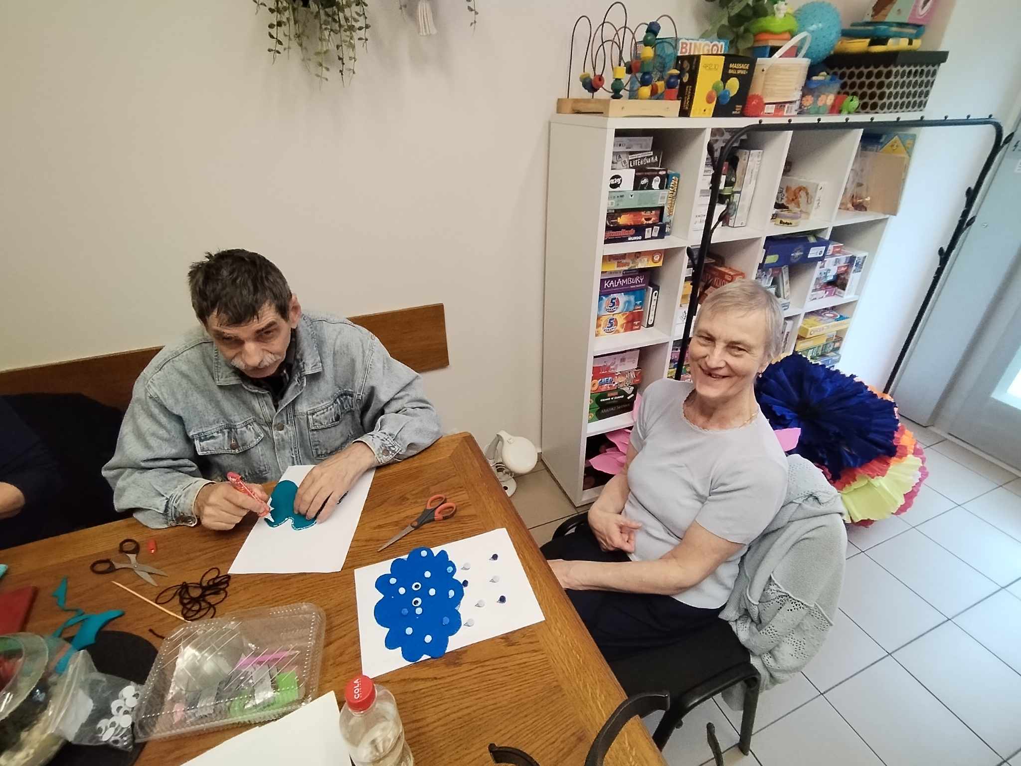 Dlatego też, podczas kolejnego kreatywnego czwartku nasi uczestnicy mieli za zadanie ozdobić obrazki w różnych odcieniach koloru niebieskiego takimi technikami jak: wyklejanie włóczką, filcem, kolorowanie kredką, malowanie farbami. Dzięki czemu powstały ciekawe i kreatywne obrazy, które uczestnicy zaprezentowali podczas pogadanki na temat koloru niebieskiego. Wszystkie prace znalazły swoje miejsce na wystawie.