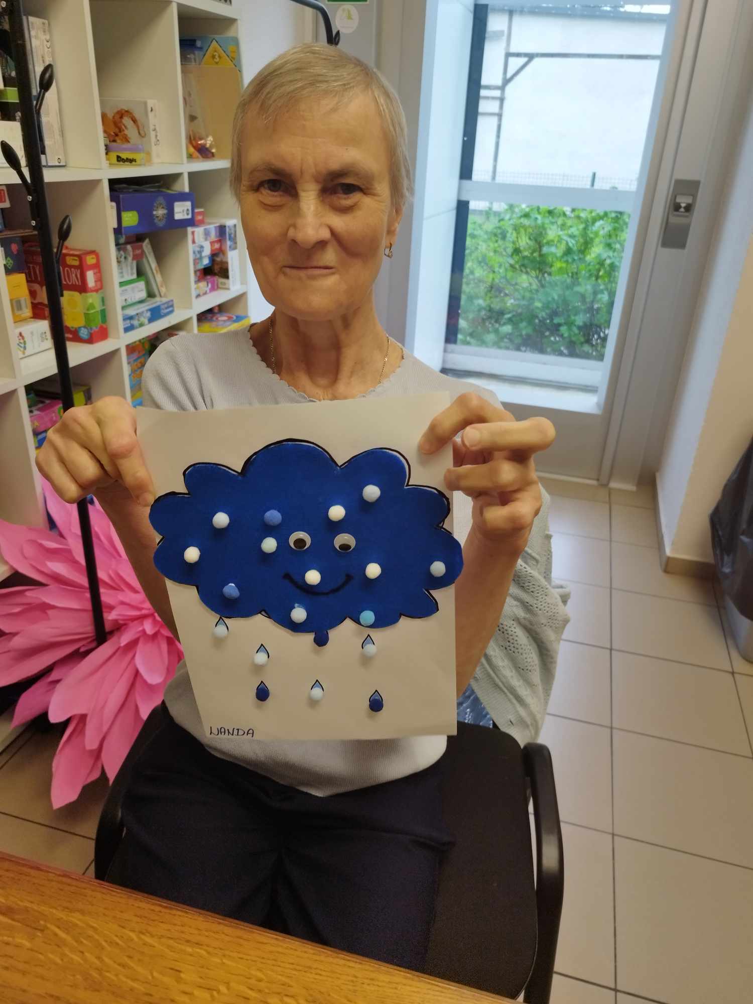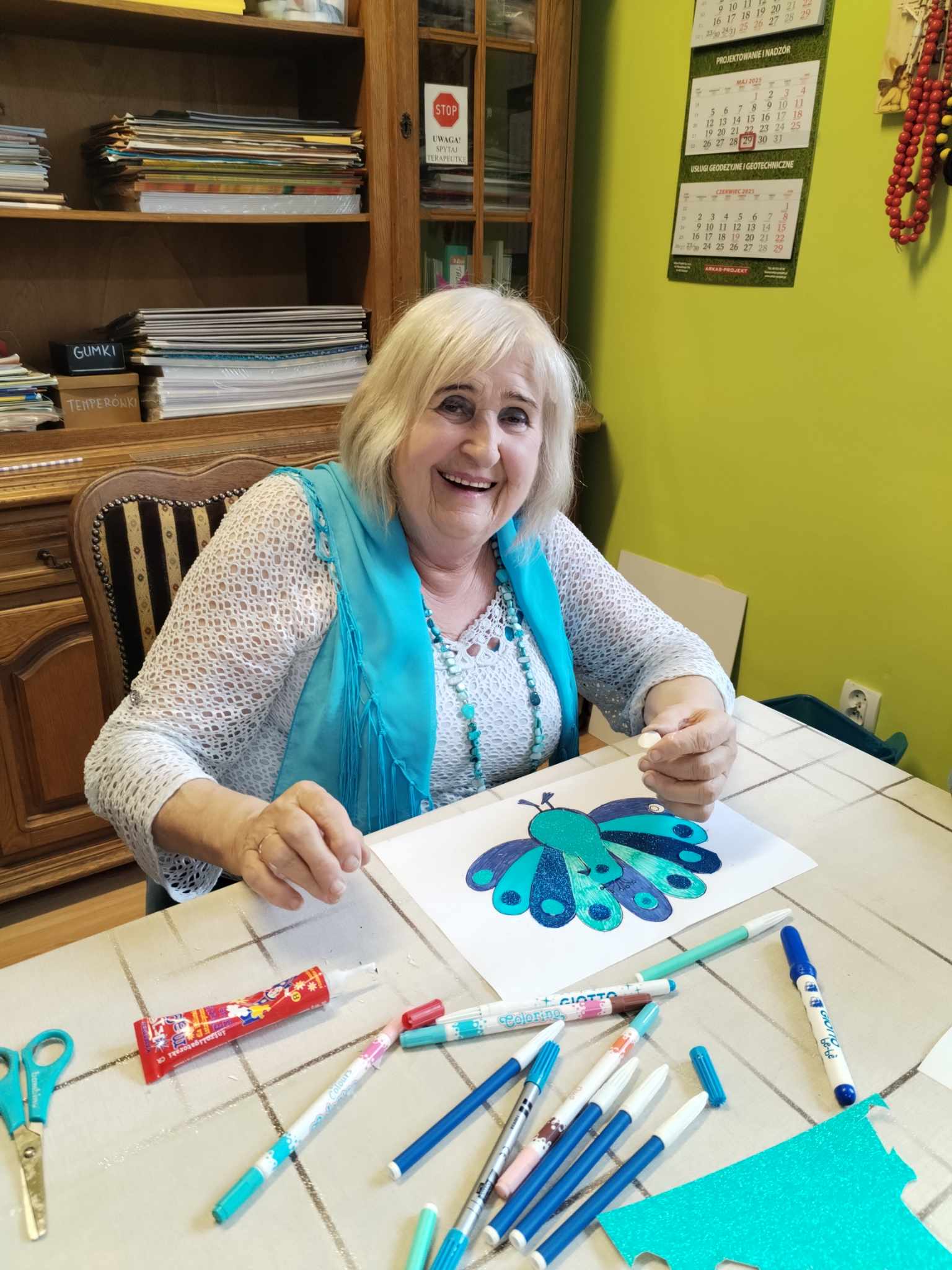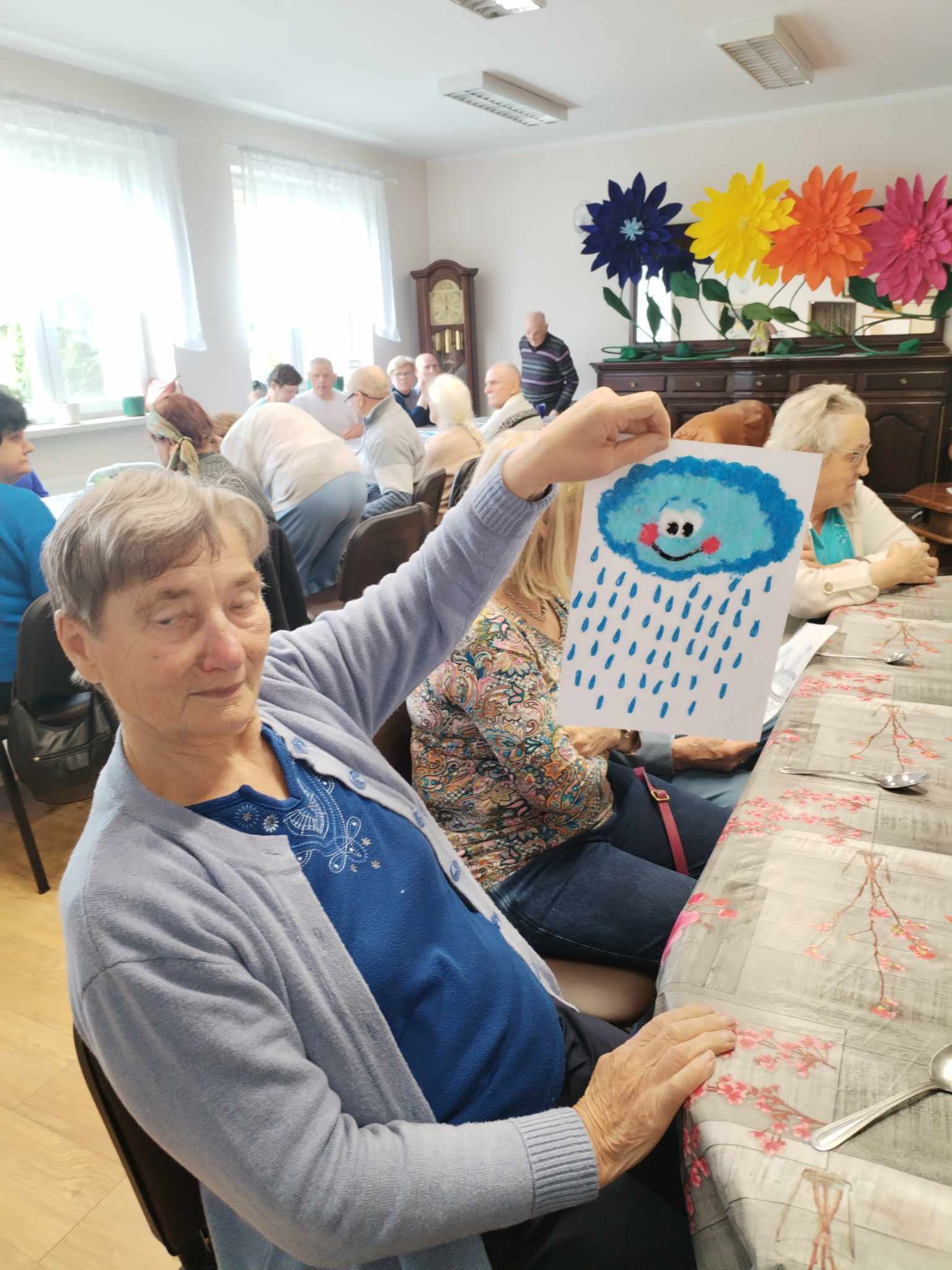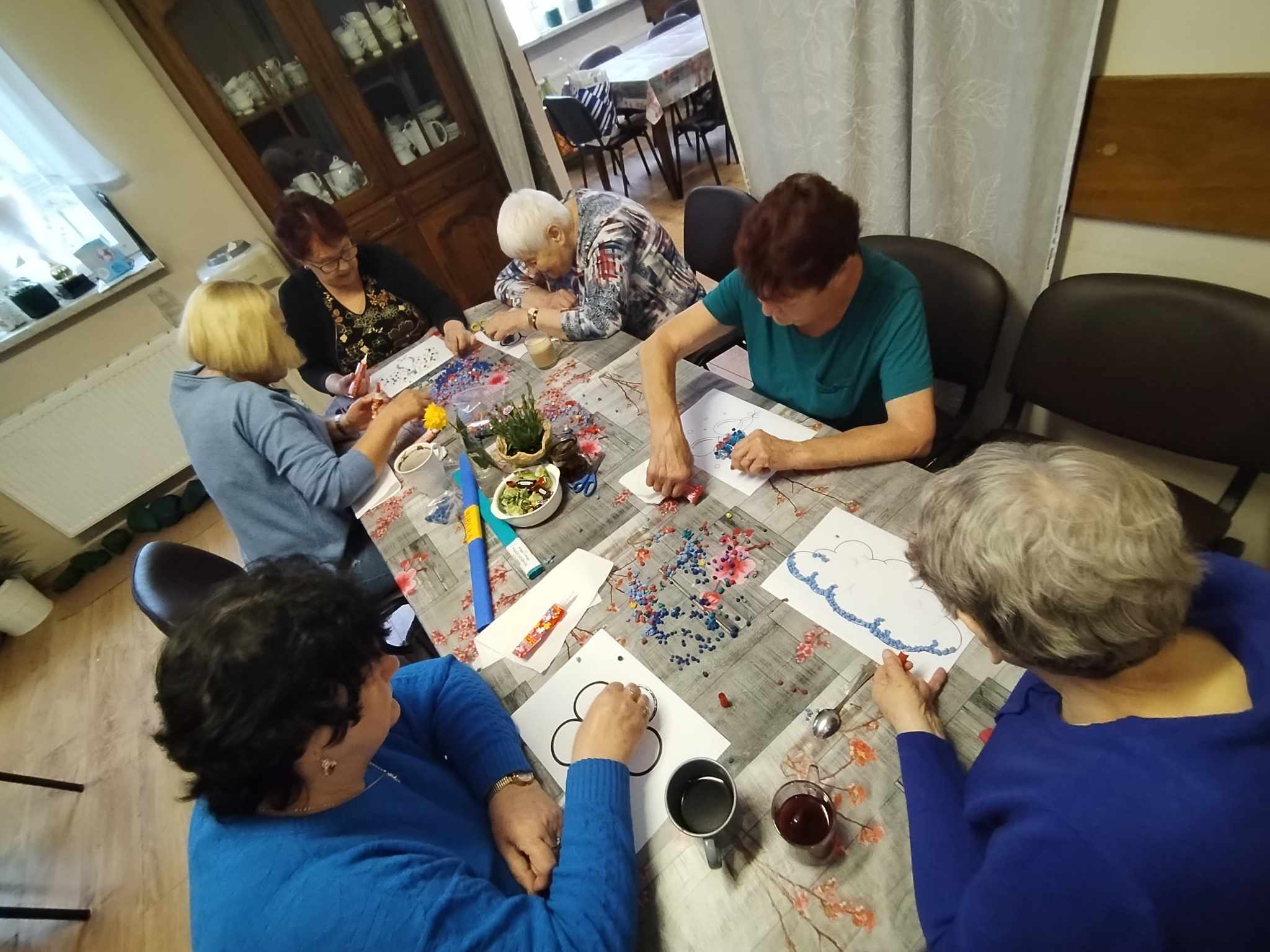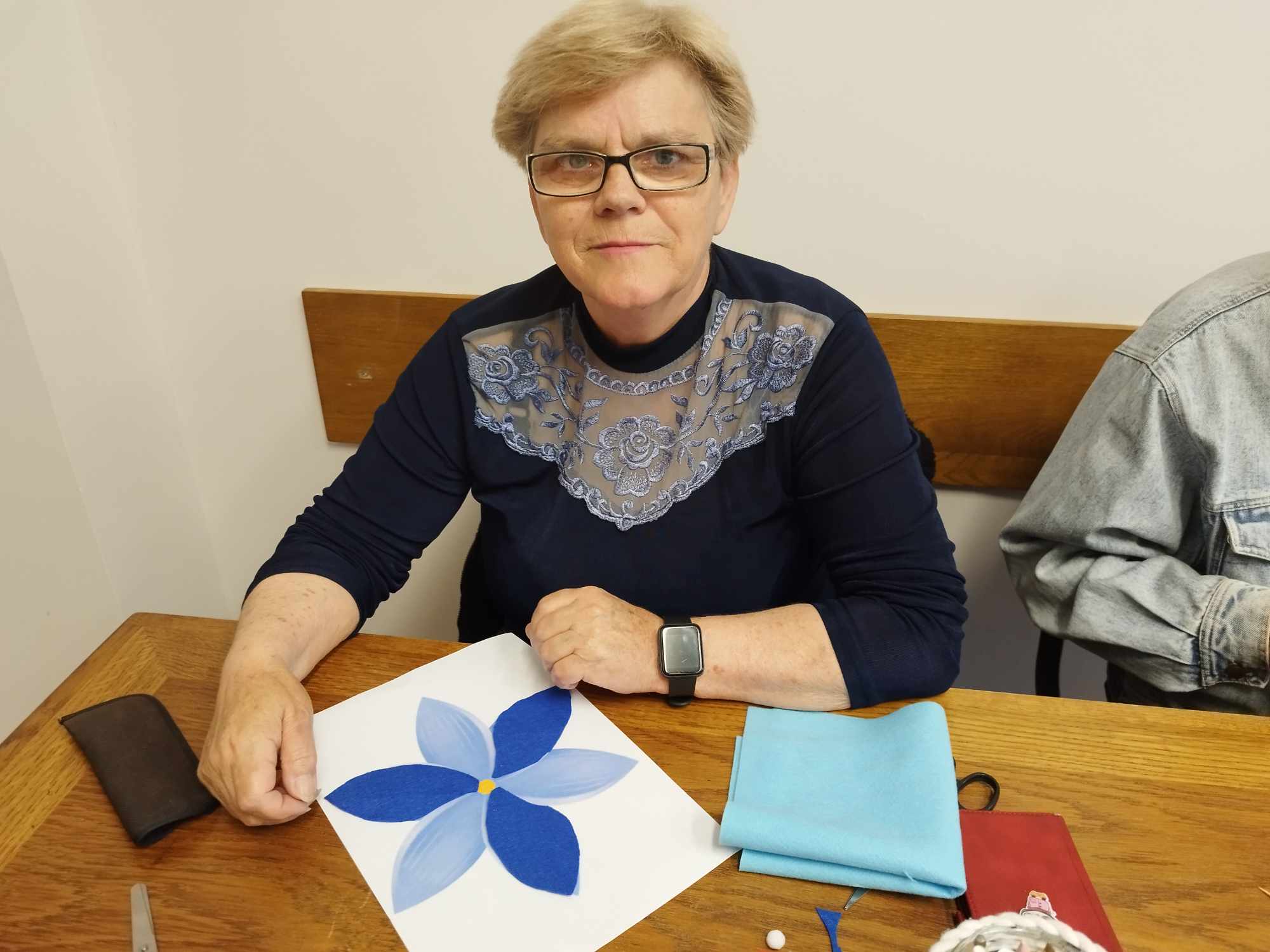 Dlatego też, podczas kolejnego kreatywnego czwartku nasi uczestnicy mieli za zadanie ozdobić obrazki w różnych odcieniach koloru niebieskiego takimi technikami jak: wyklejanie włóczką, filcem, kolorowanie kredką, malowanie farbami. Dzięki czemu powstały ciekawe i kreatywne obrazy, które uczestnicy zaprezentowali podczas pogadanki na temat koloru niebieskiego. Wszystkie prace znalazły swoje miejsce na wystawie.