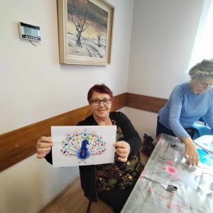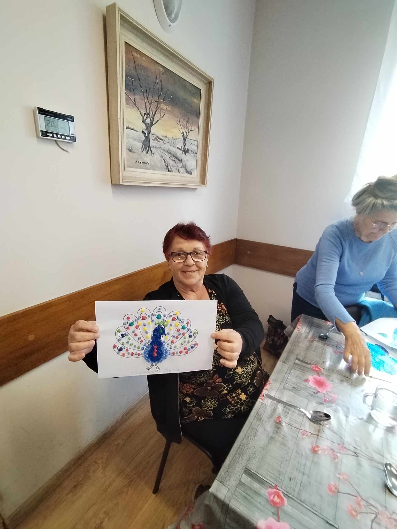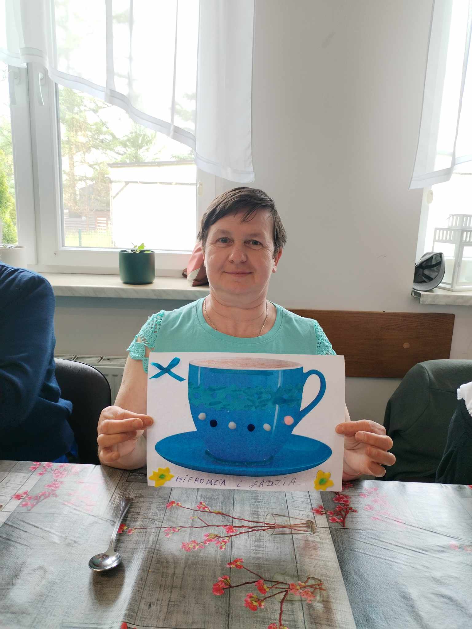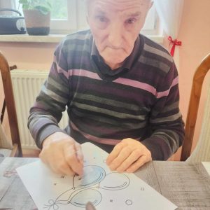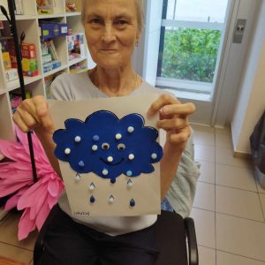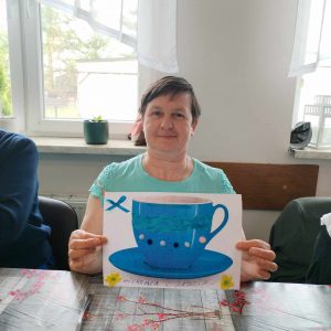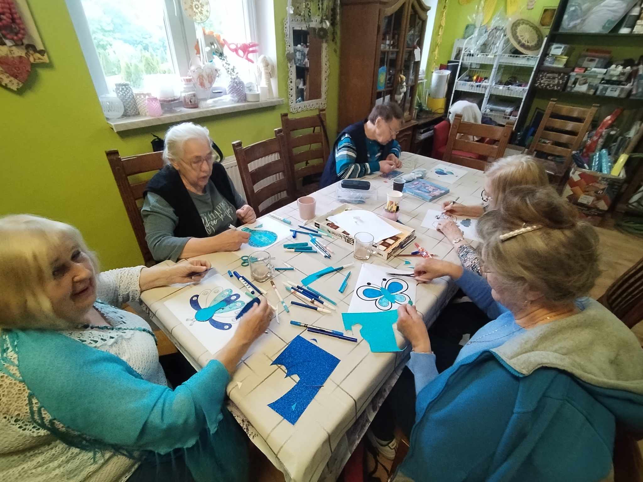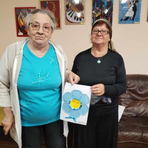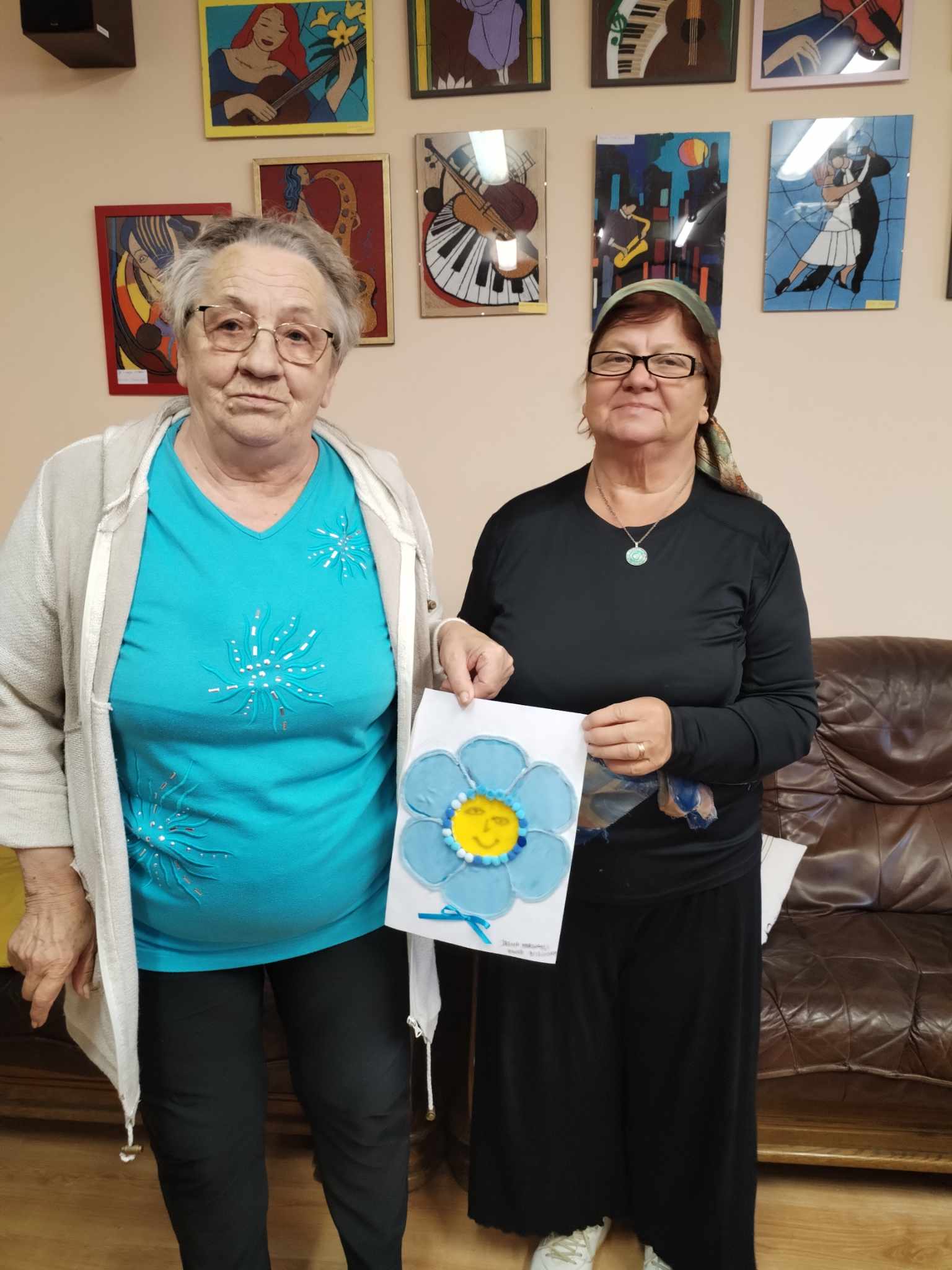 Dlatego też, podczas kolejnego kreatywnego czwartku nasi uczestnicy mieli za zadanie ozdobić obrazki w różnych odcieniach koloru niebieskiego takimi technikami jak: wyklejanie włóczką, filcem, kolorowanie kredką, malowanie farbami. Dzięki czemu powstały ciekawe i kreatywne obrazy, które uczestnicy zaprezentowali podczas pogadanki na temat koloru niebieskiego. Wszystkie prace znalazły swoje miejsce na wystawie.
