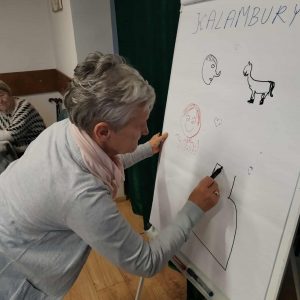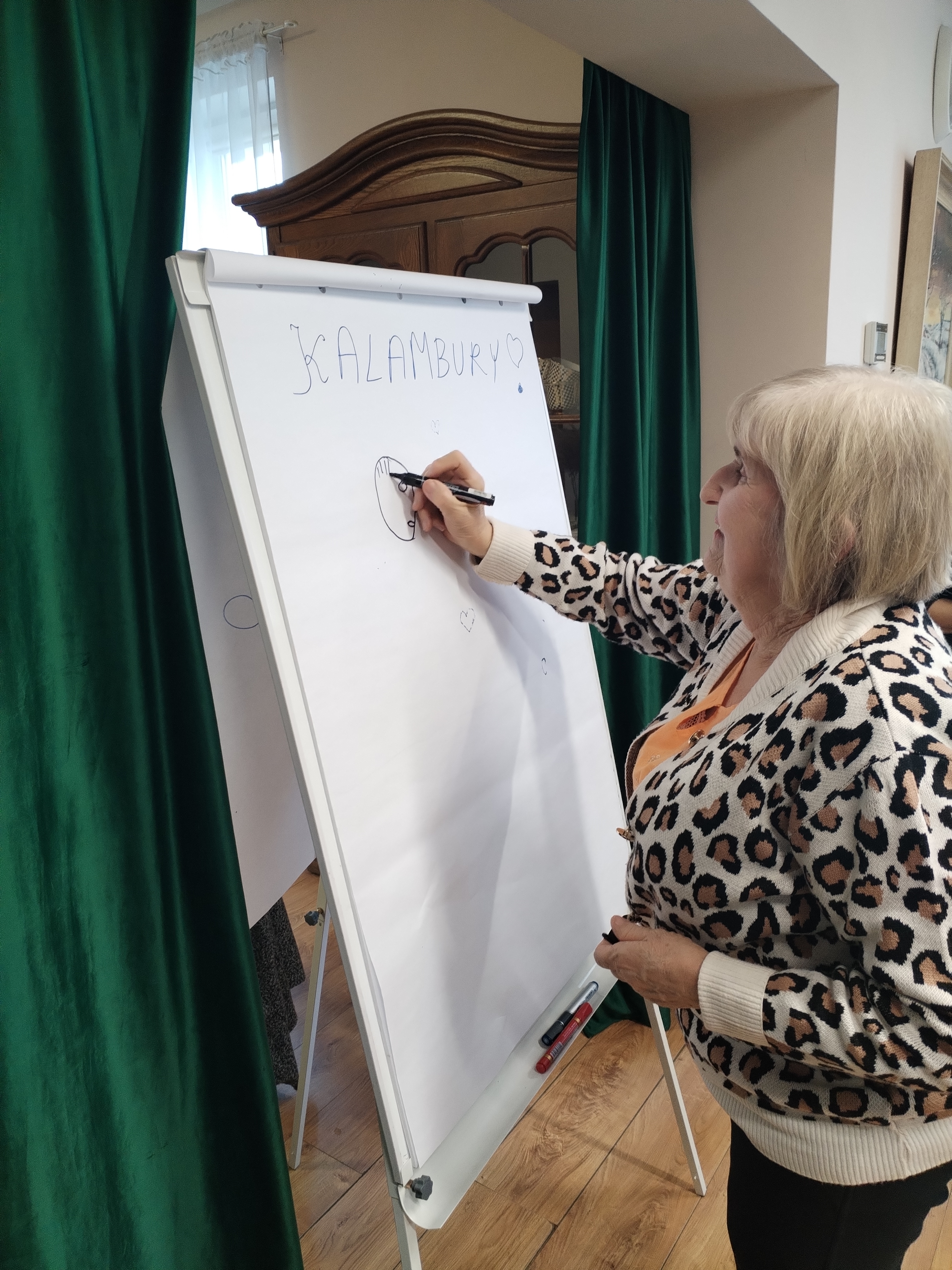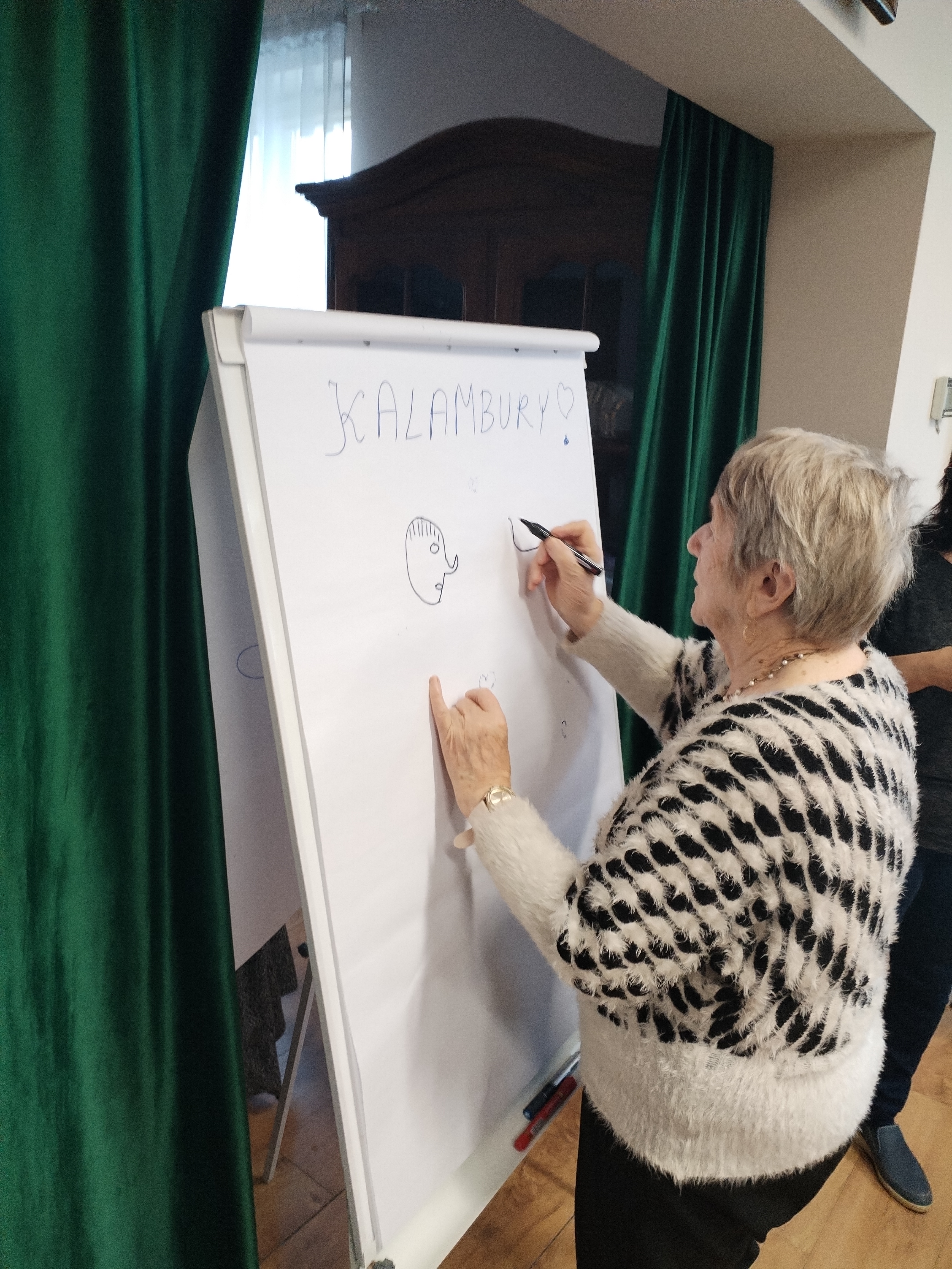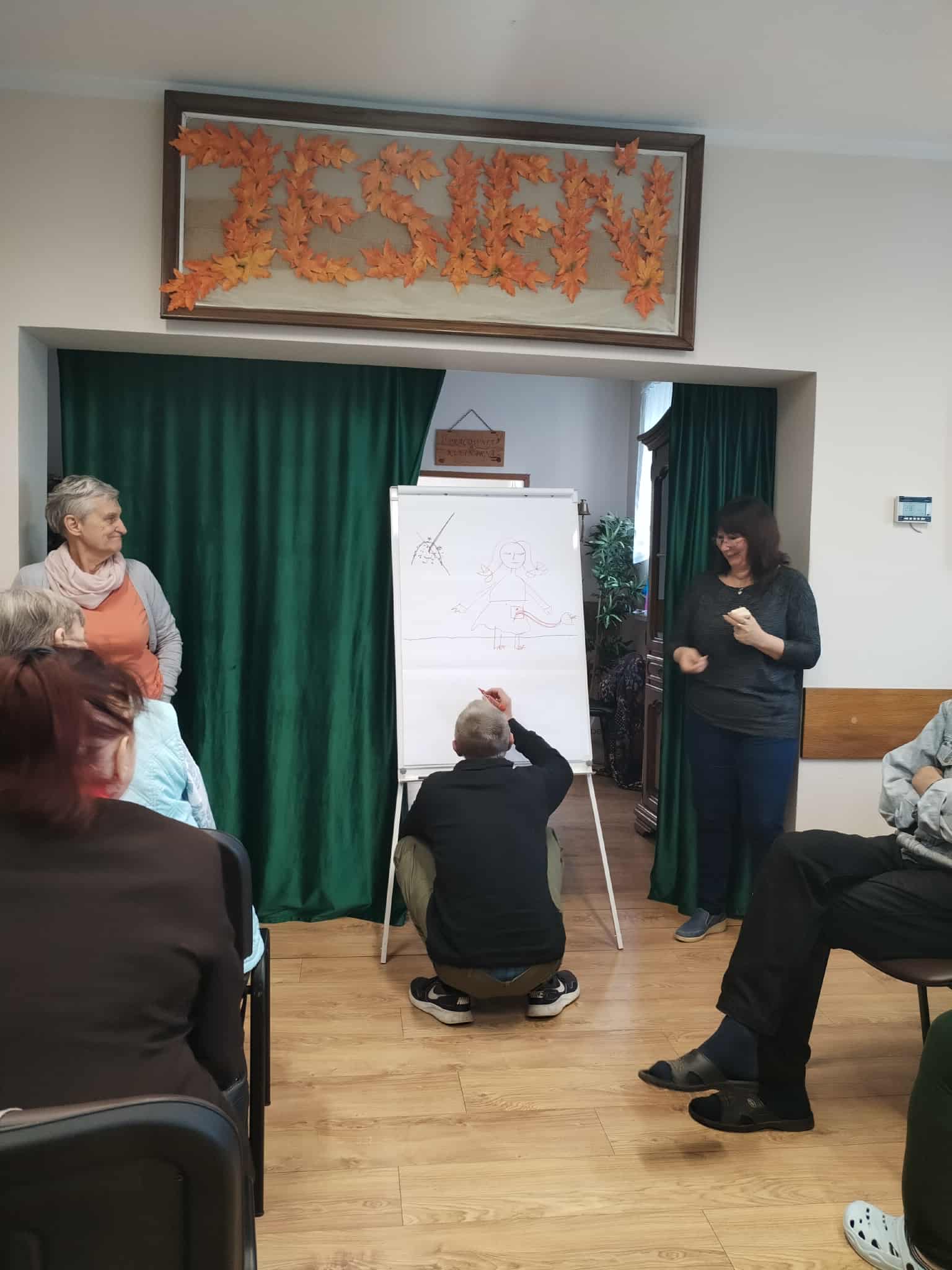 To zajęcia, podczas których seniorzy pokazywali lub rysowali wylosowane hasła, a reszta grupy starała się je jak najszybciej odgadnąć.