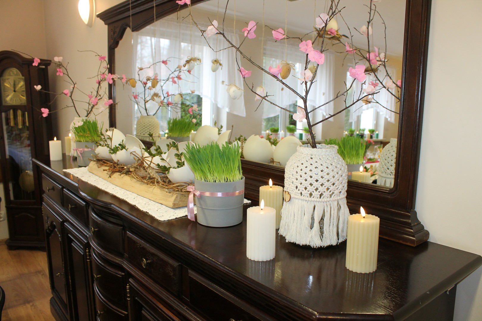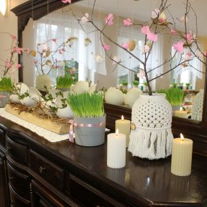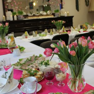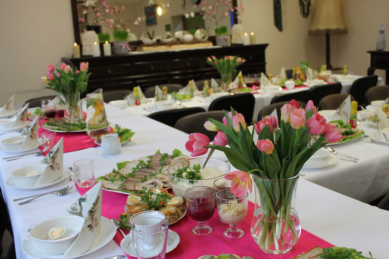 Uroczyste Śniadanie Wielkanocne w Śds w Marcinkowie ma zawsze wyjątkowy, pełen ciepła i radości charakter. Sala została pięknie udekorowana- dominowały naturalne ozdoby z owsa, gałązek z delikatnymi, różowymi kwiatami. Na stołach pojawiły się urokliwe, różowe tulipany, idealnie komponujące się z bieżnikami w tym samym kolorze. Całości dopełniało klimatyczne światło świec, które wprowadzało nastrojową, świąteczną atmosferę.