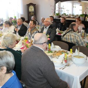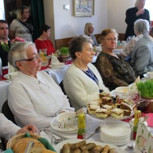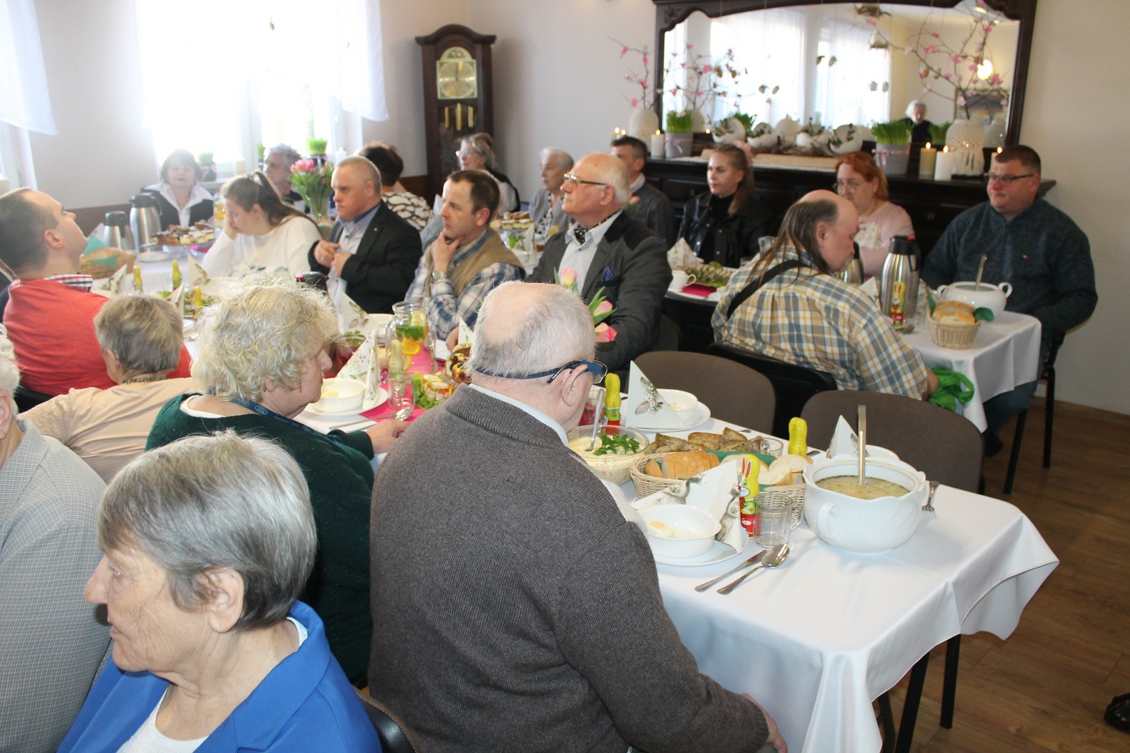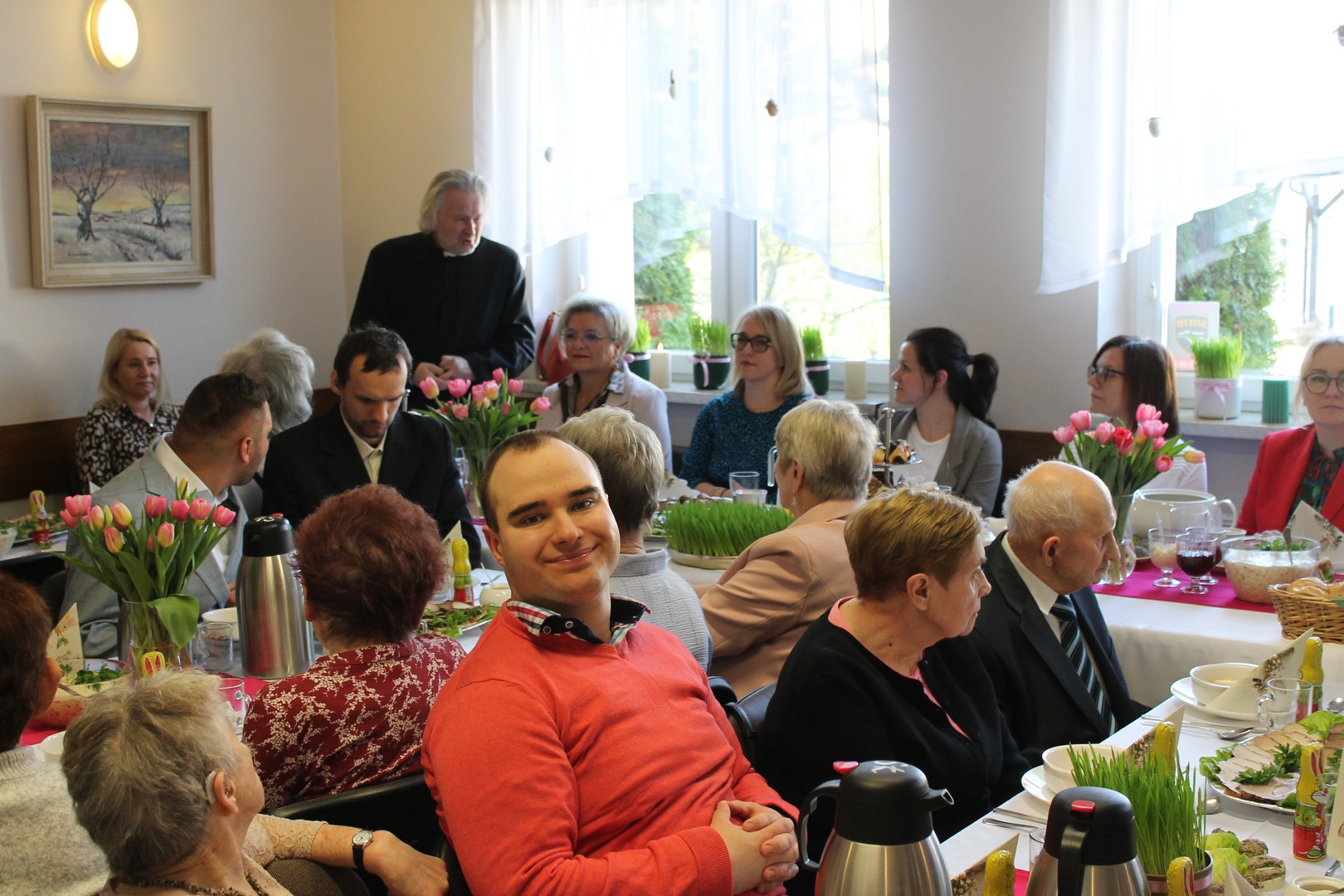 Po uczcie duchowej przyszedł czas na uroczyste śniadanie. Ksiądz Krzysztof pobłogosławił zebranych oraz świąteczne potrawy, składając wszystkim z serca płynące życzenia. Na stołach nie zabrakło tradycyjnych przysmaków- aromatycznego żurku, pieczonej białej kiełbasy, faszerowanych jajek, sałatki jarzynowej, różnorodnych pieczonych mięs i pasztetów, galaretki drobiowej oraz pysznych, domowych wypieków.