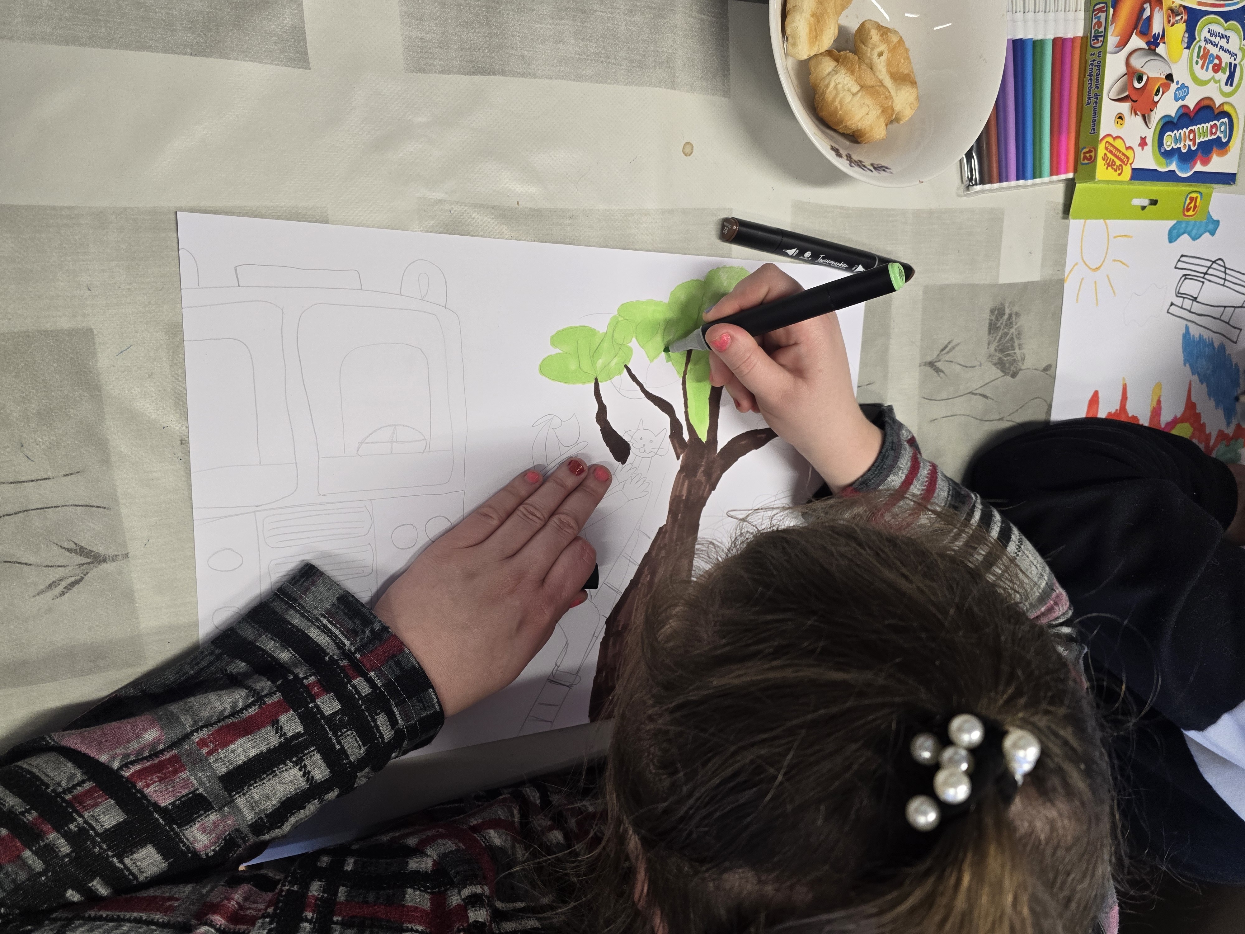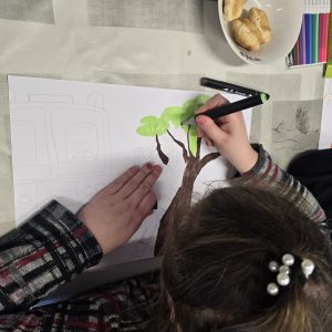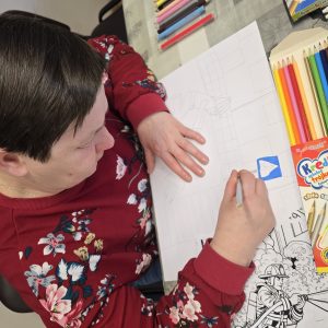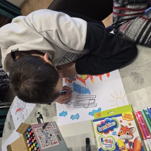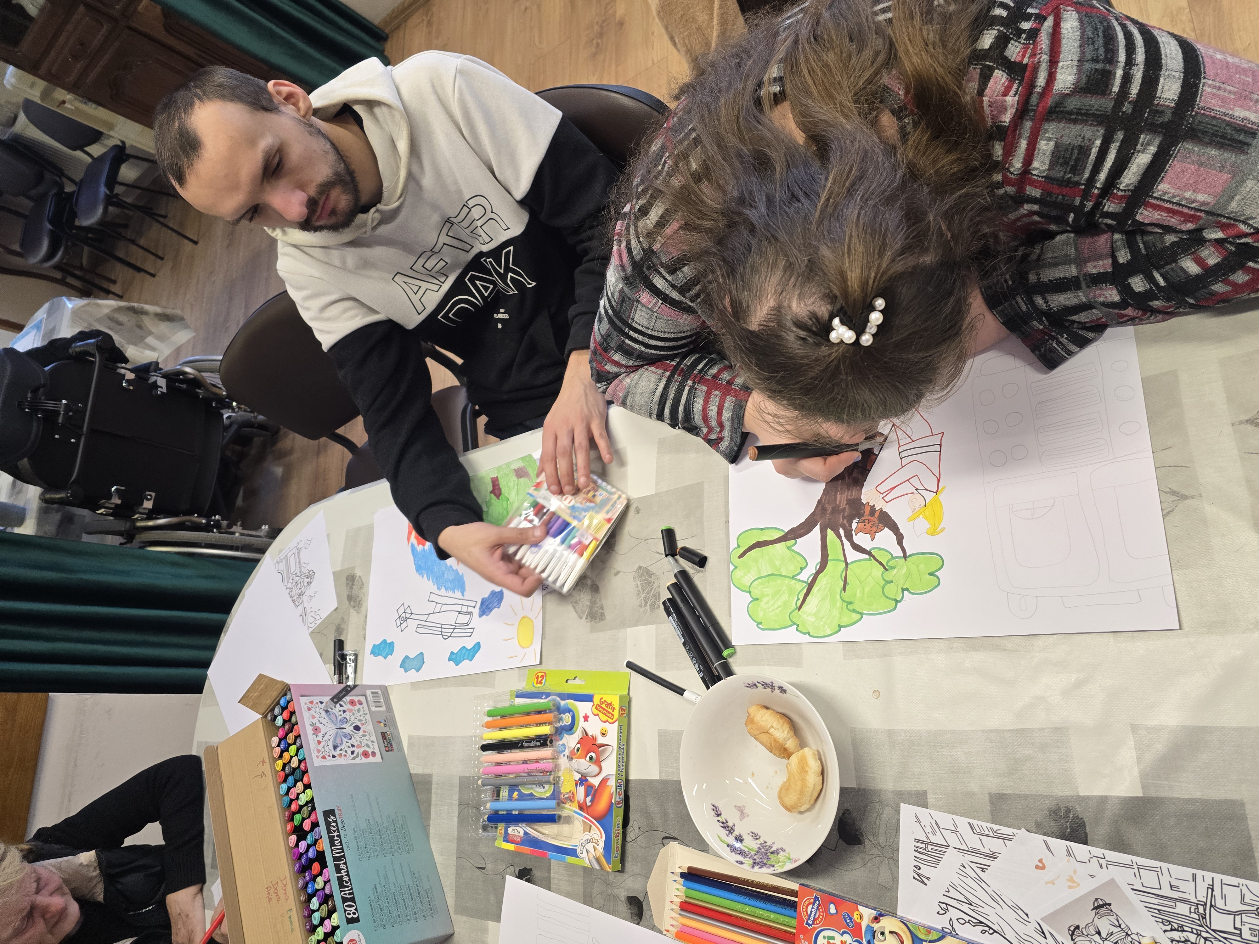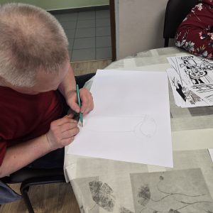 Chętne osoby otrzymały niezbędne materiały plastyczne, takie jak: mazaki, kredki, cienkopisy, markery oraz kartki z bloku technicznego. Uczestnicy samodzielnie dobierali tematykę i technikę pracy, a prowadzący udzielał wsparcia i motywował do twórczej ekspresji.