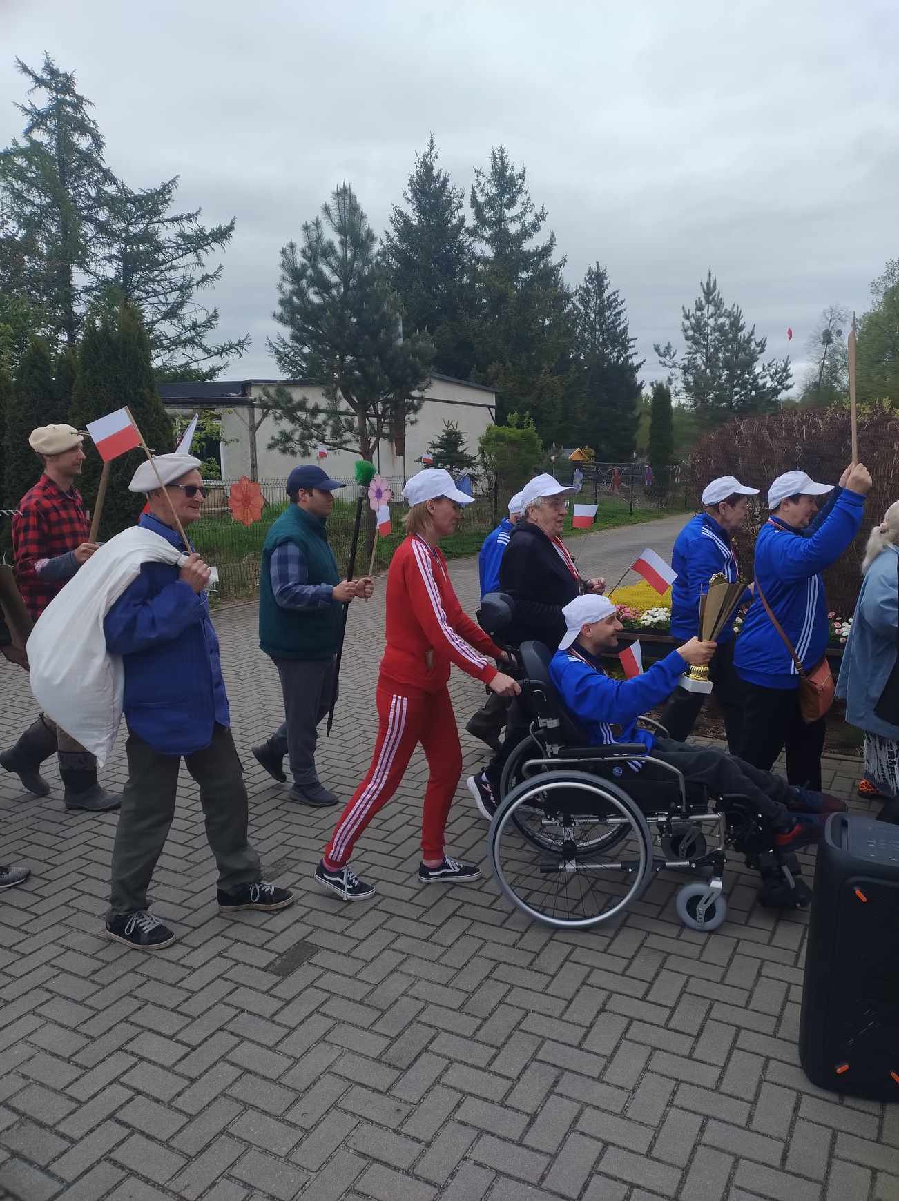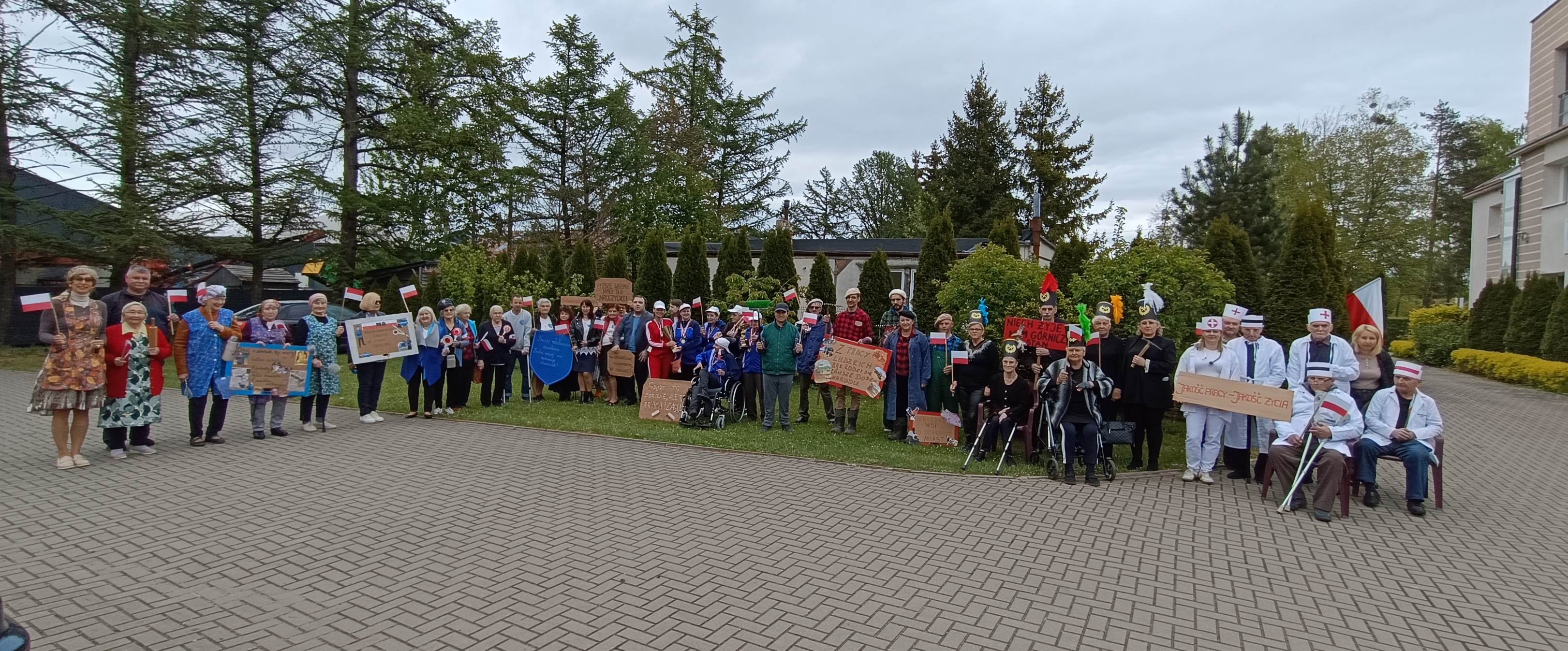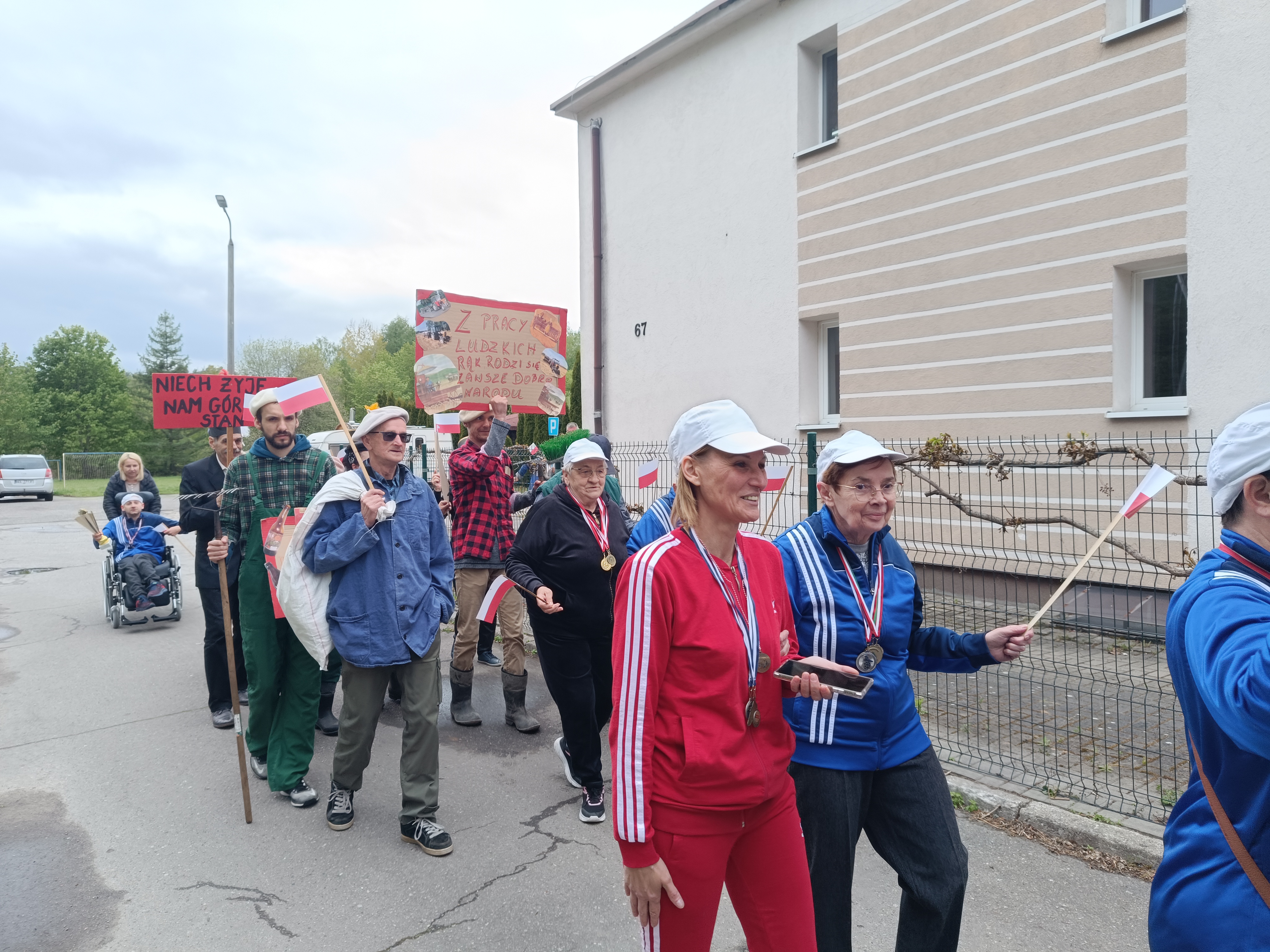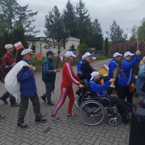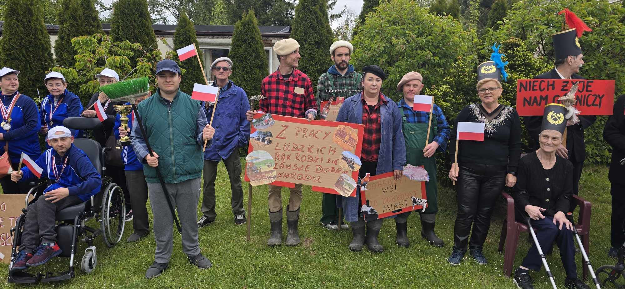 Każda z pracowni dała z siebie wszystko i można było wyczuć w naszym domu atmosferę Pochodu Majowego. Po uroczystym odsłuchaniu hymnu Polski każdy z przedstawicieli grup pracowniczych uroczyście przemaszerował po terenie Środowiskowego Domu Samopomocy i okolicy uroczyście wymachując to albo własnoręcznie przygotowanymi transparentami lub flagami. Najbardziej rzucały się w oczy wspaniałe przebrania, które przygotowały w pracownie.