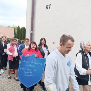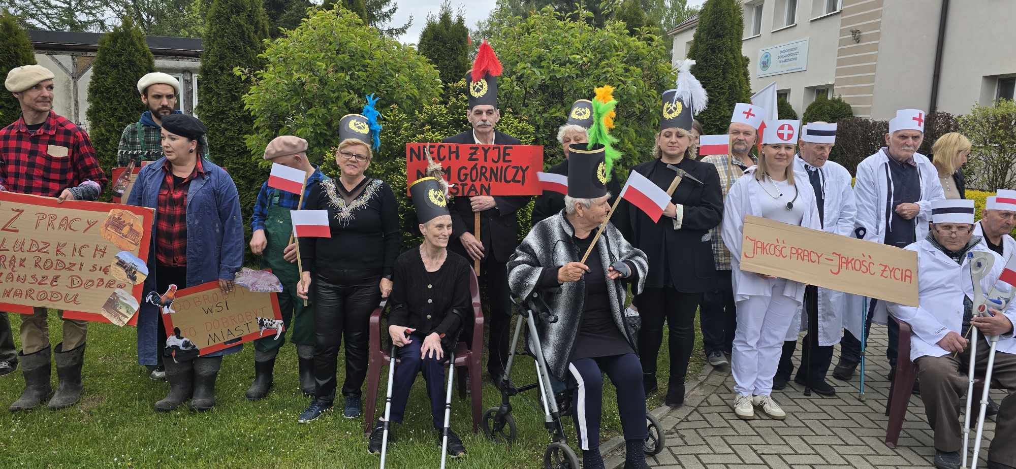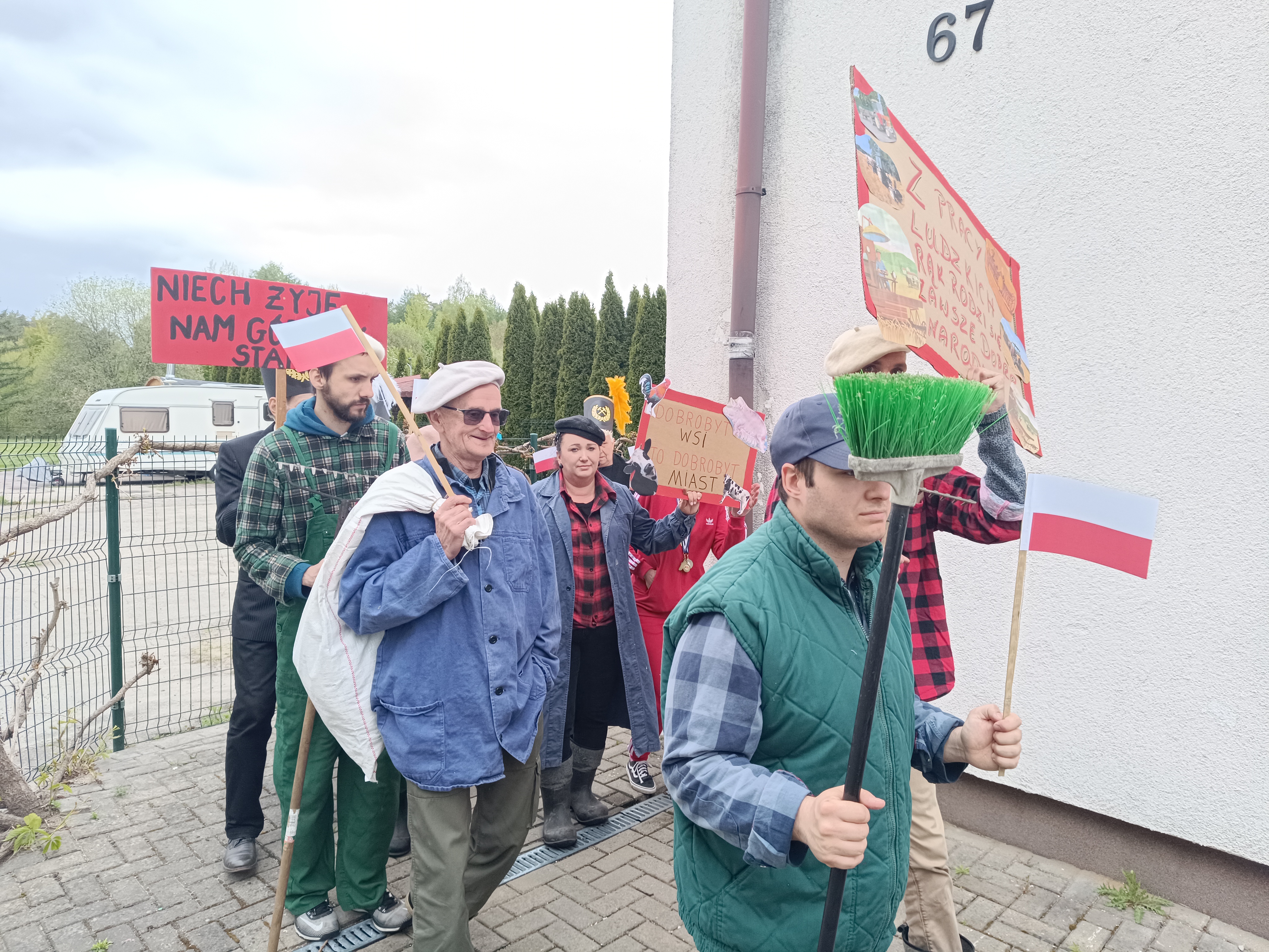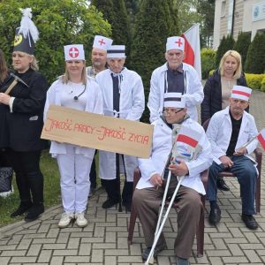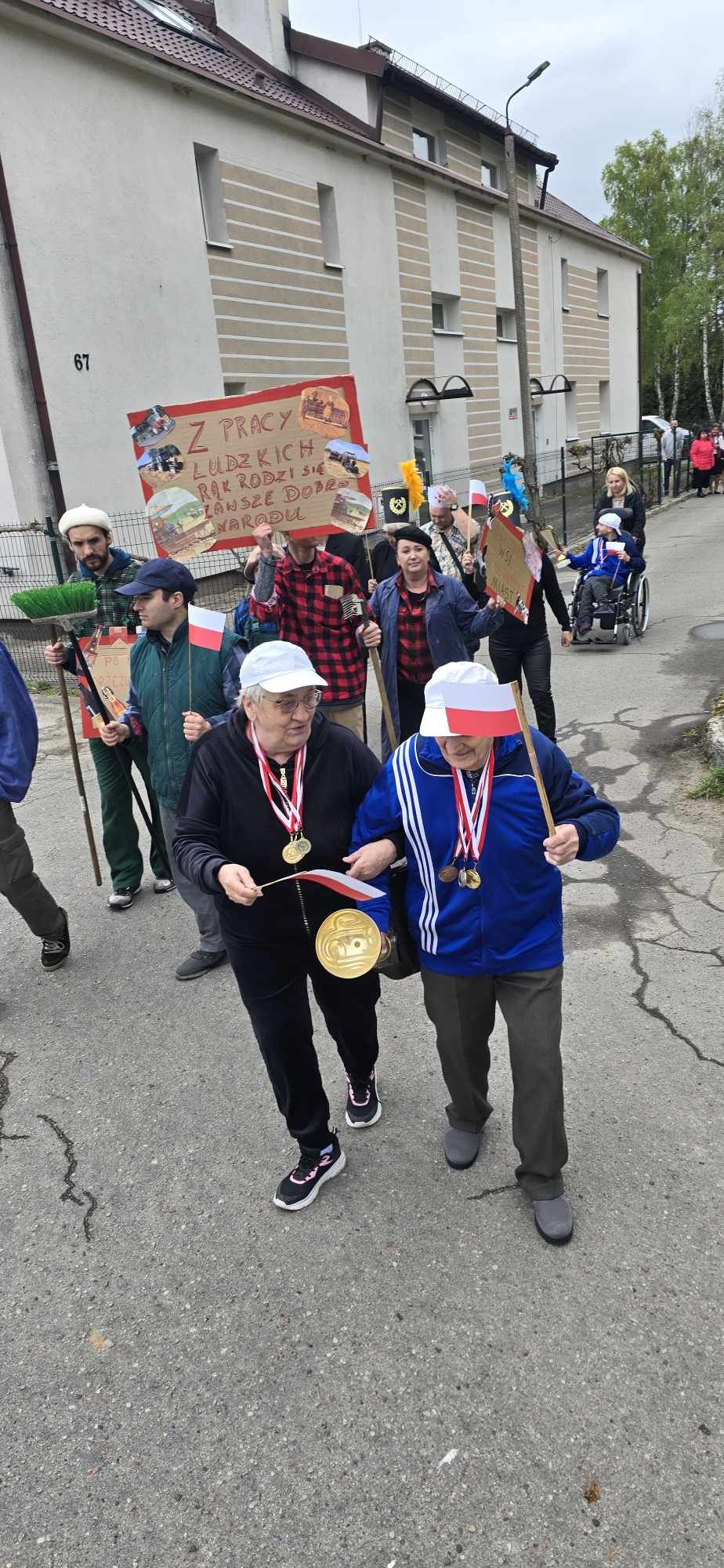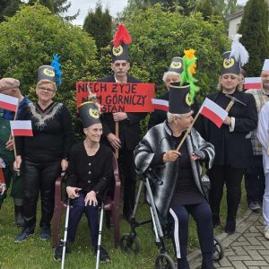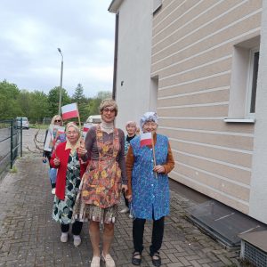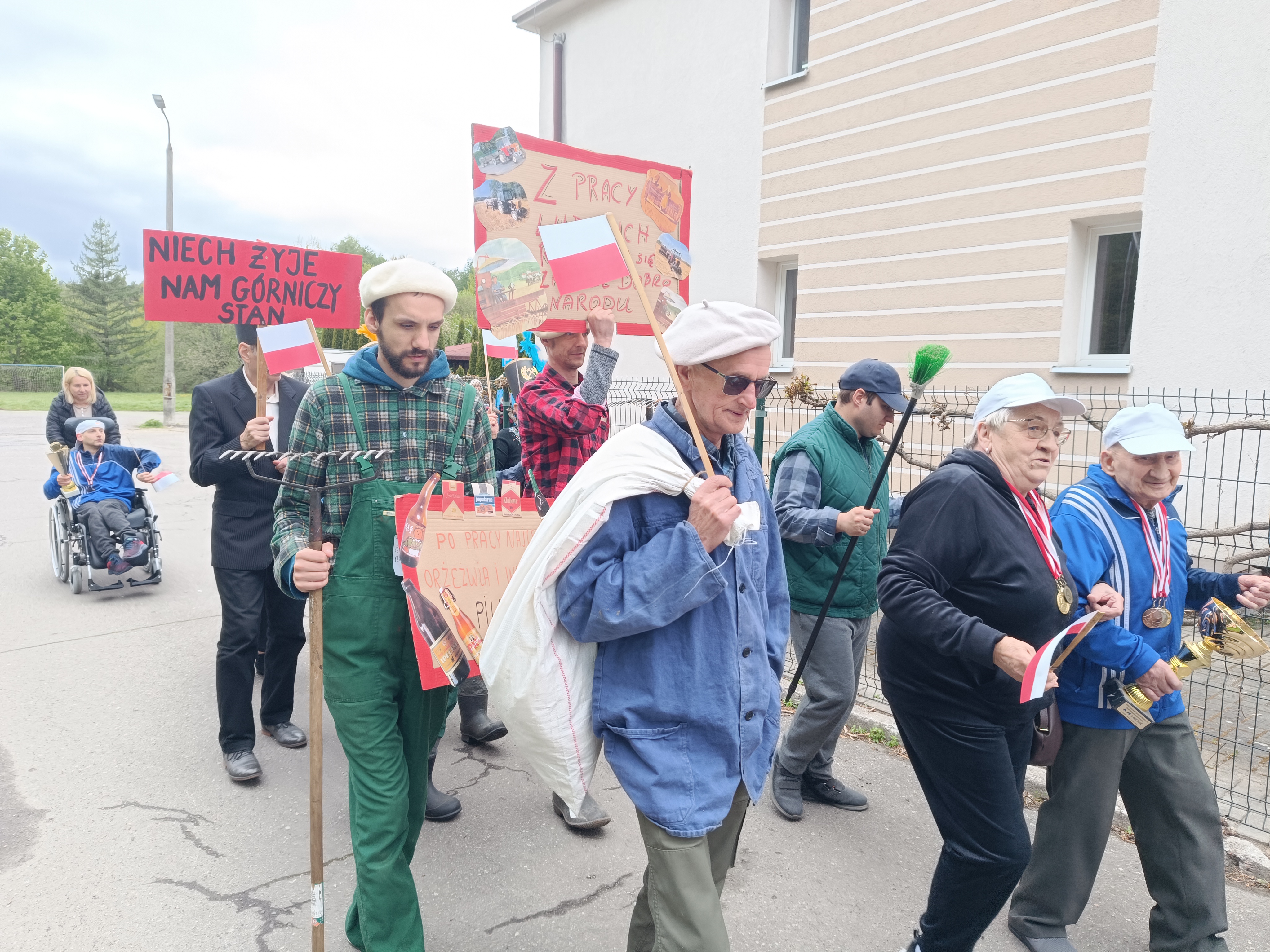 Każda z pracowni dała z siebie wszystko i można było wyczuć w naszym domu atmosferę Pochodu Majowego. Po uroczystym odsłuchaniu hymnu Polski każdy z przedstawicieli grup pracowniczych uroczyście przemaszerował po terenie Środowiskowego Domu Samopomocy i okolicy uroczyście wymachując to albo własnoręcznie przygotowanymi transparentami lub flagami. Najbardziej rzucały się w oczy wspaniałe przebrania, które przygotowały w pracownie.