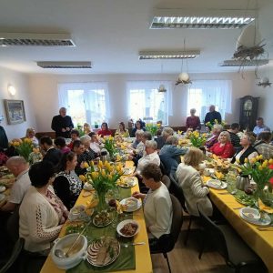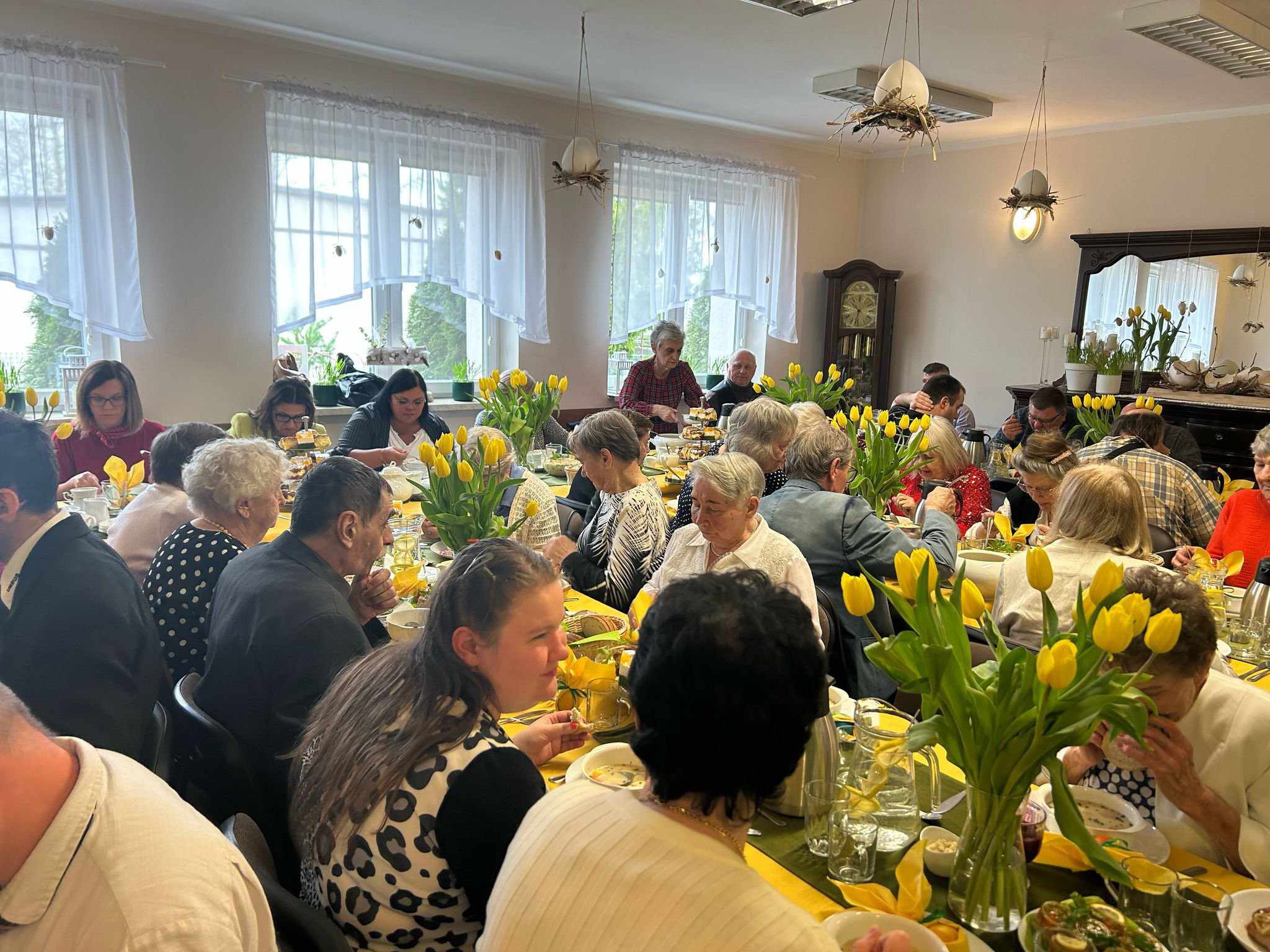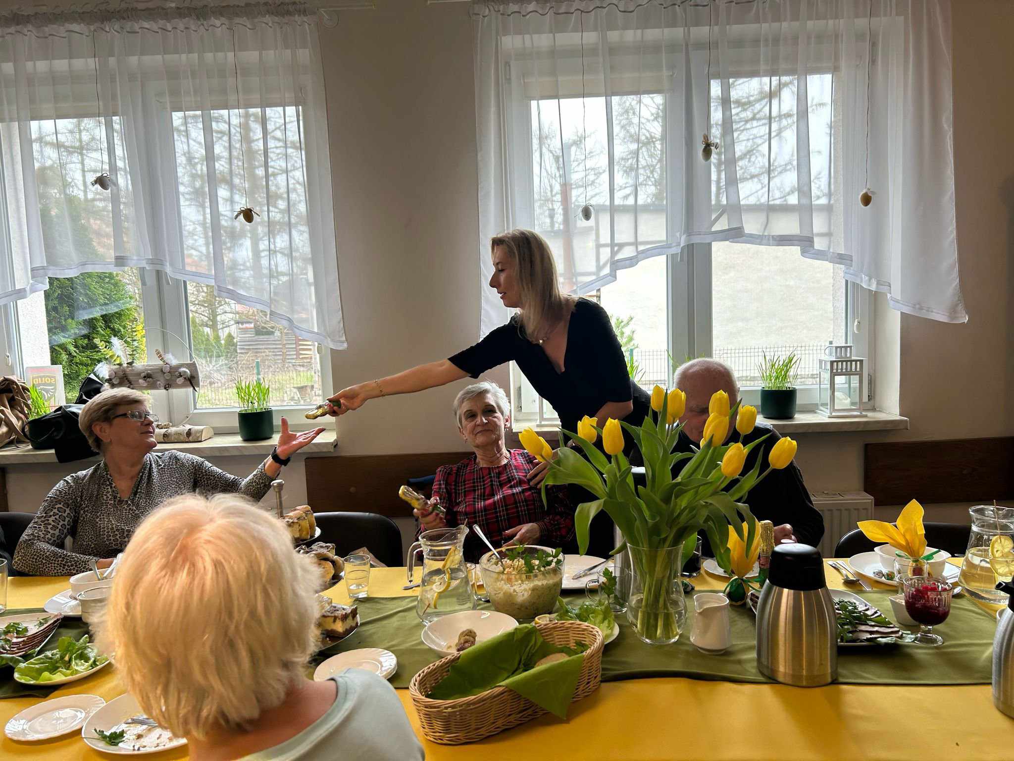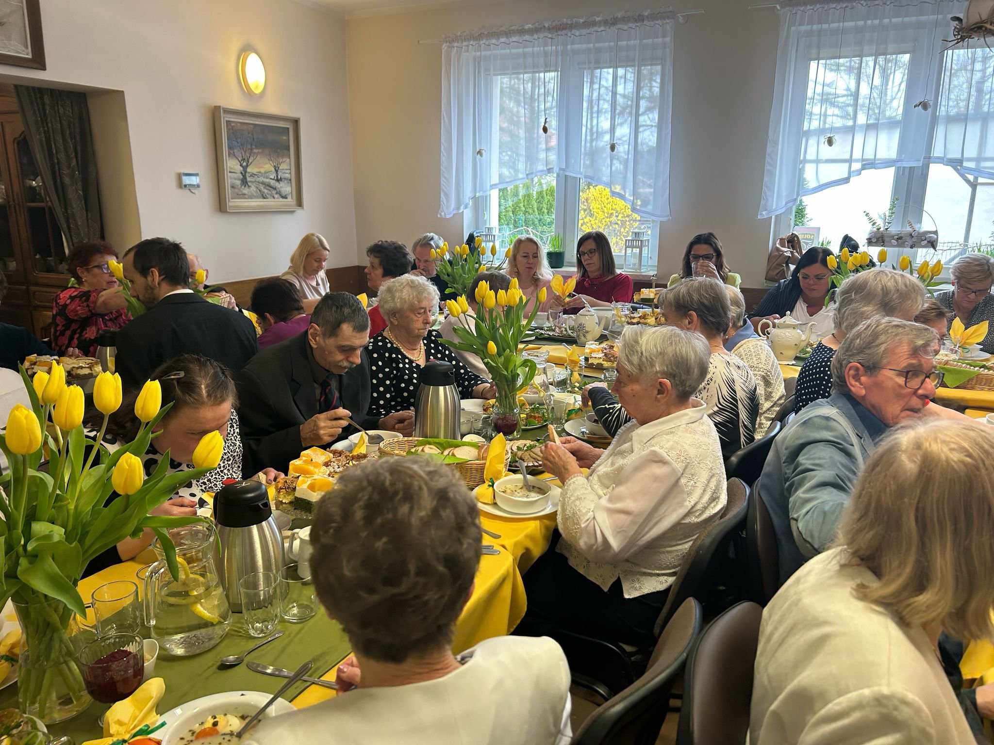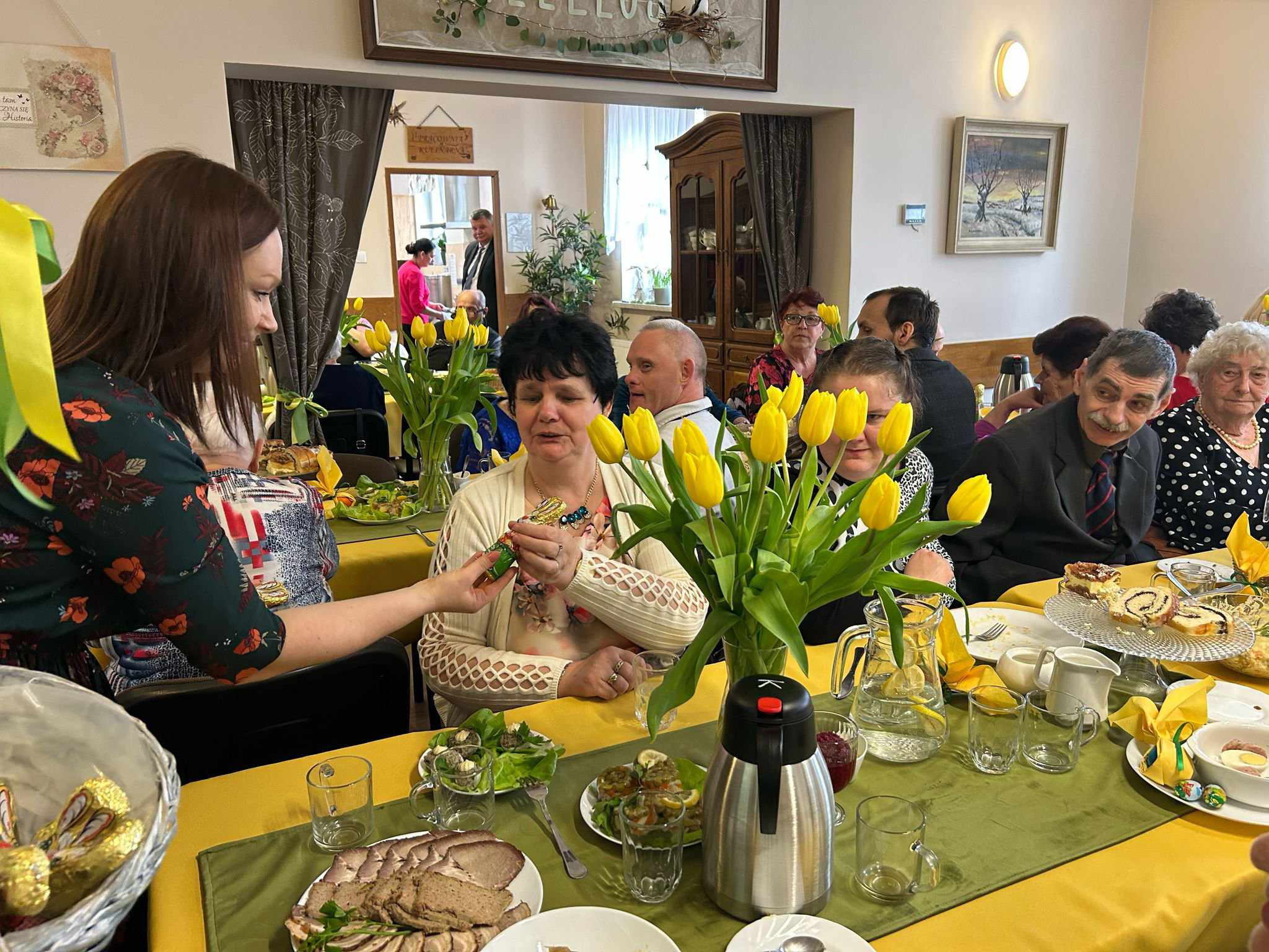 Na dzisiejszą uroczystość przybyli przedstawiciele Urzędu Gminy w Purdzie, Ośrodków Pomocy Społecznej w Purdzie i Pasymiu oraz proboszcz naszej parafii. Uczestnicy odświętnie ubrani, w radosnych nastrojach oraz zaproszeni goście zostali przywitani przez kierownika Joannę Obidzińską i zaproszeni do obejrzenia przygotowanej części artystycznej, która wprowadziła wszystkich w nastrój zadumy, refleksji i pewnego rodzaju nostalgię. Piękne i pełne emocji pieśni śpiewane przy akompaniamencie gitary były swoistą ucztą dla naszych zmysłów, po której przyszedł czas na ucztę dla ciała. Aromatyczny żurek, pieczona biała kiełbasa, sałatka jarzynowa, pieczone mięsa, pasztety, faszerowane jajka oraz drobiowa galareta zachęcały do degustacji. Dopełnieniem były wielkanocne wypieki w towarzystwie aromatycznej kawy i herbaty. Nie zabrakło wspólnych rozmów, których gwar roznosił się po całym domu dając odczucie iście rodzinnej, domowej atmosfery. Prezent w postaci czekoladowych zajączków, którymi zostali obdarowani uczestnicy były symbolem radości z nadchodzących Świąt Wielkanocnych.