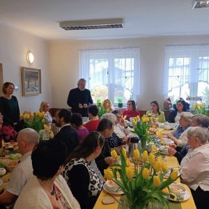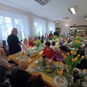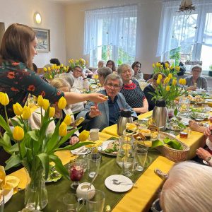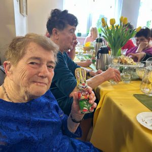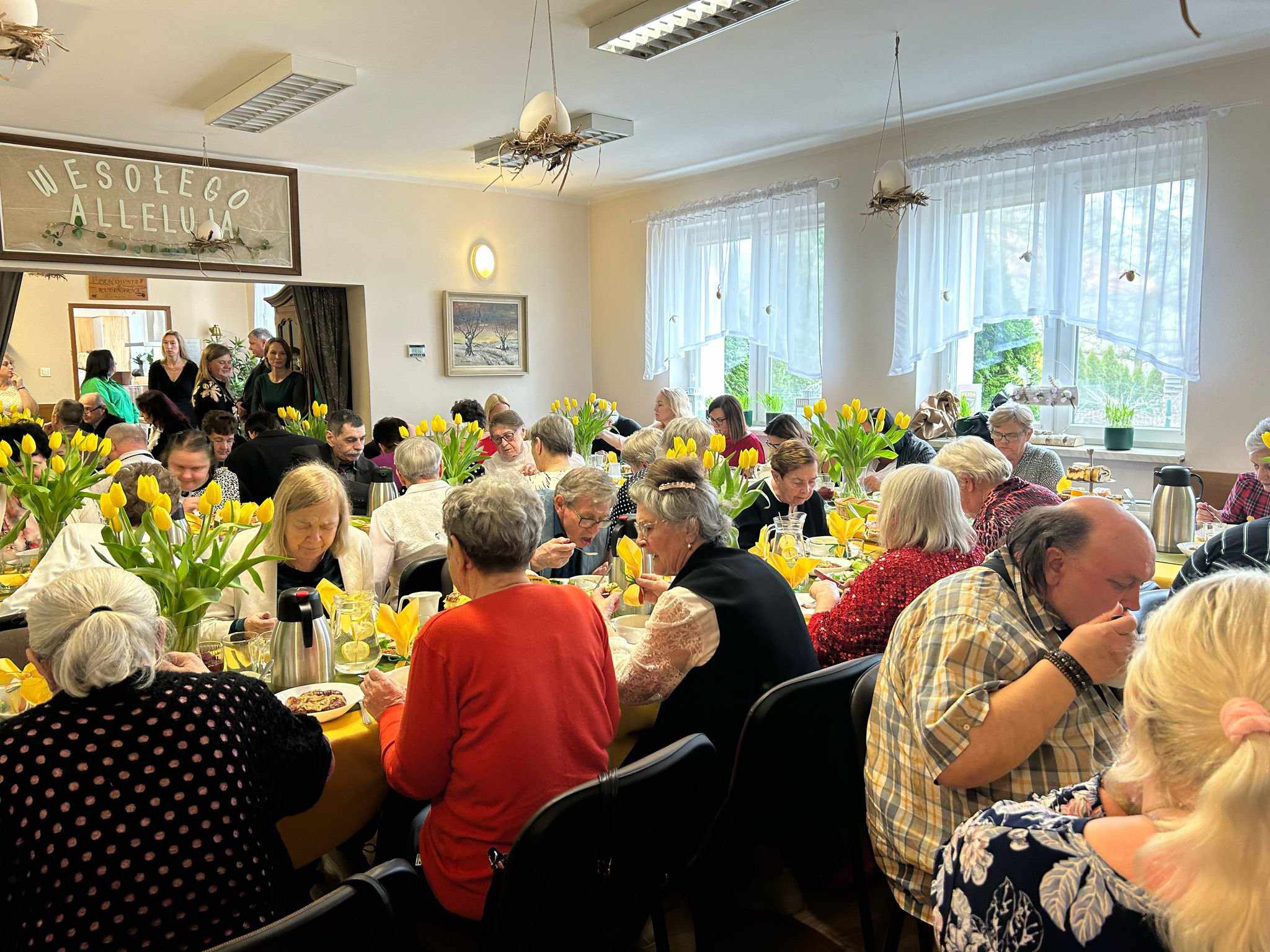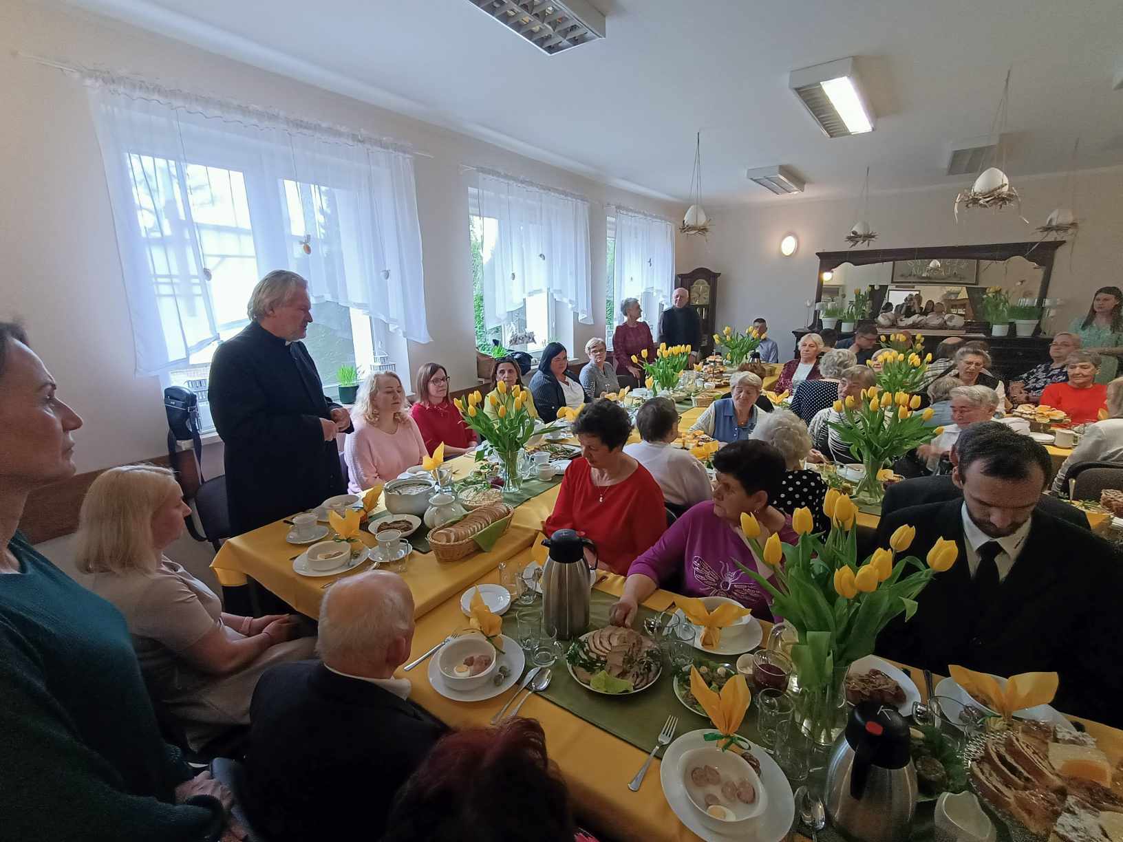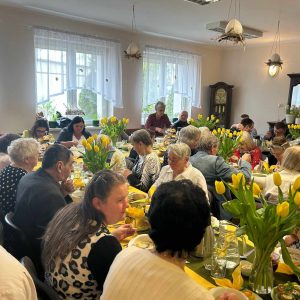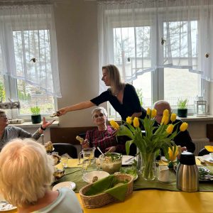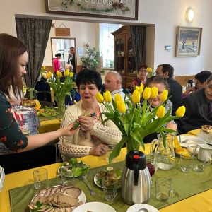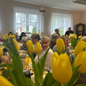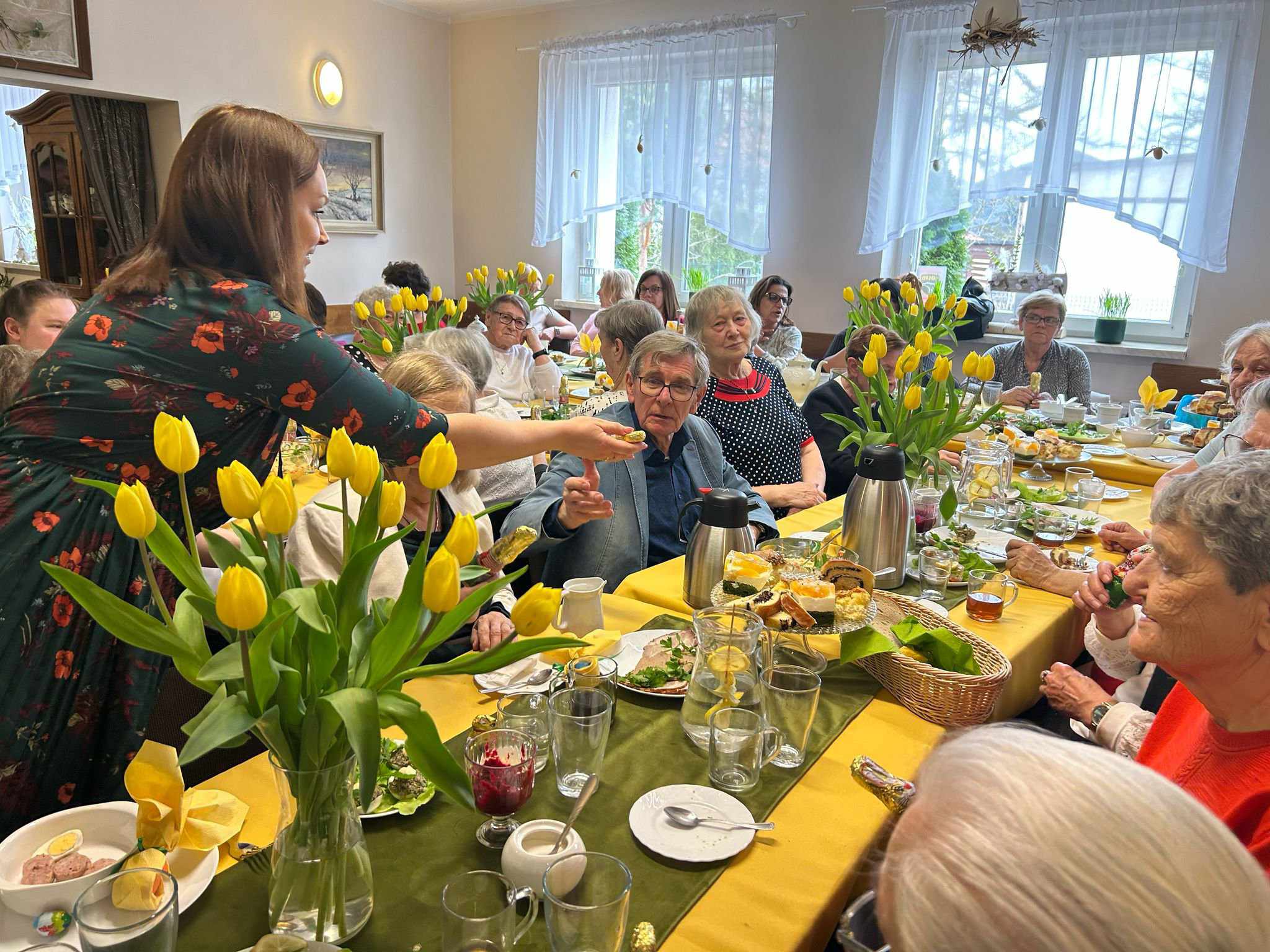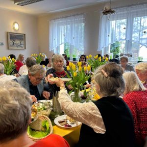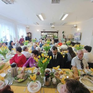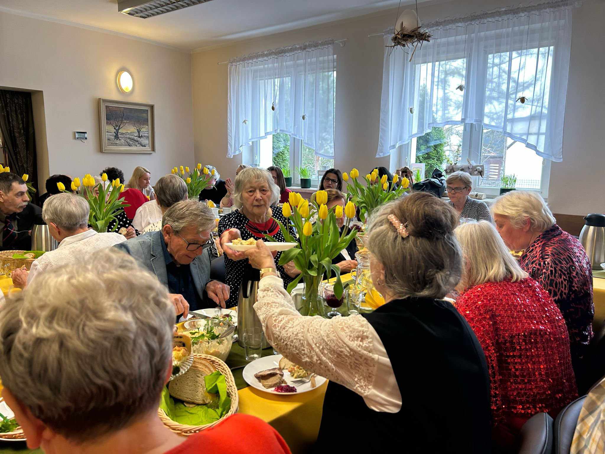 Na dzisiejszą uroczystość przybyli przedstawiciele Urzędu Gminy w Purdzie, Ośrodków Pomocy Społecznej w Purdzie i Pasymiu oraz proboszcz naszej parafii. Uczestnicy odświętnie ubrani, w radosnych nastrojach oraz zaproszeni goście zostali przywitani przez kierownika Joannę Obidzińską i zaproszeni do obejrzenia przygotowanej części artystycznej, która wprowadziła wszystkich w nastrój zadumy, refleksji i pewnego rodzaju nostalgię. Piękne i pełne emocji pieśni śpiewane przy akompaniamencie gitary były swoistą ucztą dla naszych zmysłów, po której przyszedł czas na ucztę dla ciała. Aromatyczny żurek, pieczona biała kiełbasa, sałatka jarzynowa, pieczone mięsa, pasztety, faszerowane jajka oraz drobiowa galareta zachęcały do degustacji. Dopełnieniem były wielkanocne wypieki w towarzystwie aromatycznej kawy i herbaty. Nie zabrakło wspólnych rozmów, których gwar roznosił się po całym domu dając odczucie iście rodzinnej, domowej atmosfery. Prezent w postaci czekoladowych zajączków, którymi zostali obdarowani uczestnicy były symbolem radości z nadchodzących Świąt Wielkanocnych.