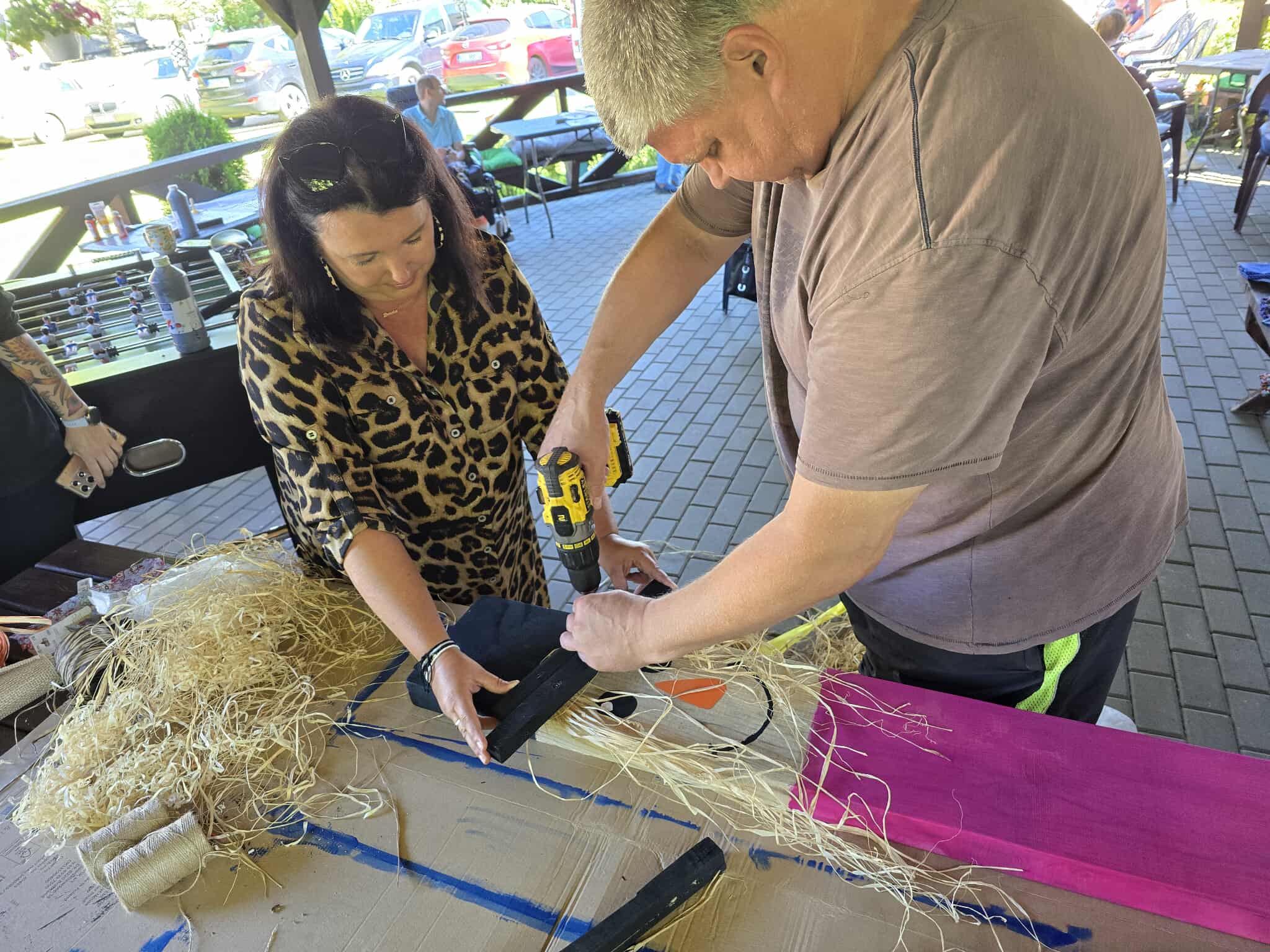 Uczestnicy otrzymali materiały do zajęć: farby akrylowe, pędzelki gąbkowe oraz kolorowe materiały i rafie naturalną, z których wykonywali drewniane ludki według instruktażu podanego przez terapeutki.