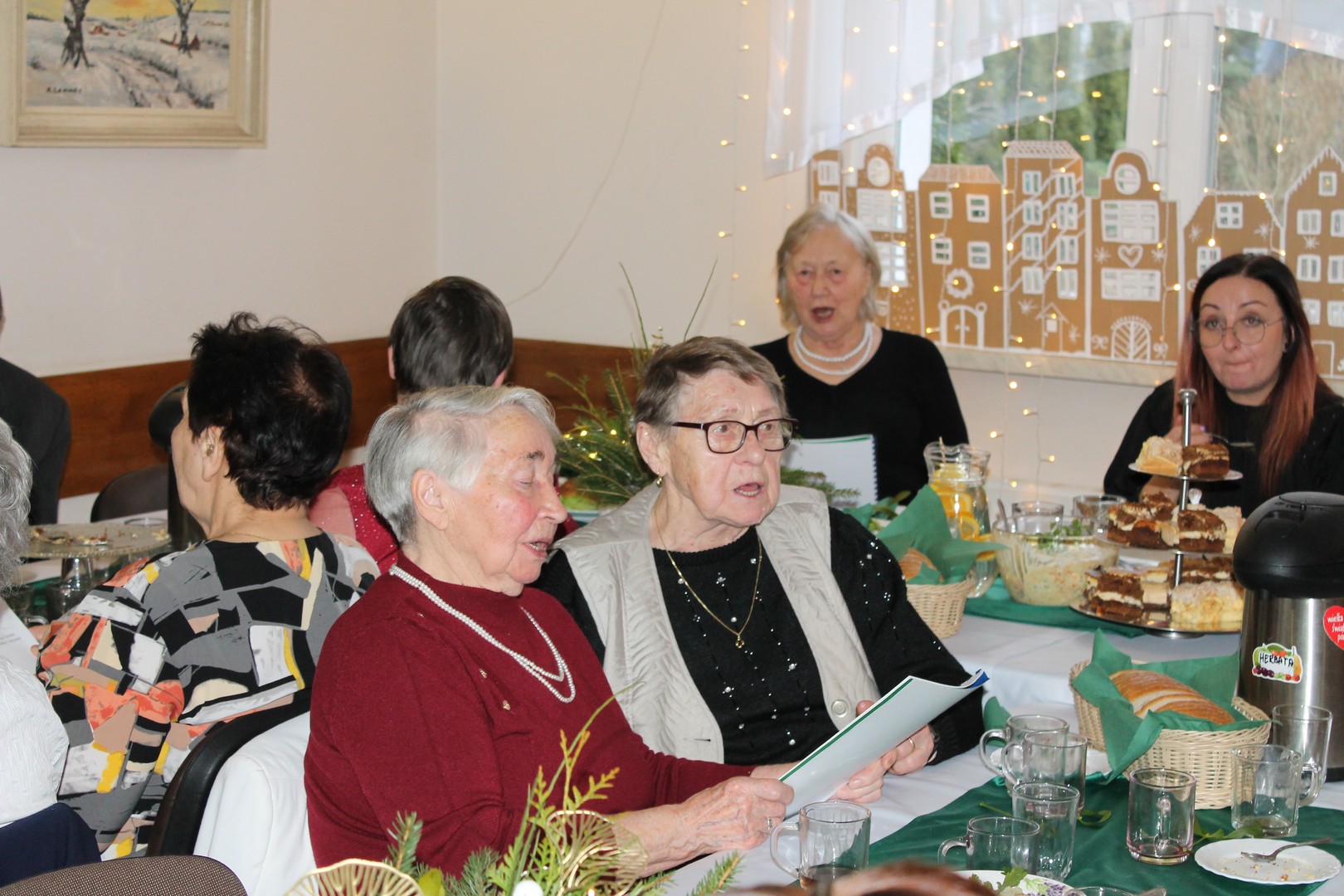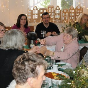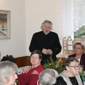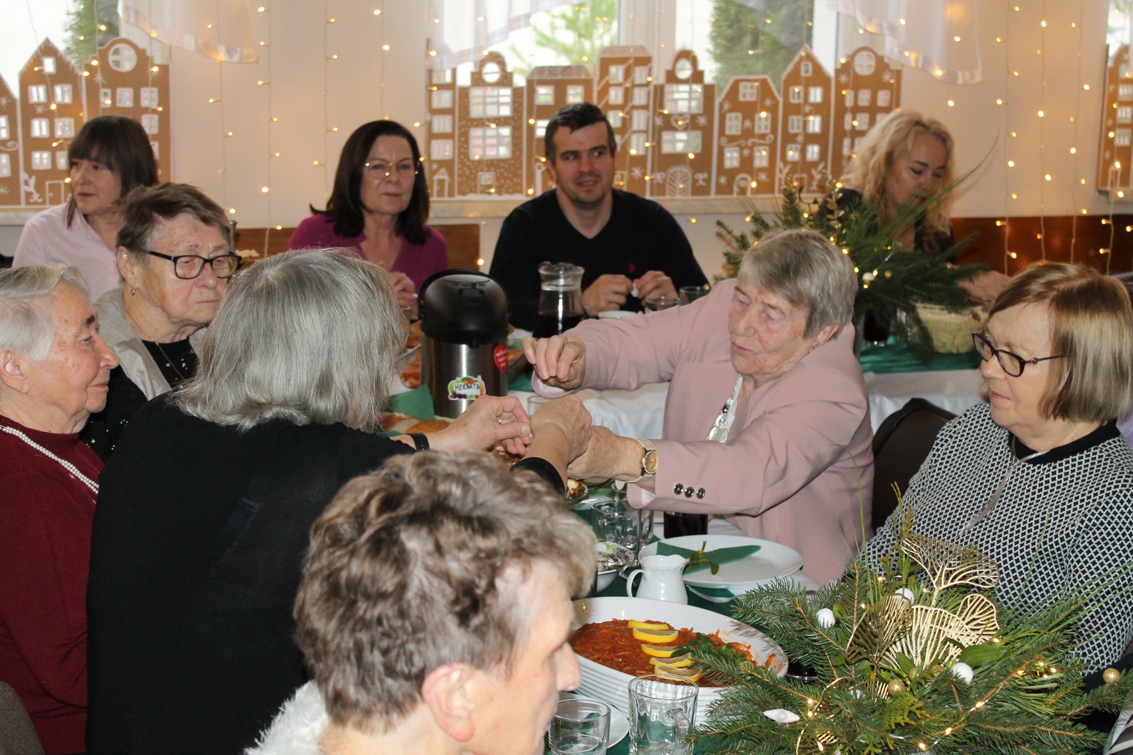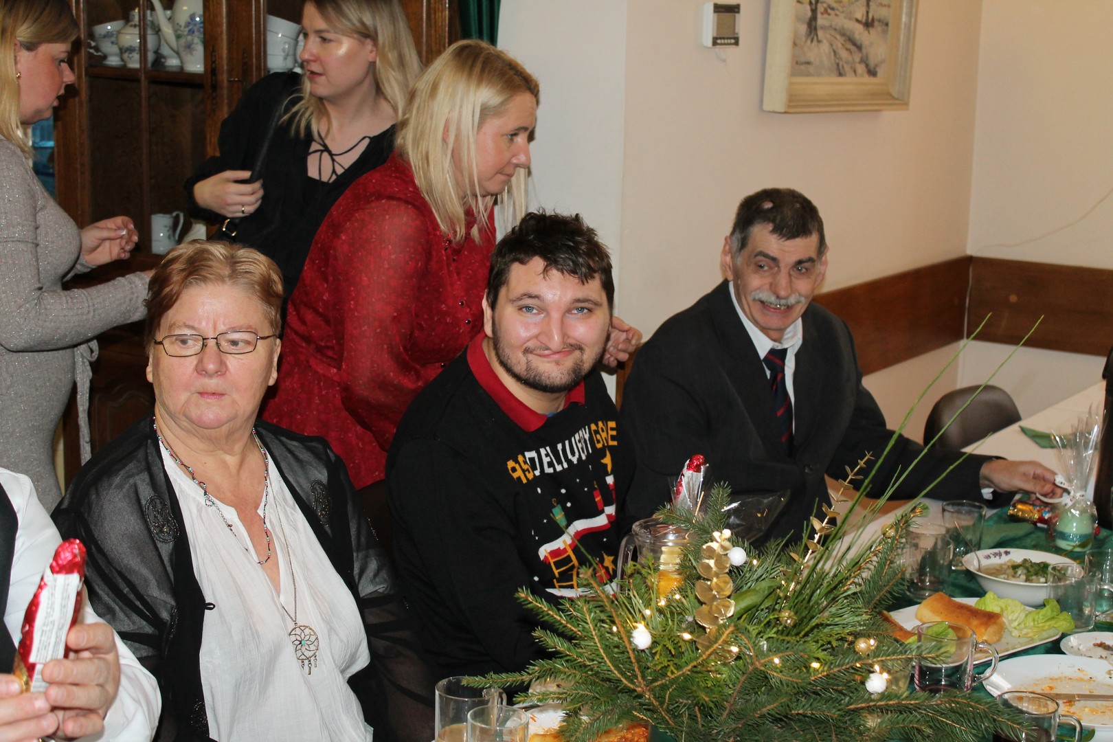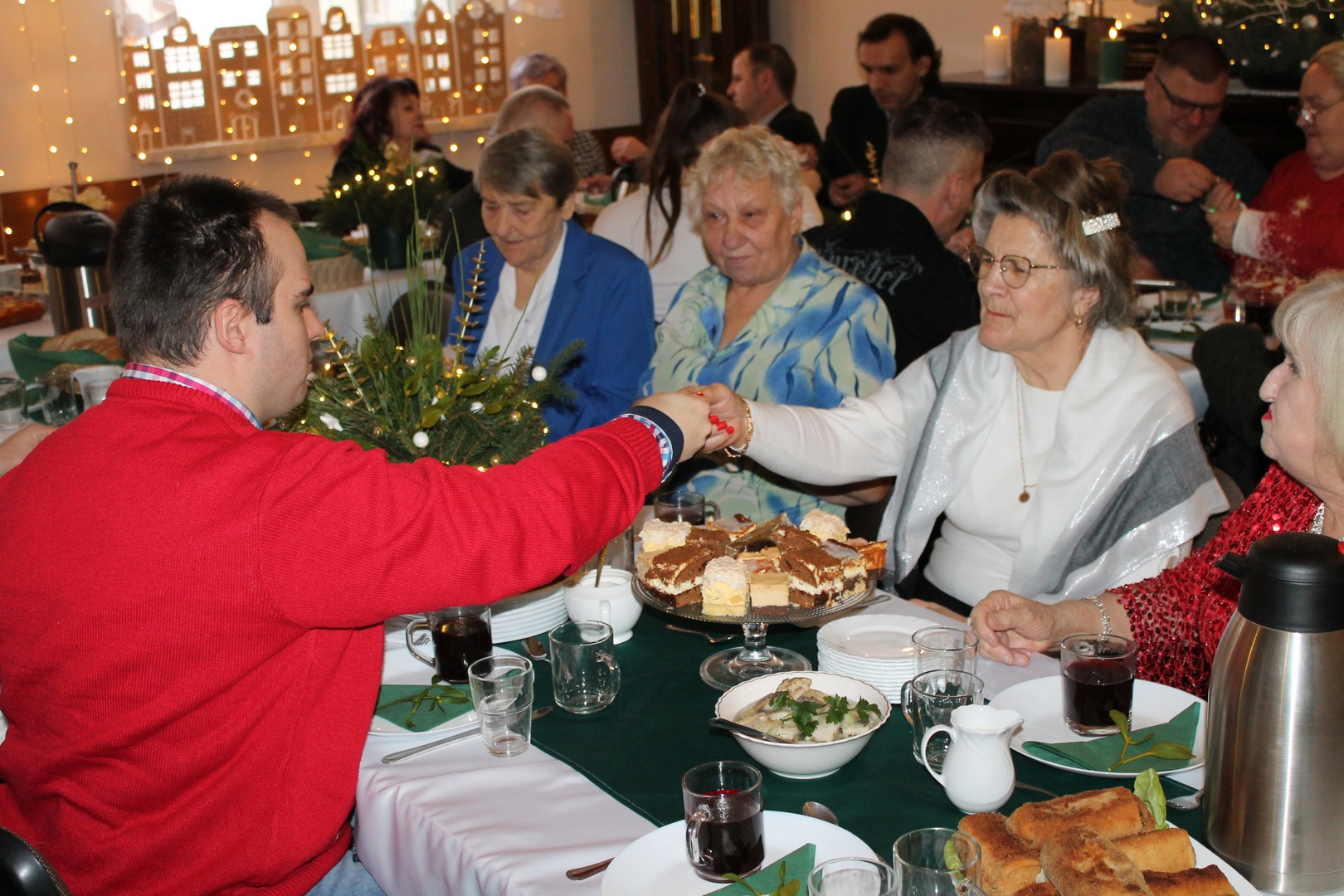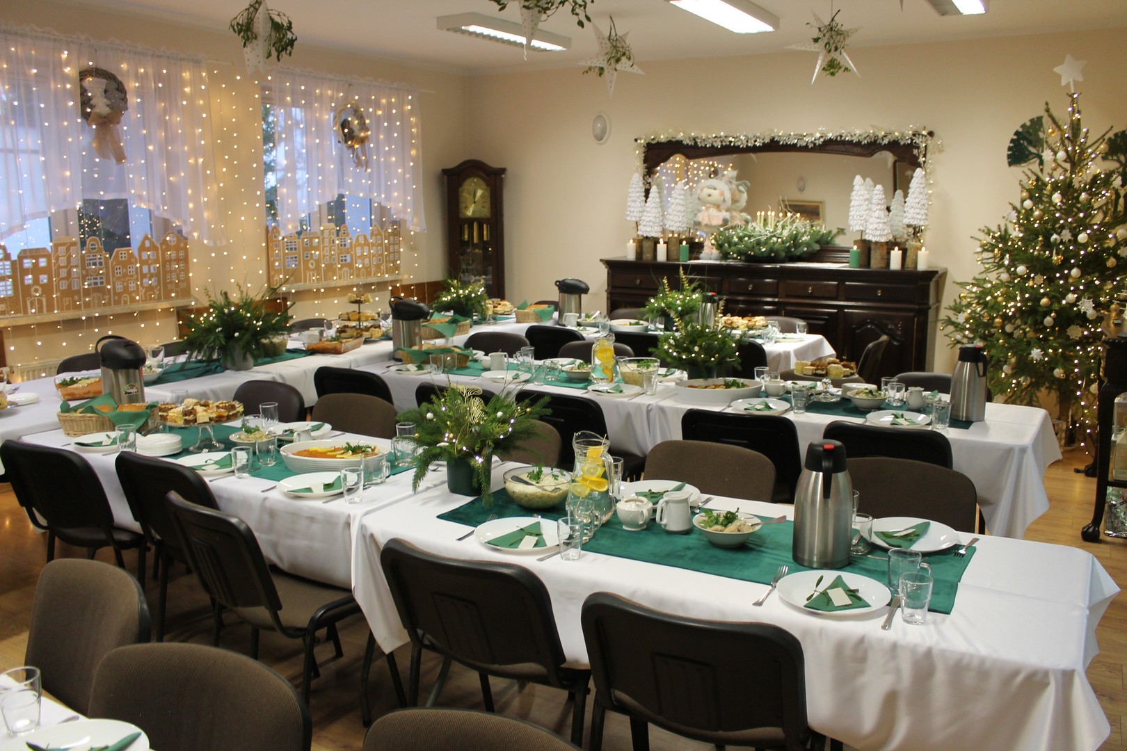 Wigilijne spotkanie rozpoczął wzruszający występ artystyczny naszych uczestników, pełen kolęd, słów, refleksji i życzliwości. Następnie wysłuchaliśmy błogosławieństwa z ust ks. proboszcza, po którym nastąpił moment dzielenia się opłatkiem – pełen wzruszeń i serdecznych uścisków. Przy odświętnie nakrytych stołach, wypełnionych tradycyjnymi potrawami wigilijnymi, spędziliśmy wspólnie czas, celebrując ten magiczny czas, pełen wdzięczności i świątecznej radości.