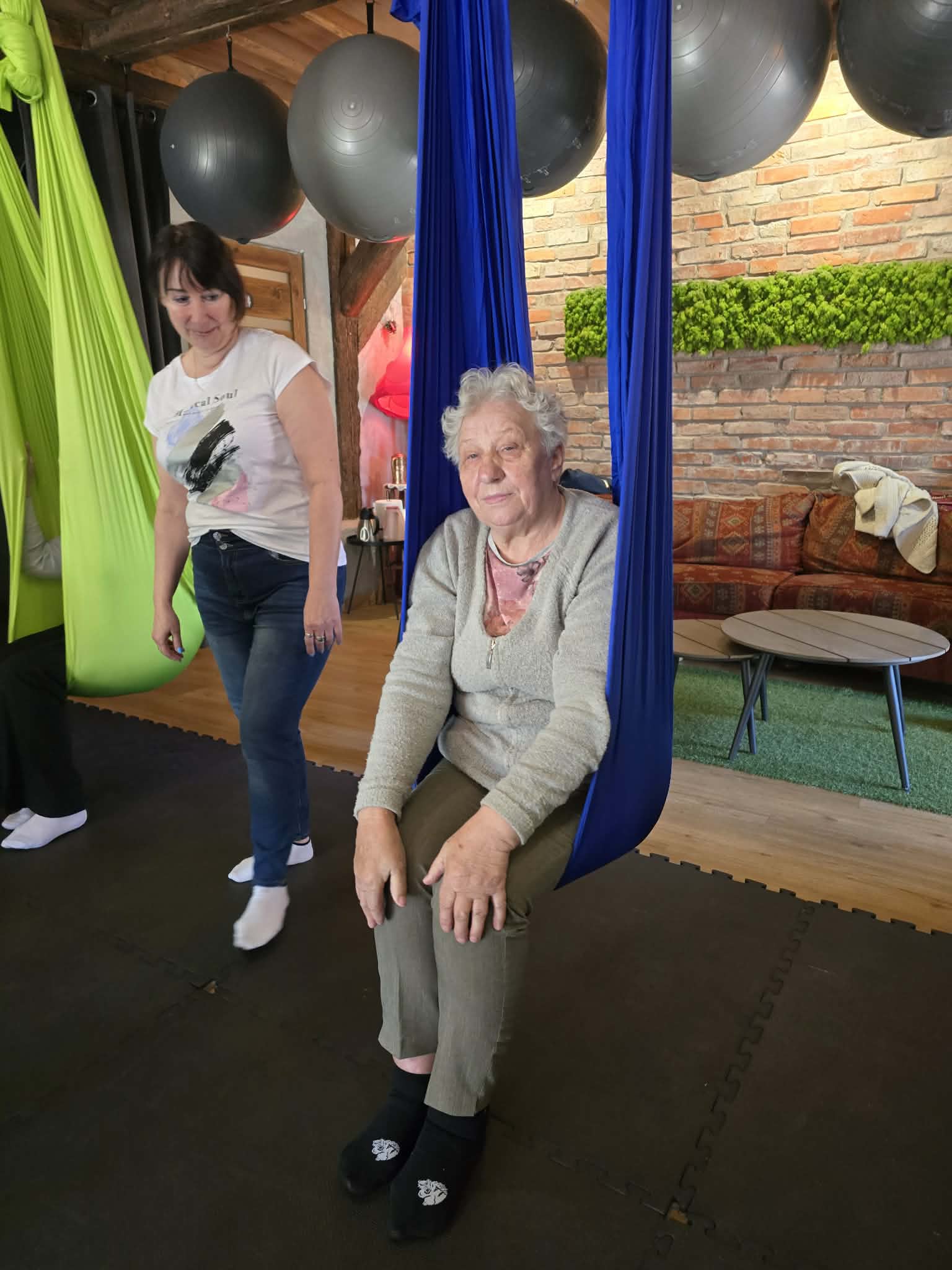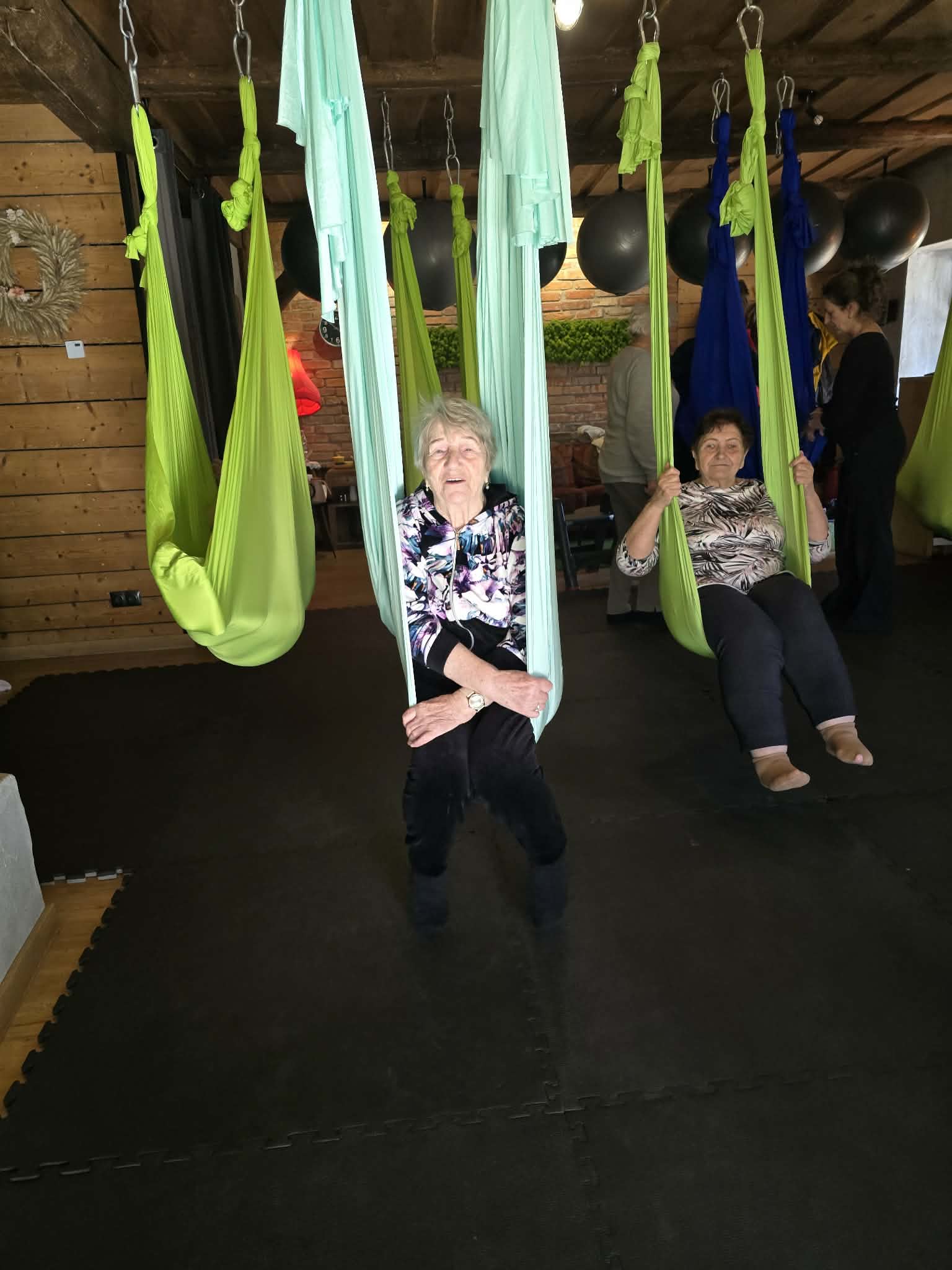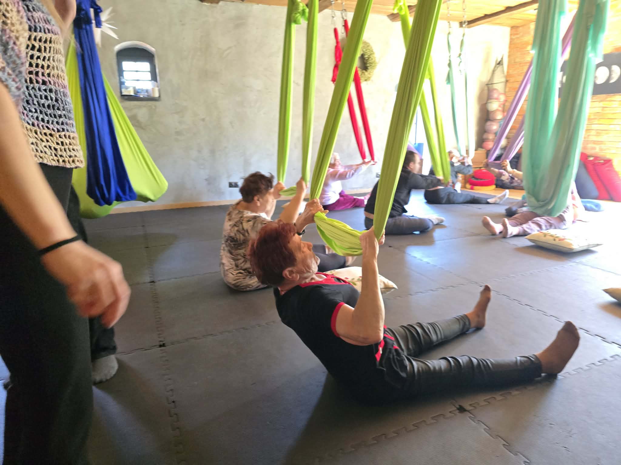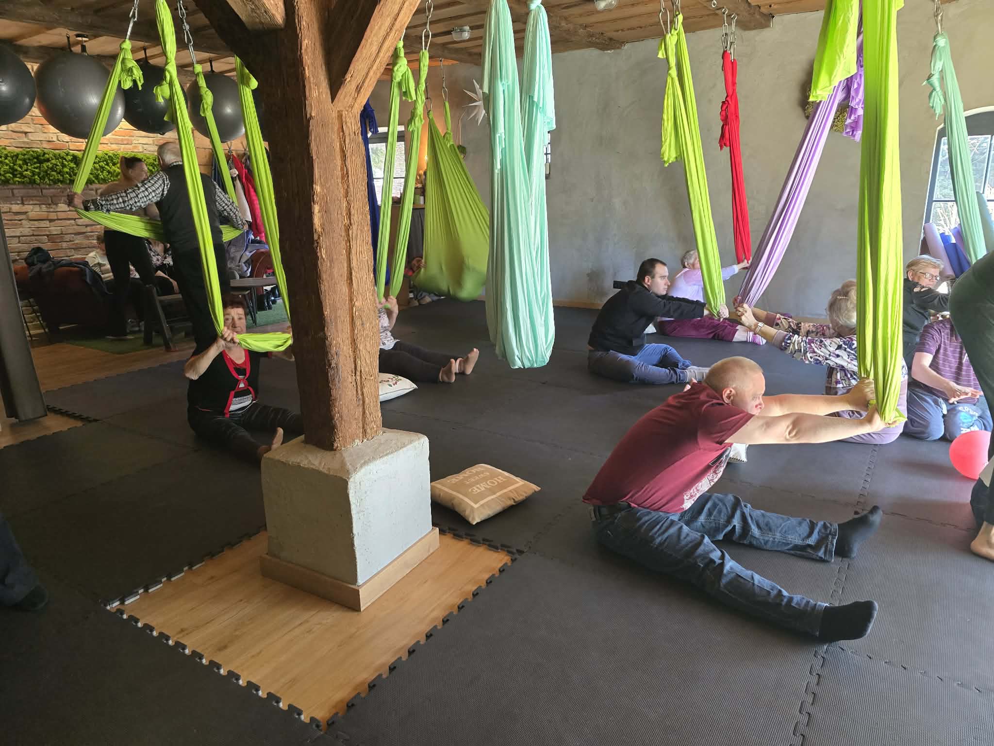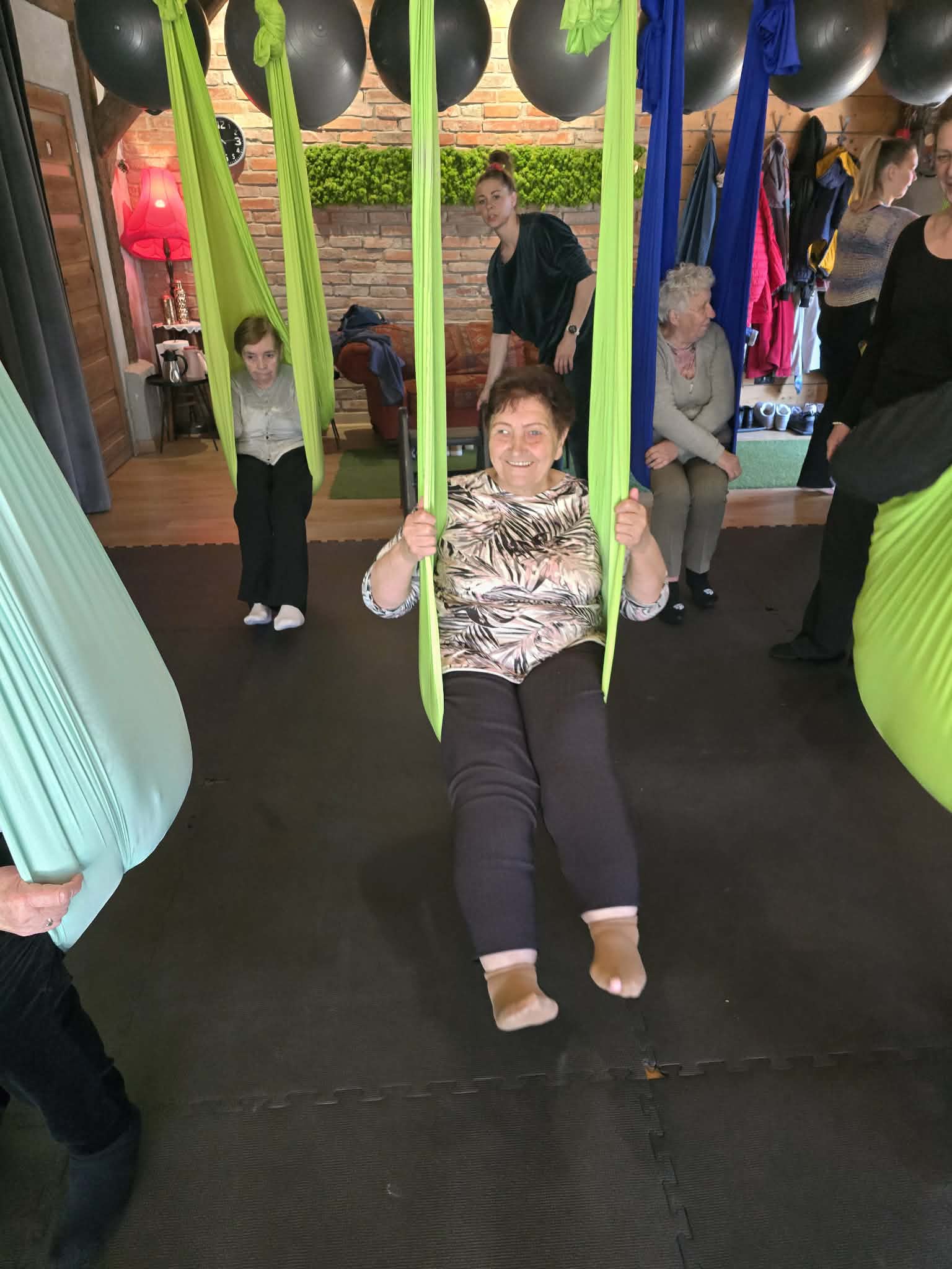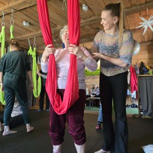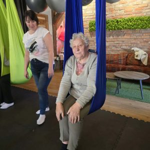 Ćwiczenia odbywały się z wykorzystaniem specjalnych hamaków zawieszonych pod sufitem, co pozwoliło uczestnikom na bezpieczne wykonywanie prostych pozycji, rozciąganie ciała oraz poprawę równowagi i koordynacji. Atmosfera była przyjazna i wspierająca, a niezawodne instruktorki, Monika, Sylwia i Kasia dostosowywały poziom trudności do możliwości każdej osoby.