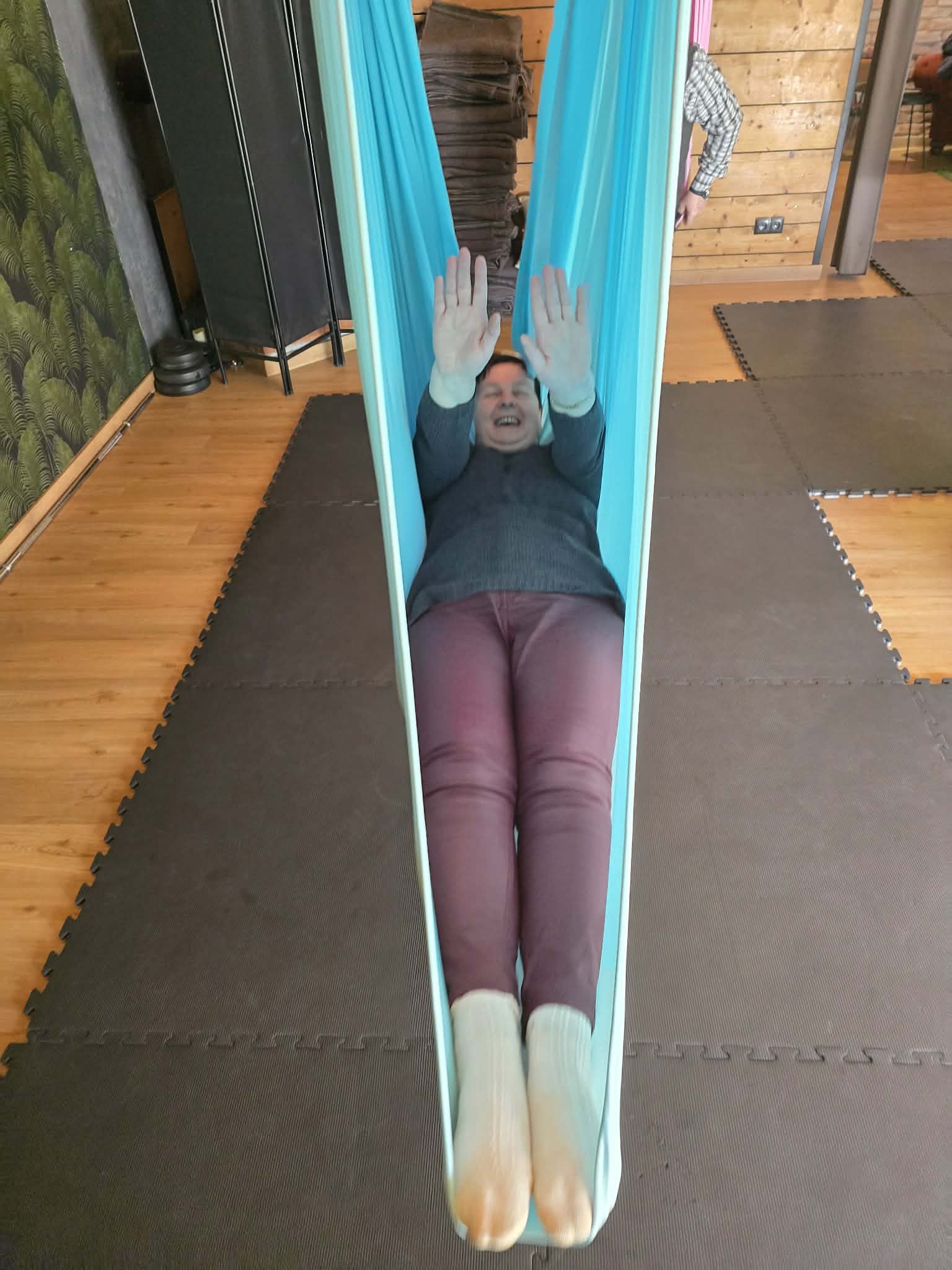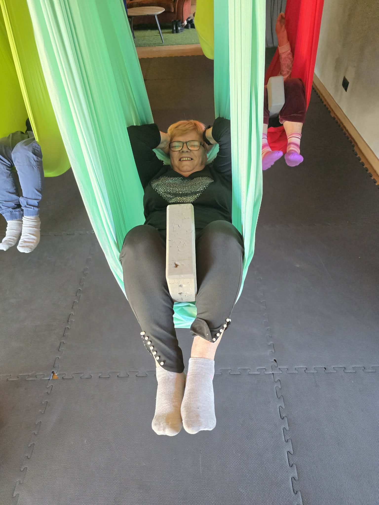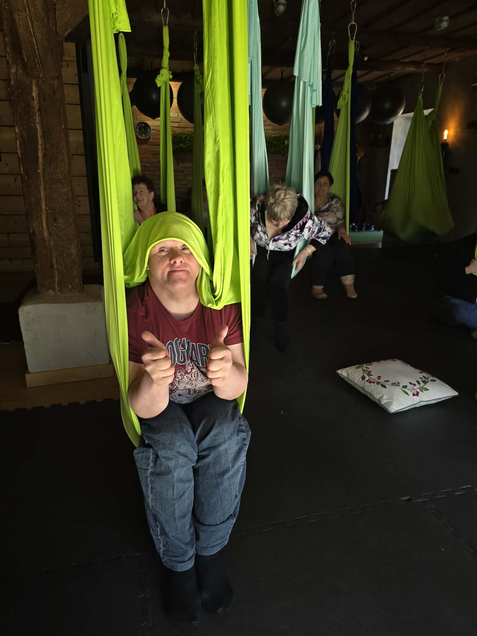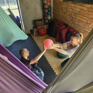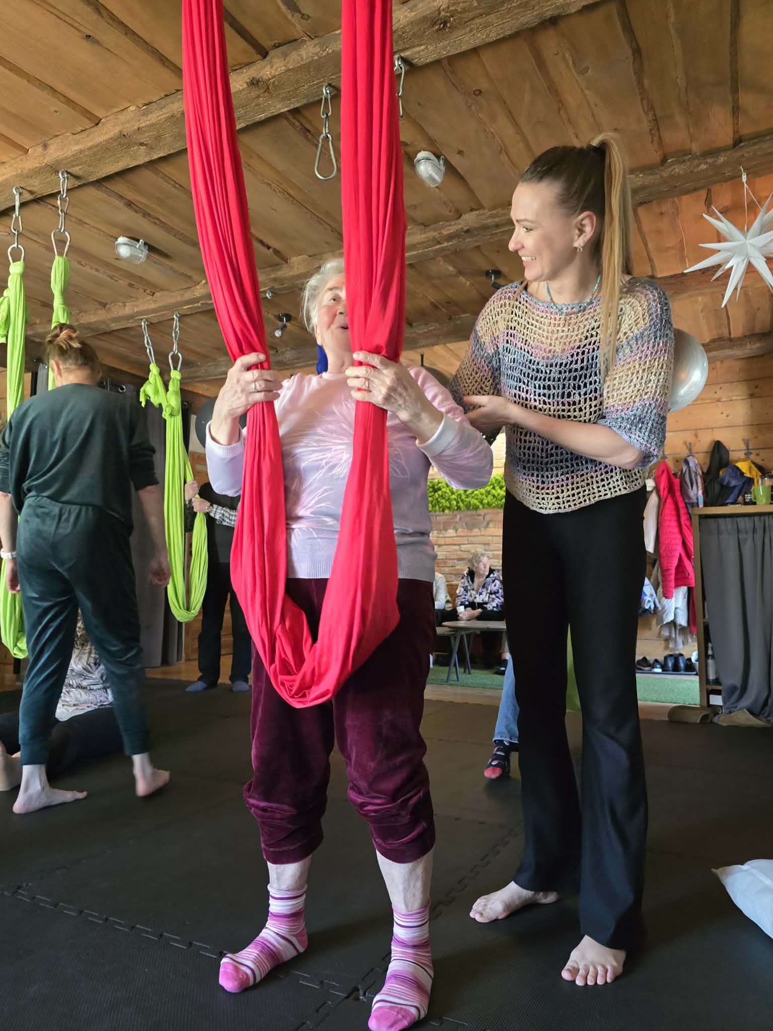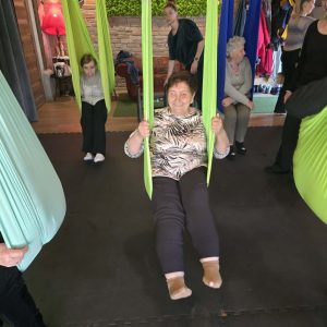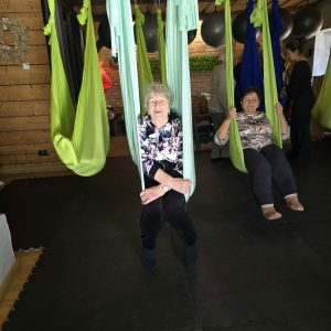 Ćwiczenia odbywały się z wykorzystaniem specjalnych hamaków zawieszonych pod sufitem, co pozwoliło uczestnikom na bezpieczne wykonywanie prostych pozycji, rozciąganie ciała oraz poprawę równowagi i koordynacji. Atmosfera była przyjazna i wspierająca, a niezawodne instruktorki, Monika, Sylwia i Kasia dostosowywały poziom trudności do możliwości każdej osoby.