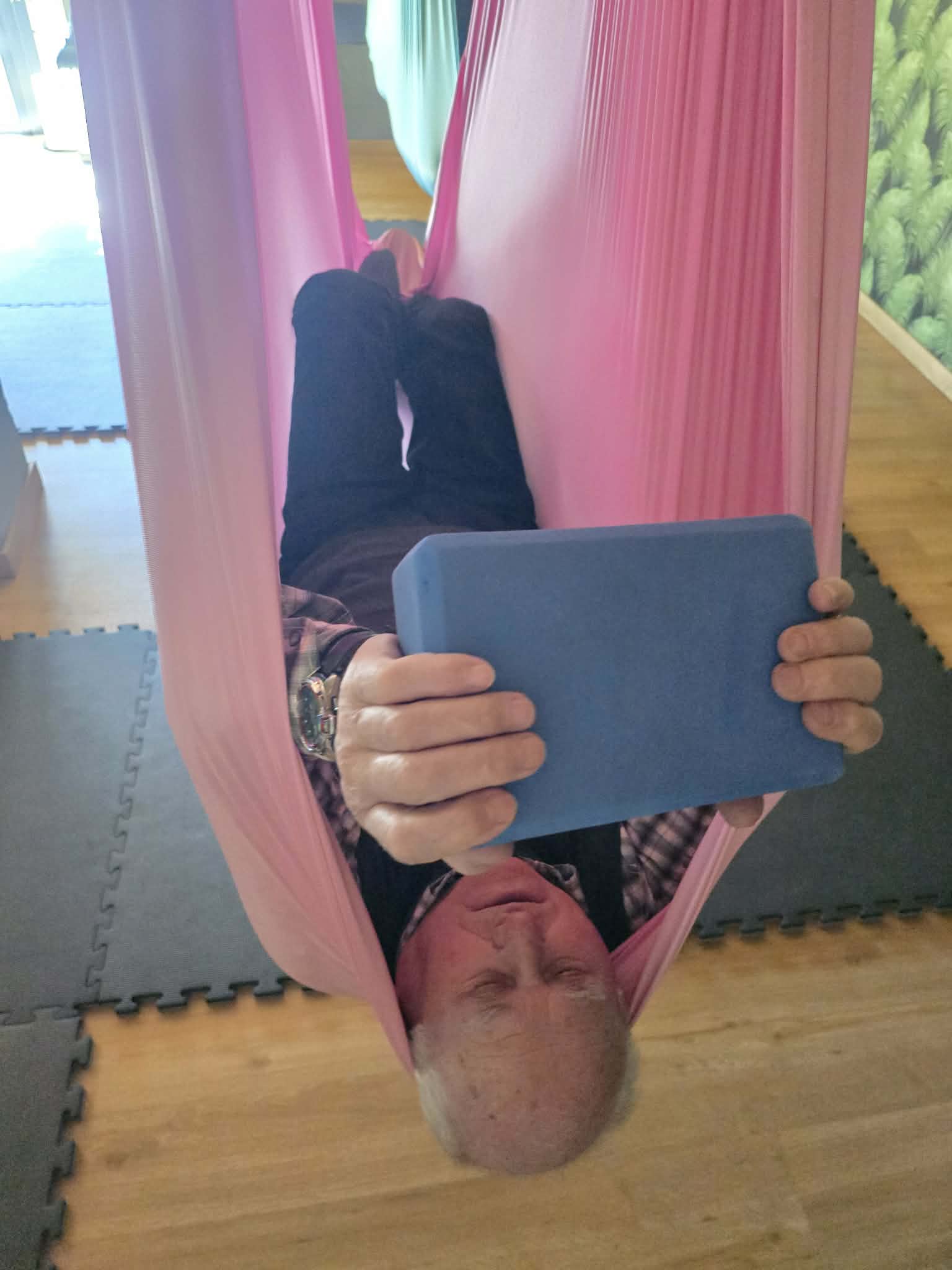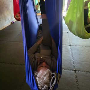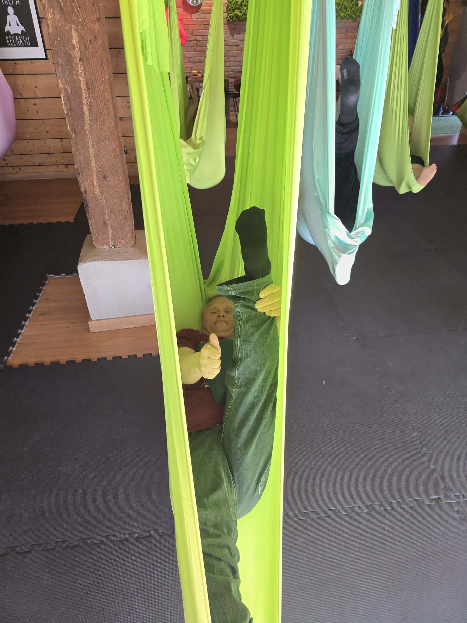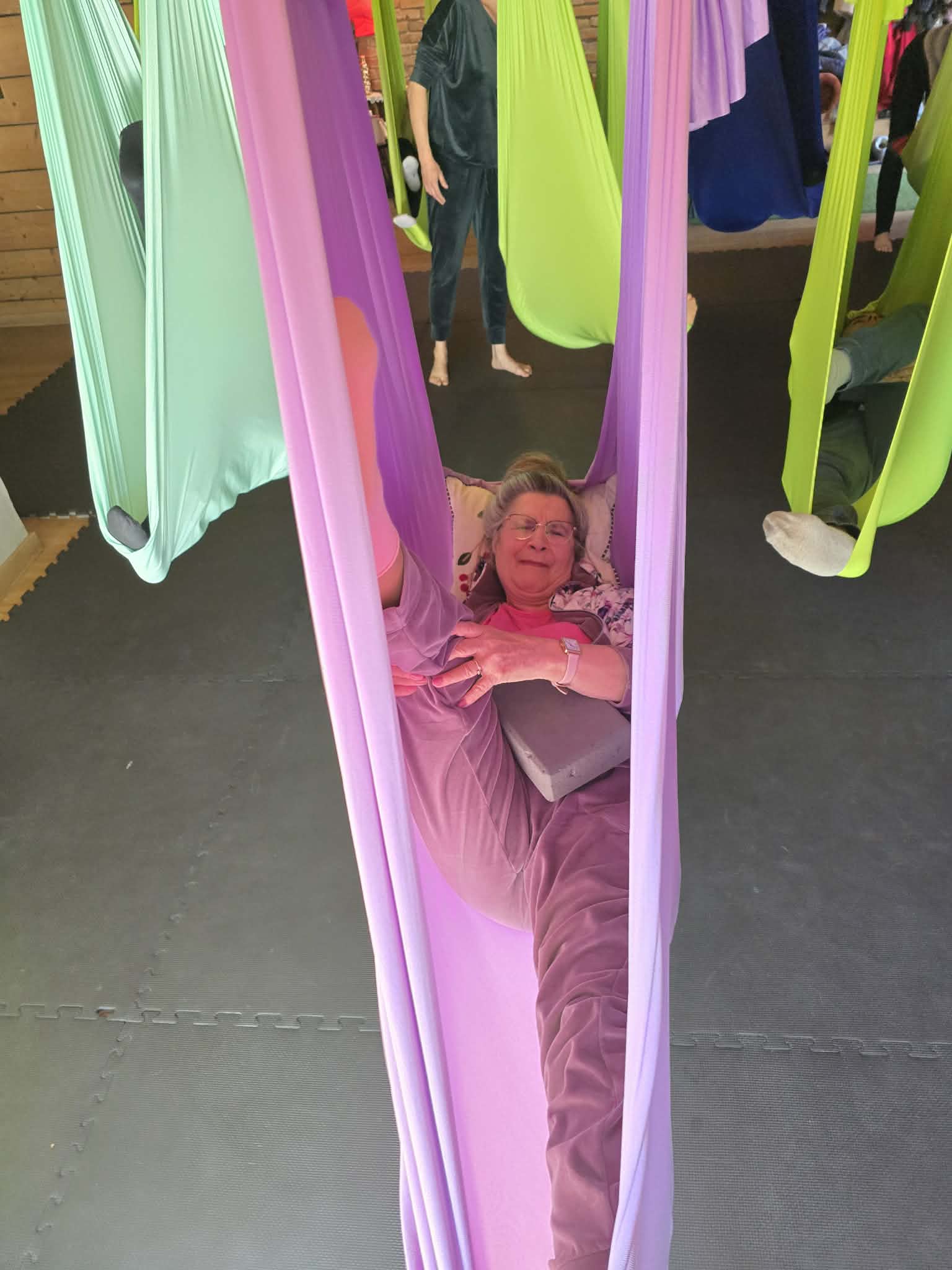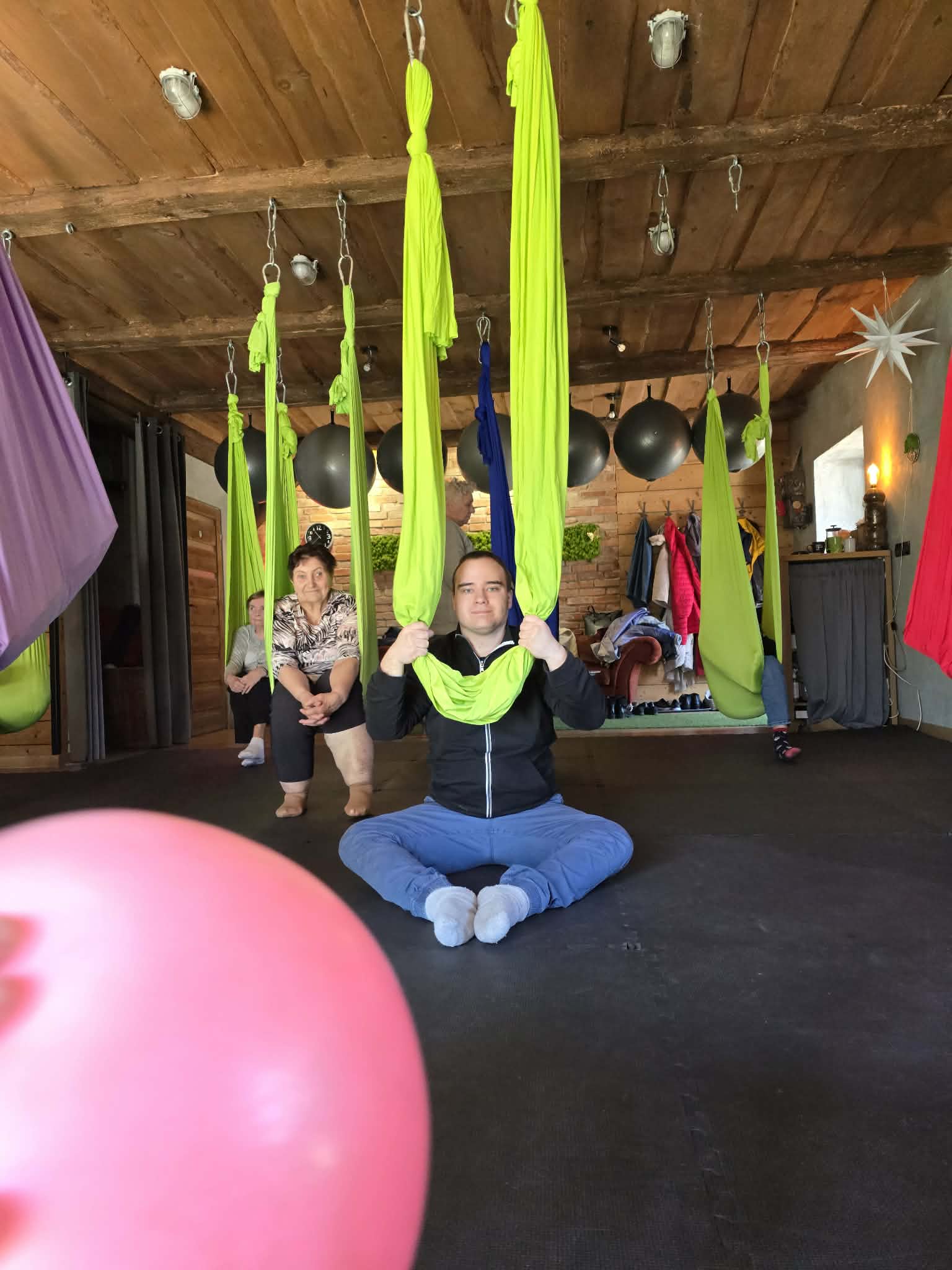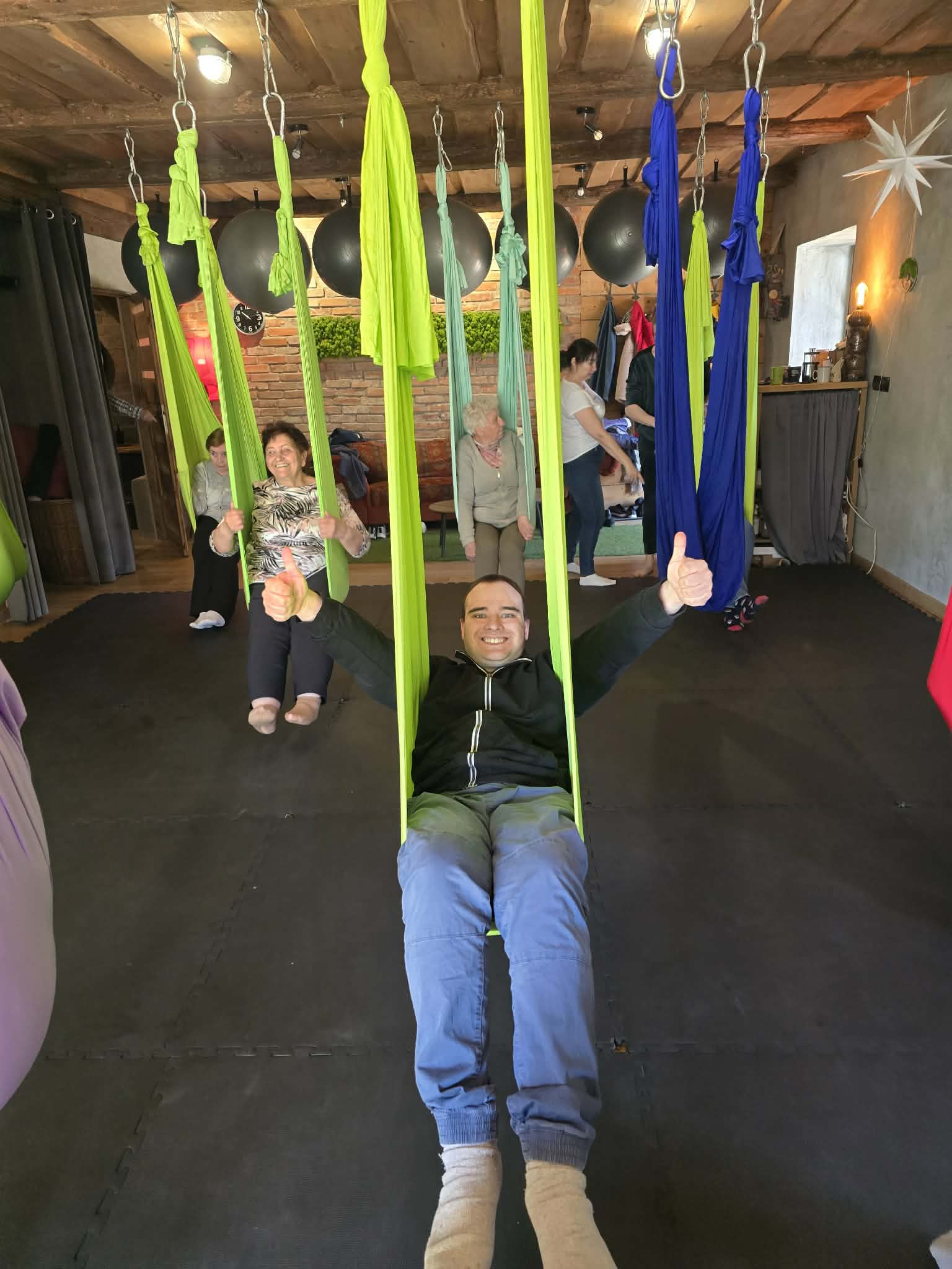 Ćwiczenia odbywały się z wykorzystaniem specjalnych hamaków zawieszonych pod sufitem, co pozwoliło uczestnikom na bezpieczne wykonywanie prostych pozycji, rozciąganie ciała oraz poprawę równowagi i koordynacji. Atmosfera była przyjazna i wspierająca, a niezawodne instruktorki, Monika, Sylwia i Kasia dostosowywały poziom trudności do możliwości każdej osoby.