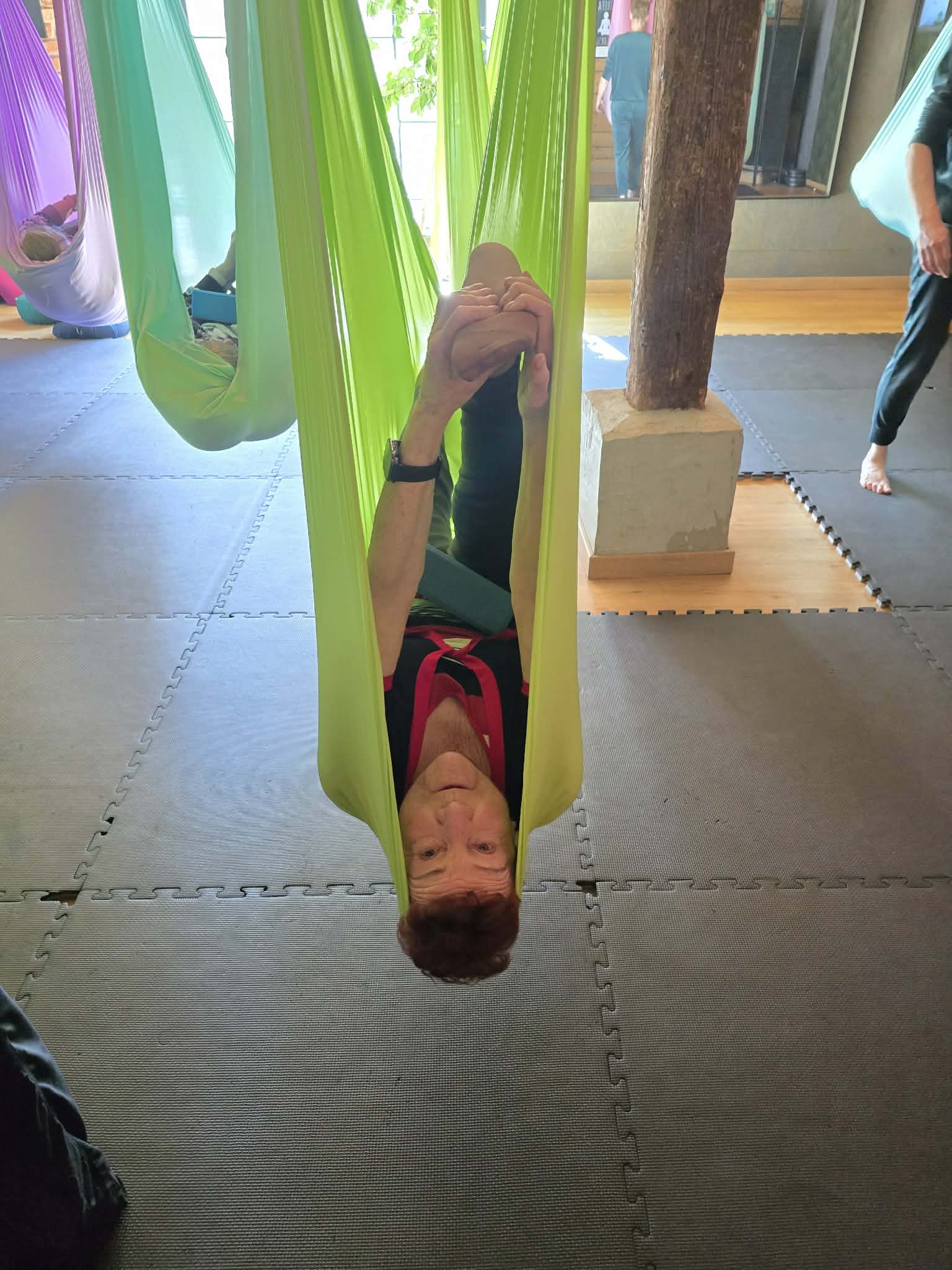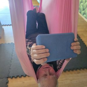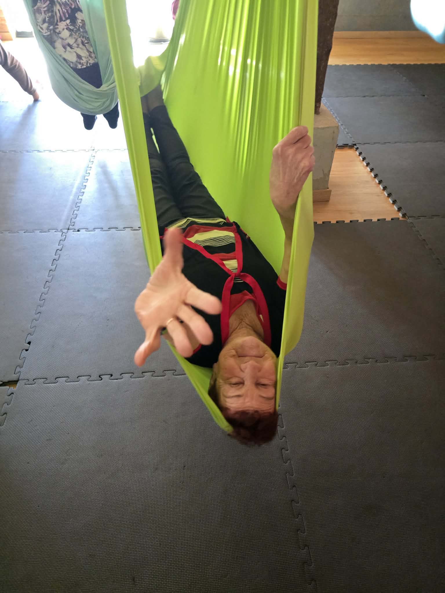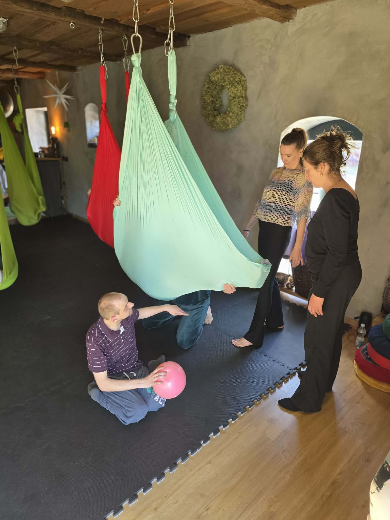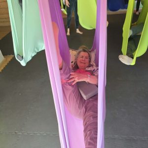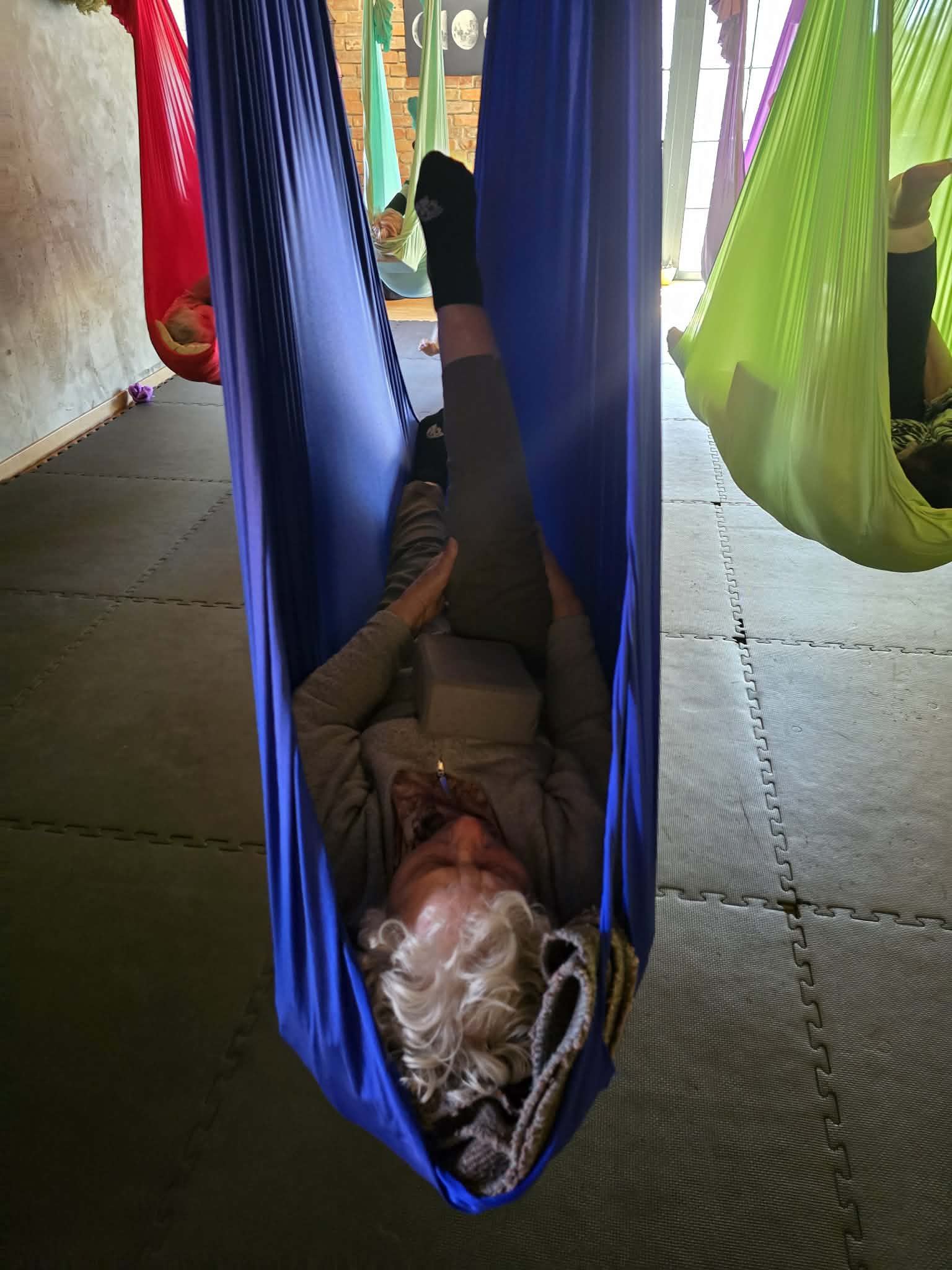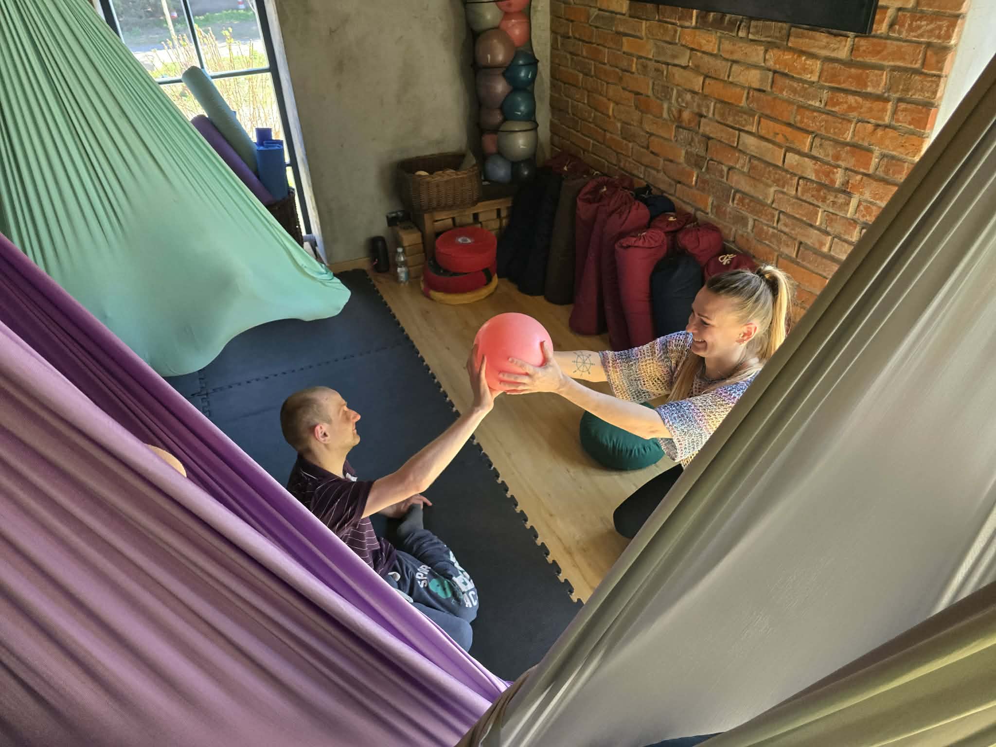 Ćwiczenia odbywały się z wykorzystaniem specjalnych hamaków zawieszonych pod sufitem, co pozwoliło uczestnikom na bezpieczne wykonywanie prostych pozycji, rozciąganie ciała oraz poprawę równowagi i koordynacji. Atmosfera była przyjazna i wspierająca, a niezawodne instruktorki, Monika, Sylwia i Kasia dostosowywały poziom trudności do możliwości każdej osoby.